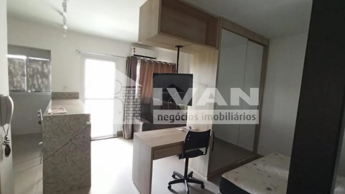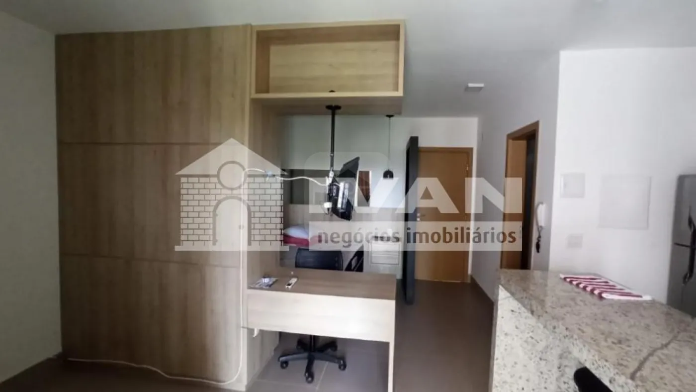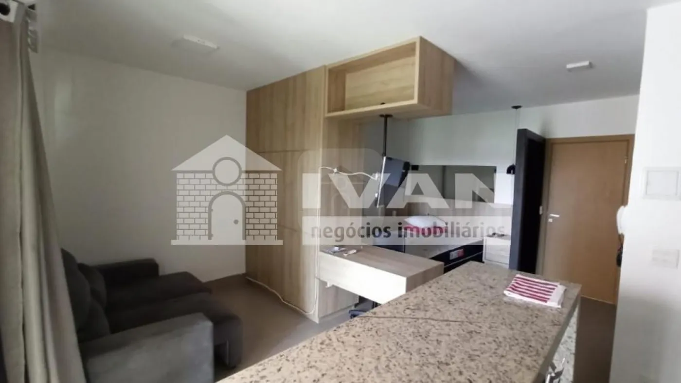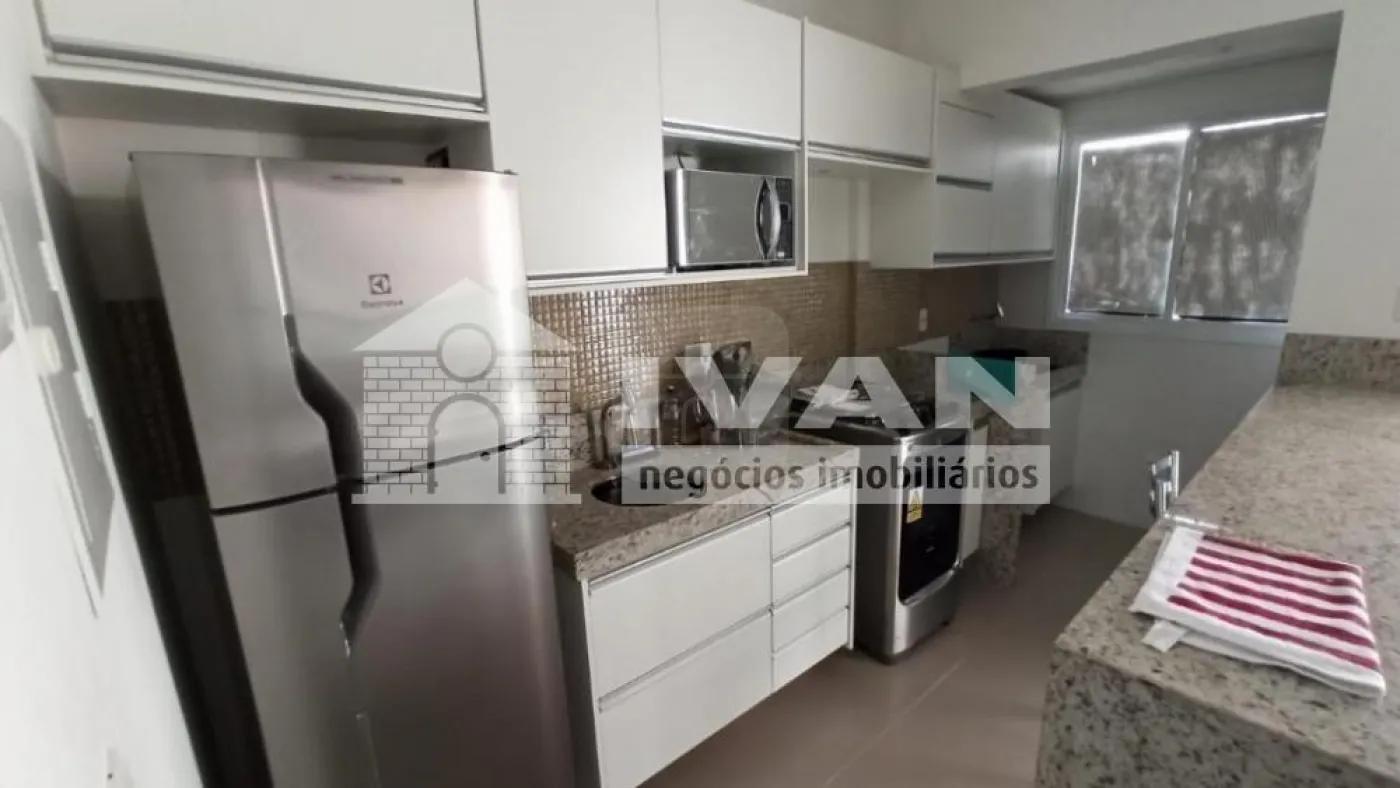 Flat mobiliado com 01 quarto com sacada, suíte com armário sob pia e espelho, cama, armário, TV e ar condicionado, cozinha estilo americana com bancada, fogão, geladeira e micro-ondas conjugada com área de serviço, 01 vaga de garagem, cond. com portaria 24hs, piscina, espaço gourmet com churrasqueira, academia, sala de estudos e mini empório.
