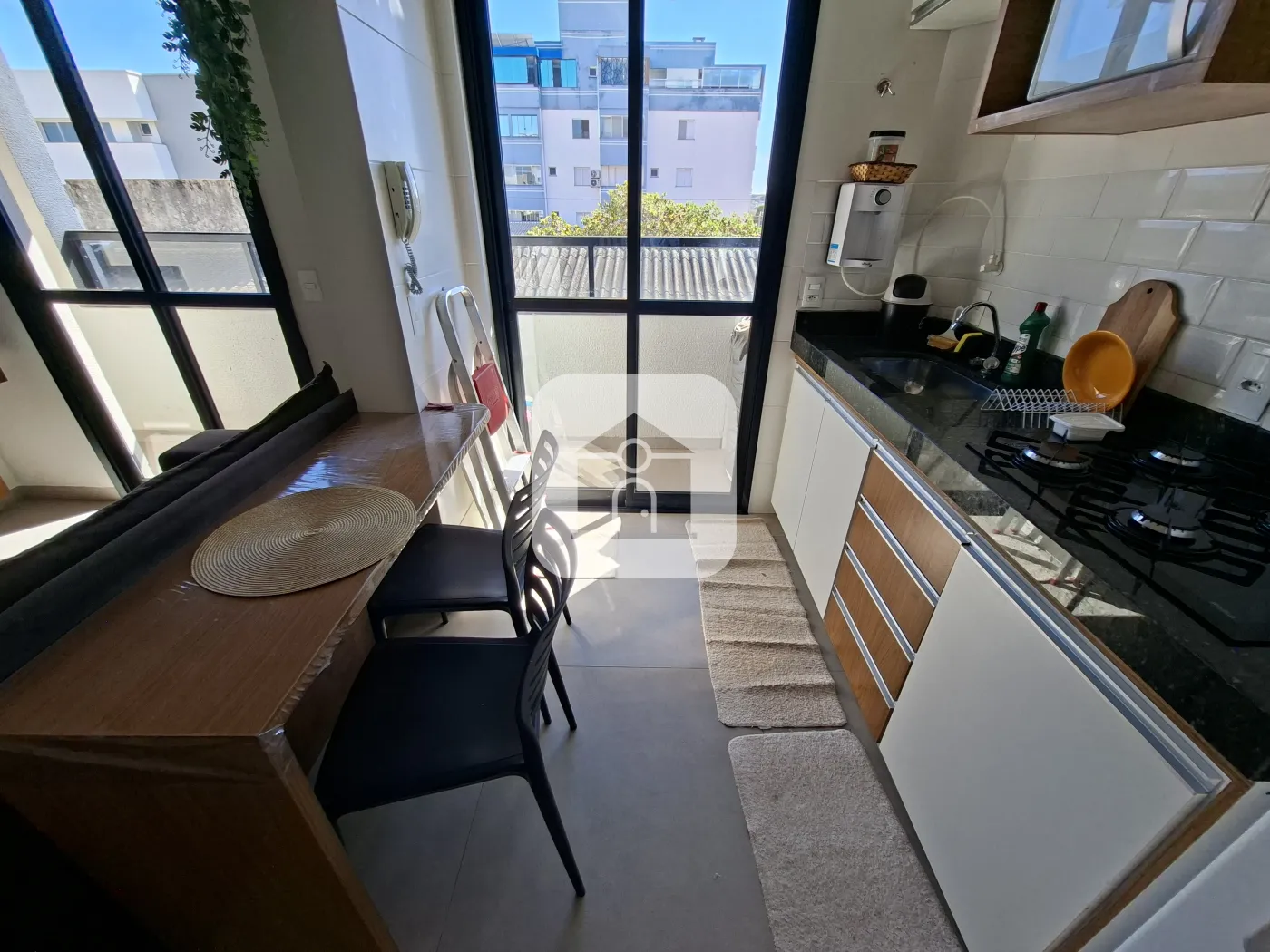 Apartamento novo totalmente mobiliado portão e porteiro eletrônico, 01 vaga de garagem sala com painel embutido e rack, tv e sofá 2 lugares, sacada com mesa em granito. Cozinha conjugada com mesa em madeira, planejada com armários, cooktop, Sugar, micro-ondas, purificador soft e geladeira Frost Fere. Área de serviço separada na sacada com máquina de lavar 8kg. Hall para 02 quartos com armários sendo 01 quarto com sacada e cama de solteiro e 1 suíte com armário