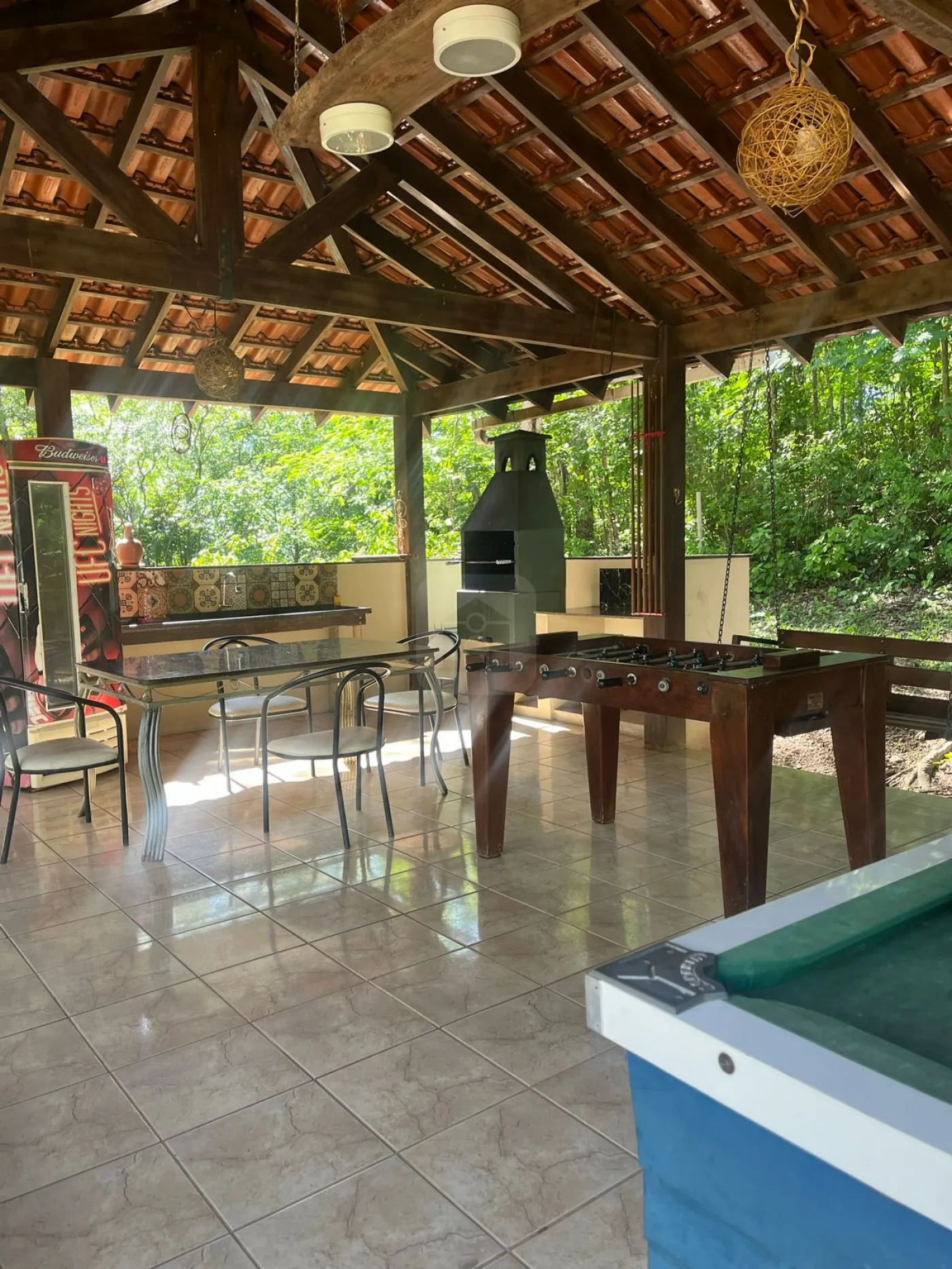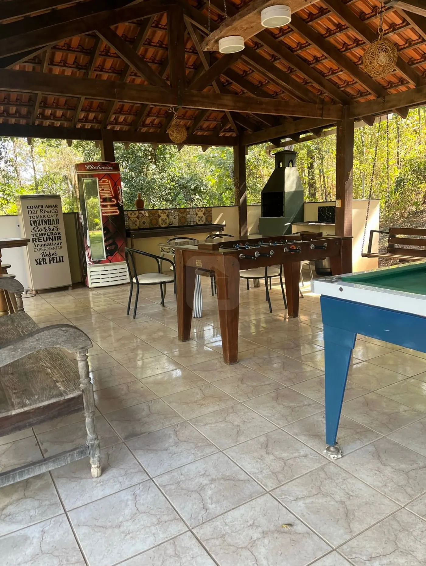 Quiosque de recreação com churrasqueira e pia, com mesa de sinuca, pebolim, geladeiras, freezer e mobília;