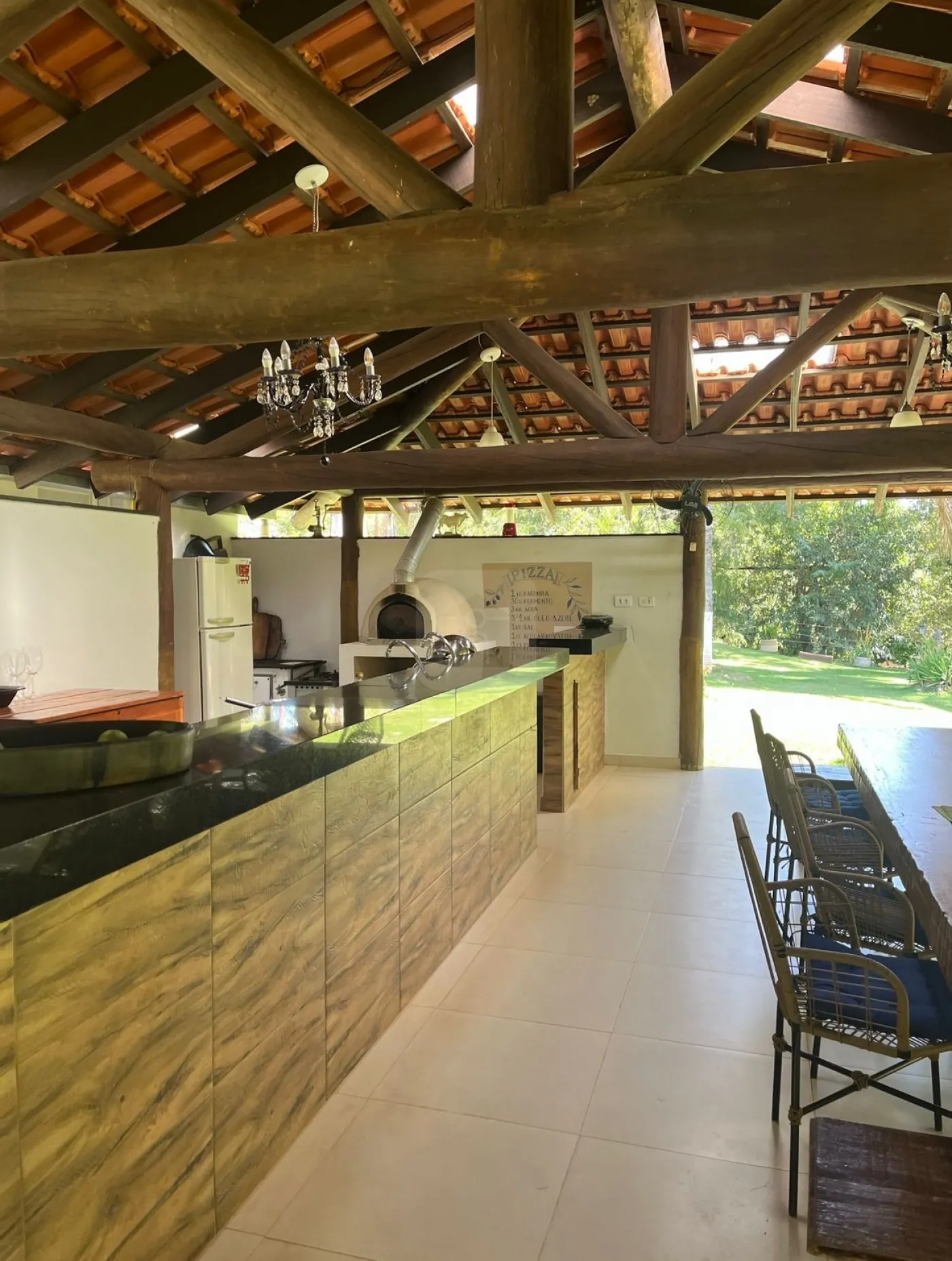 Quiosque de cozinha com despensa, fogão a lenha, tradicional e forno de pizza, com utensílios completos e mobiliário de cozinha;