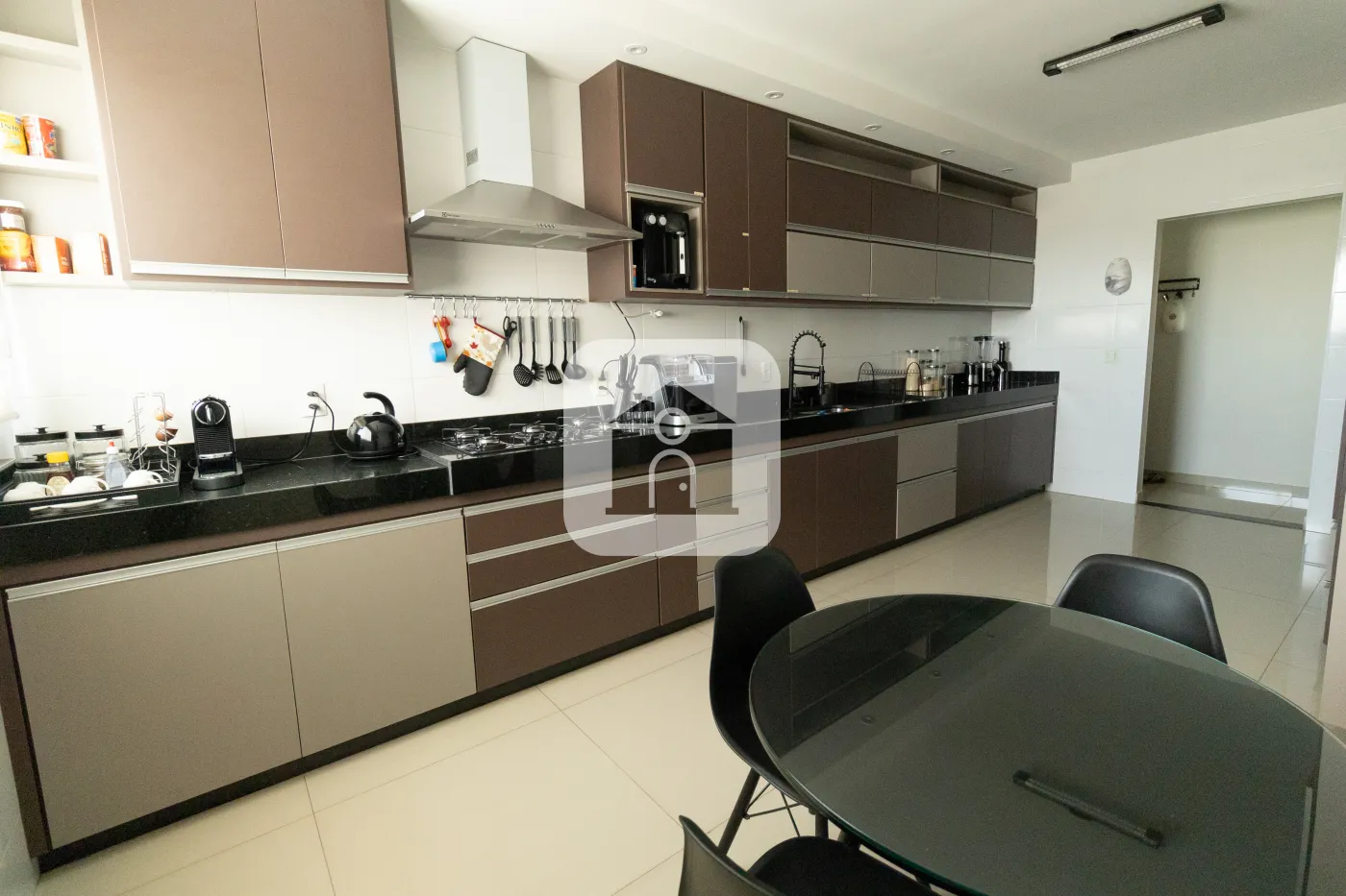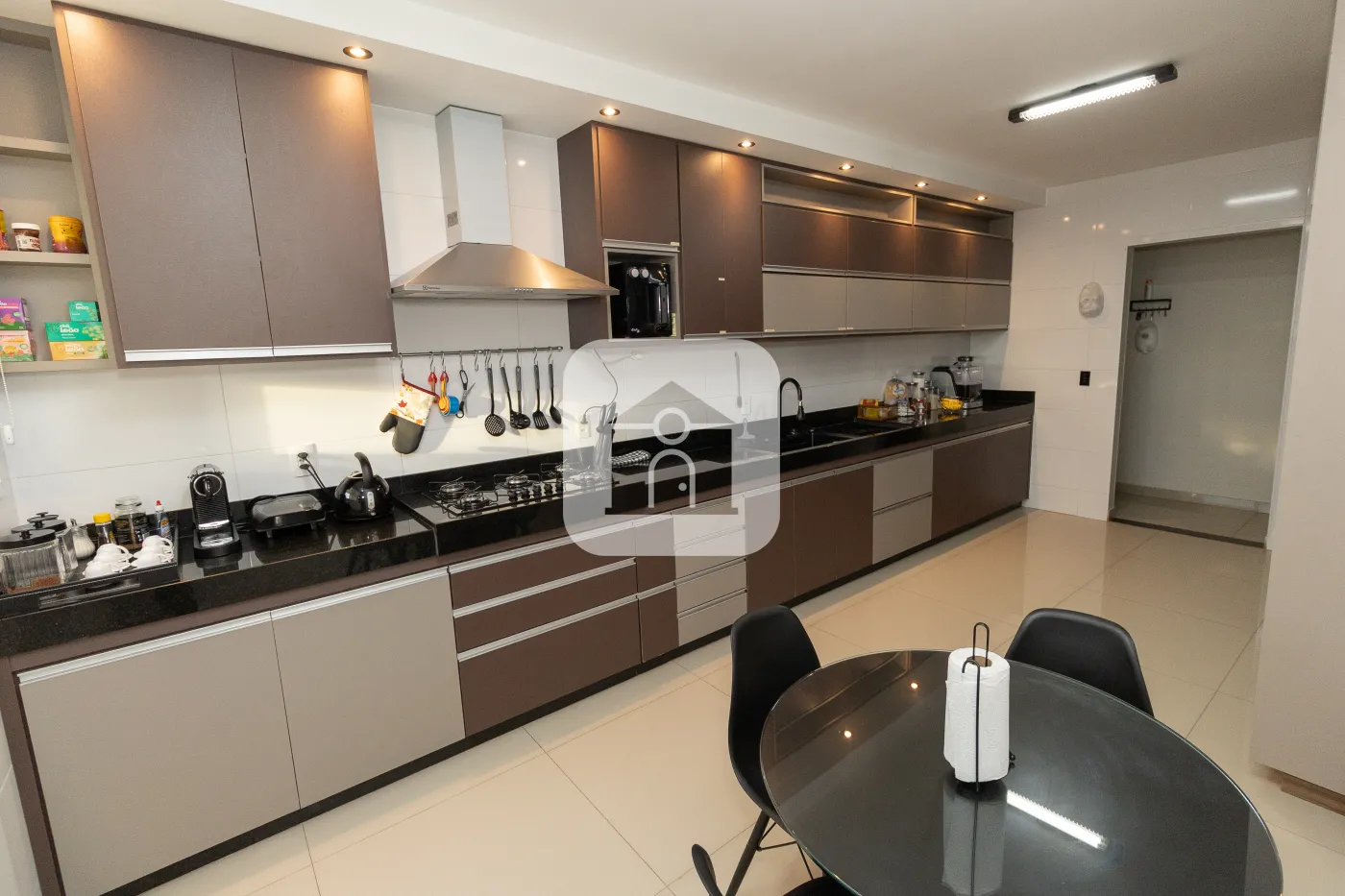 Cozinha extremamente espaçosa, toda equipada com armários, cooktop e coifa.