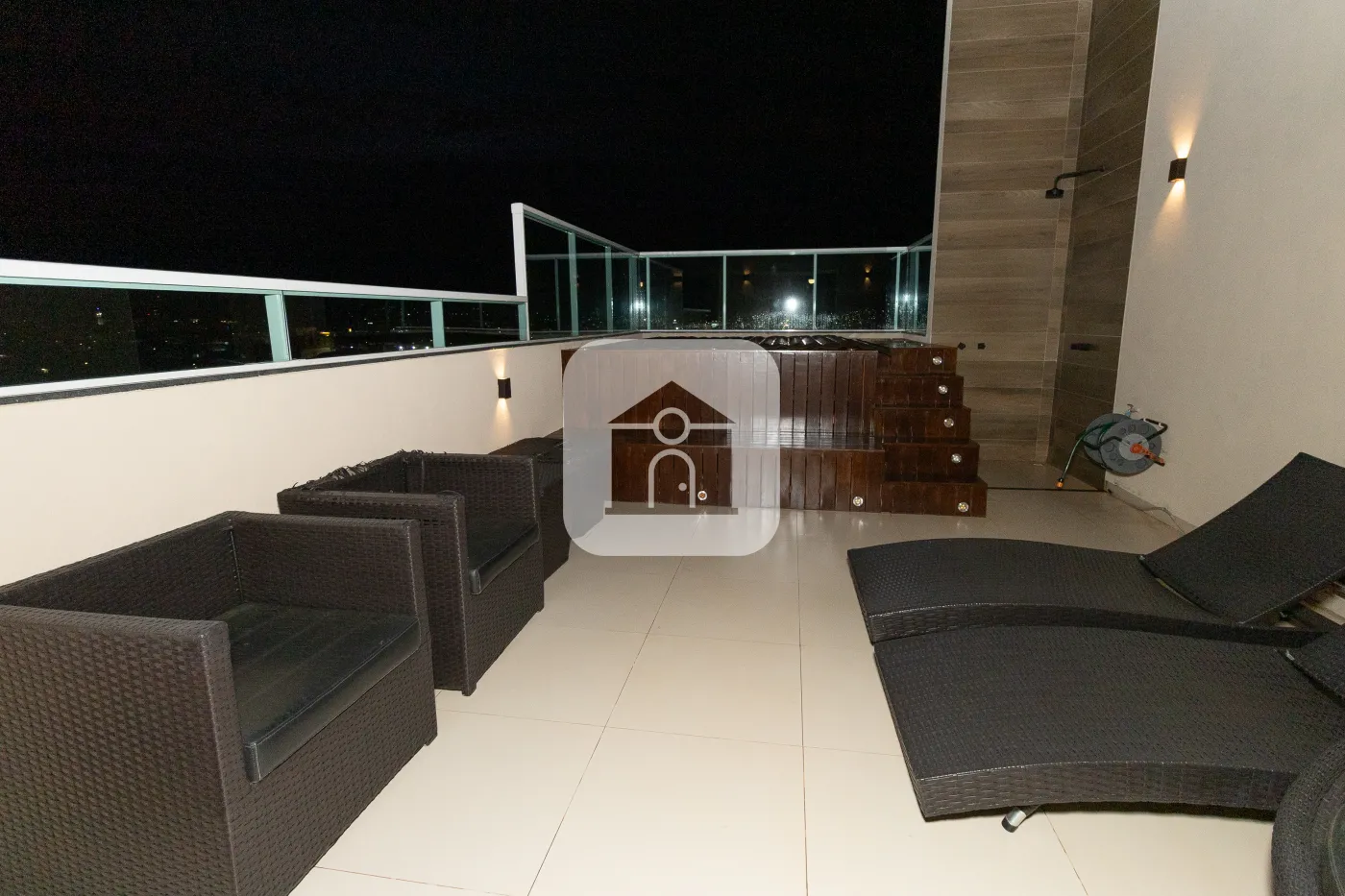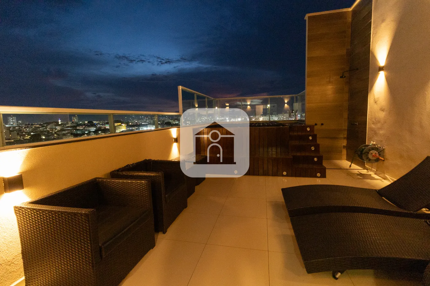 Área externa aberta com Deck e uma maravilhosa vista da cidade. ?? Com ombrelone para cobertura flexível.