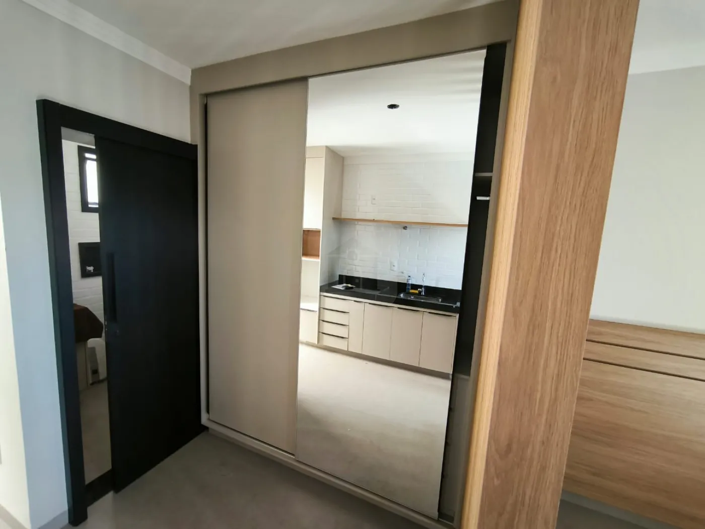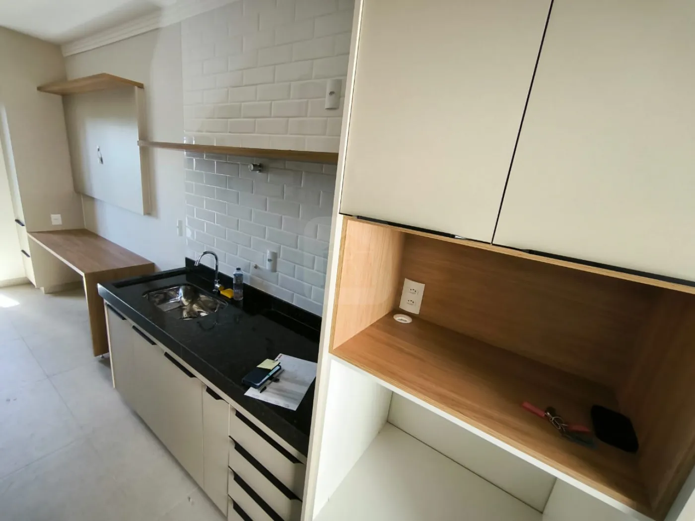 Todo planejado com armários na cozinha, armário embutido para o quarto, cabeceira embutida e escrivaninha, varanda, banheiro com armário embutido, espelho.