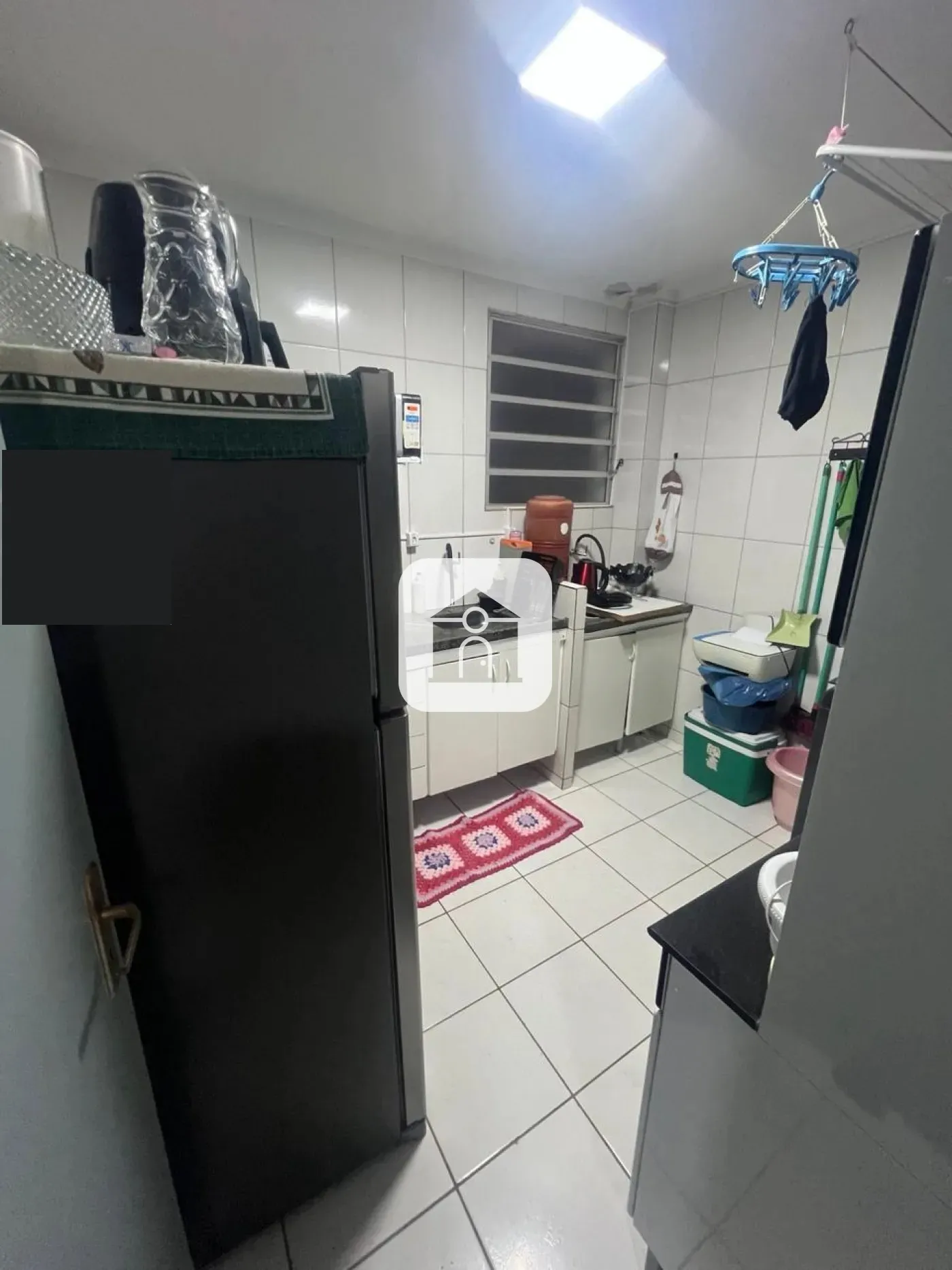 Lavanderia, sala e garagem coberta.