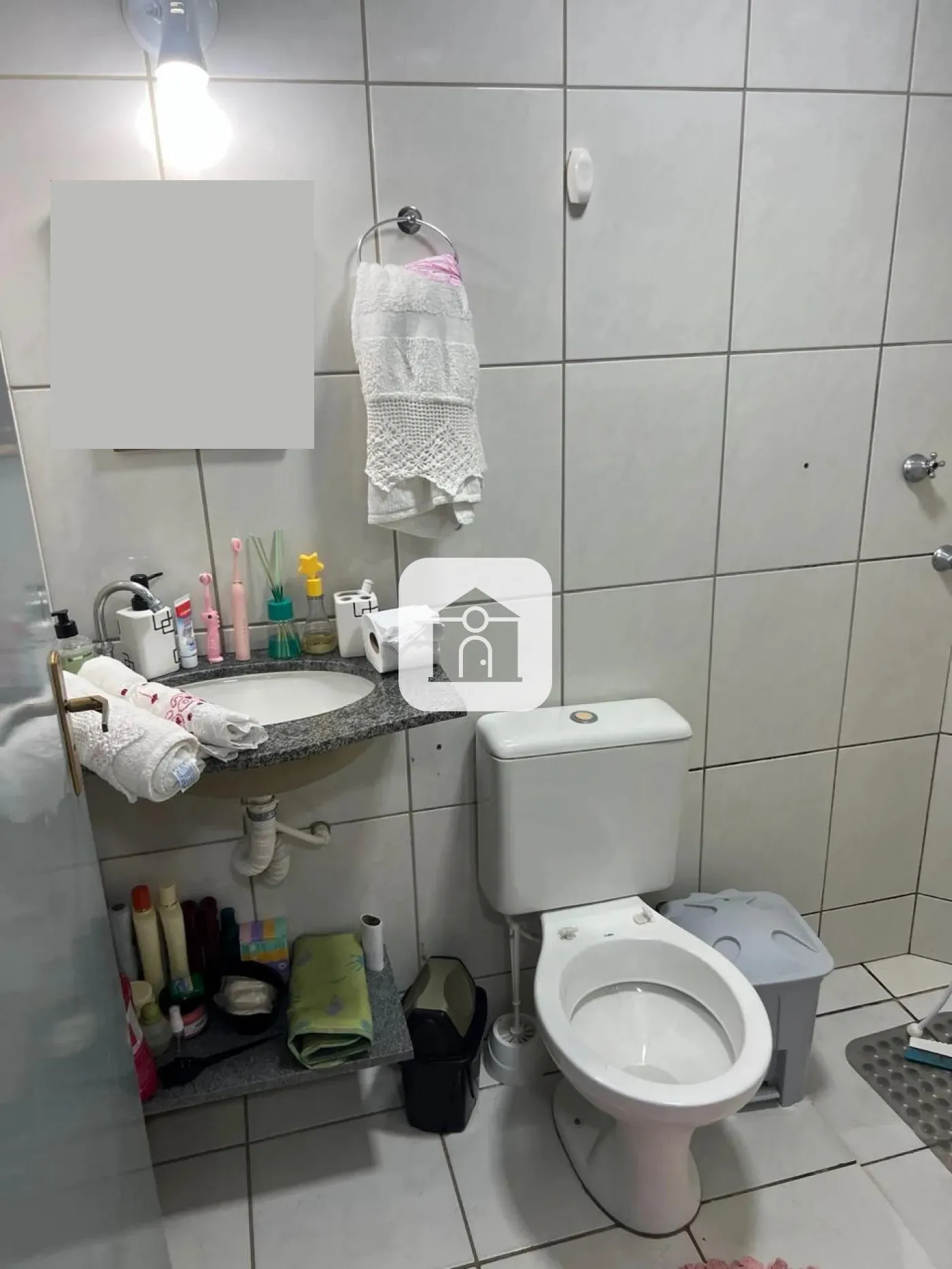 Banheiro social, cozinha com armários;