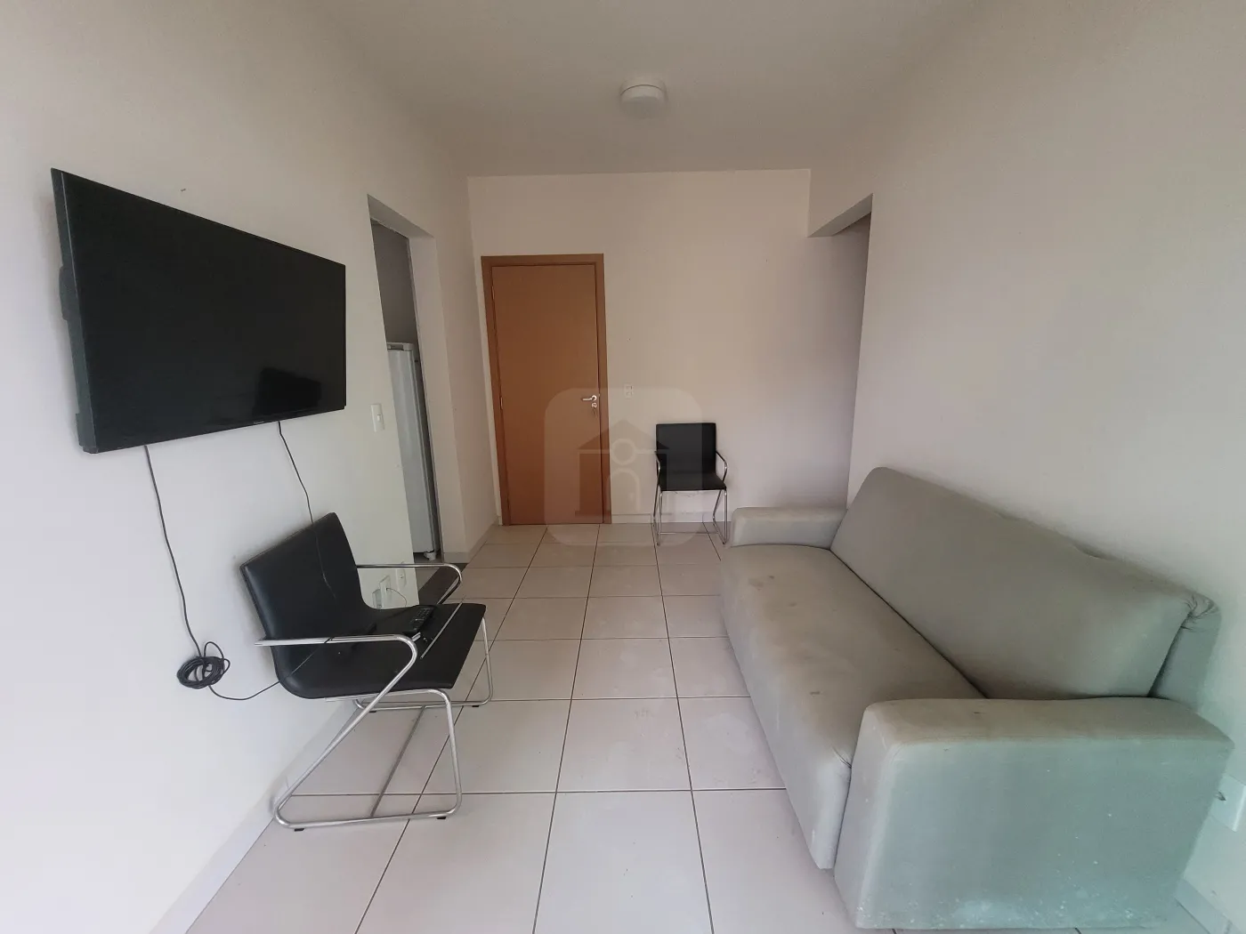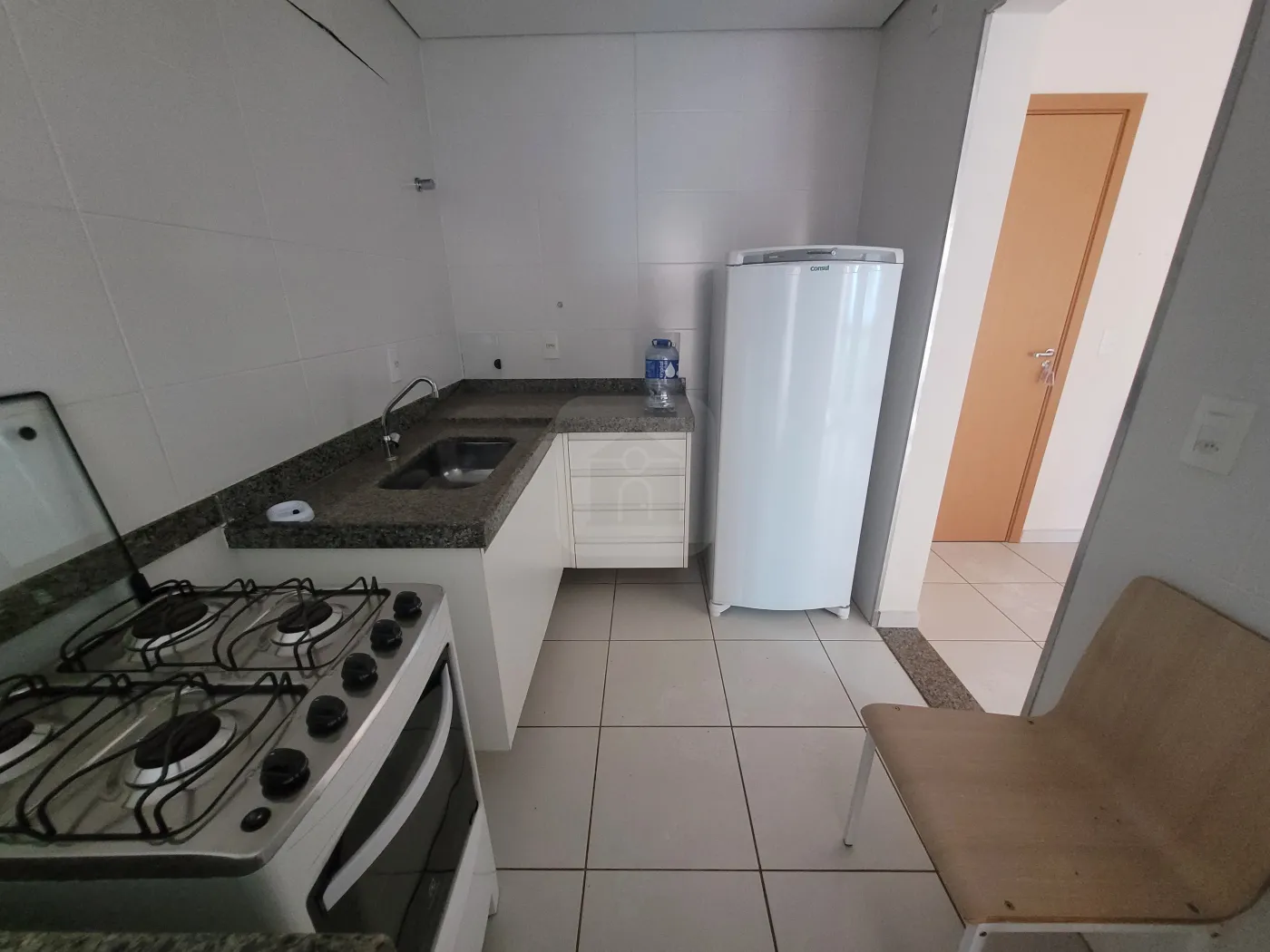 01 Quarto com armário (cama de casal), sala com sofá cama, banheiro social com box, chuveiro e armário sob a pia, cozinha com armários (geladeira,fogão),