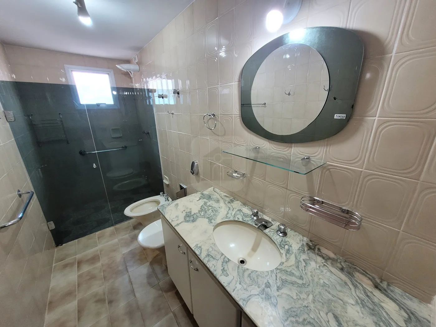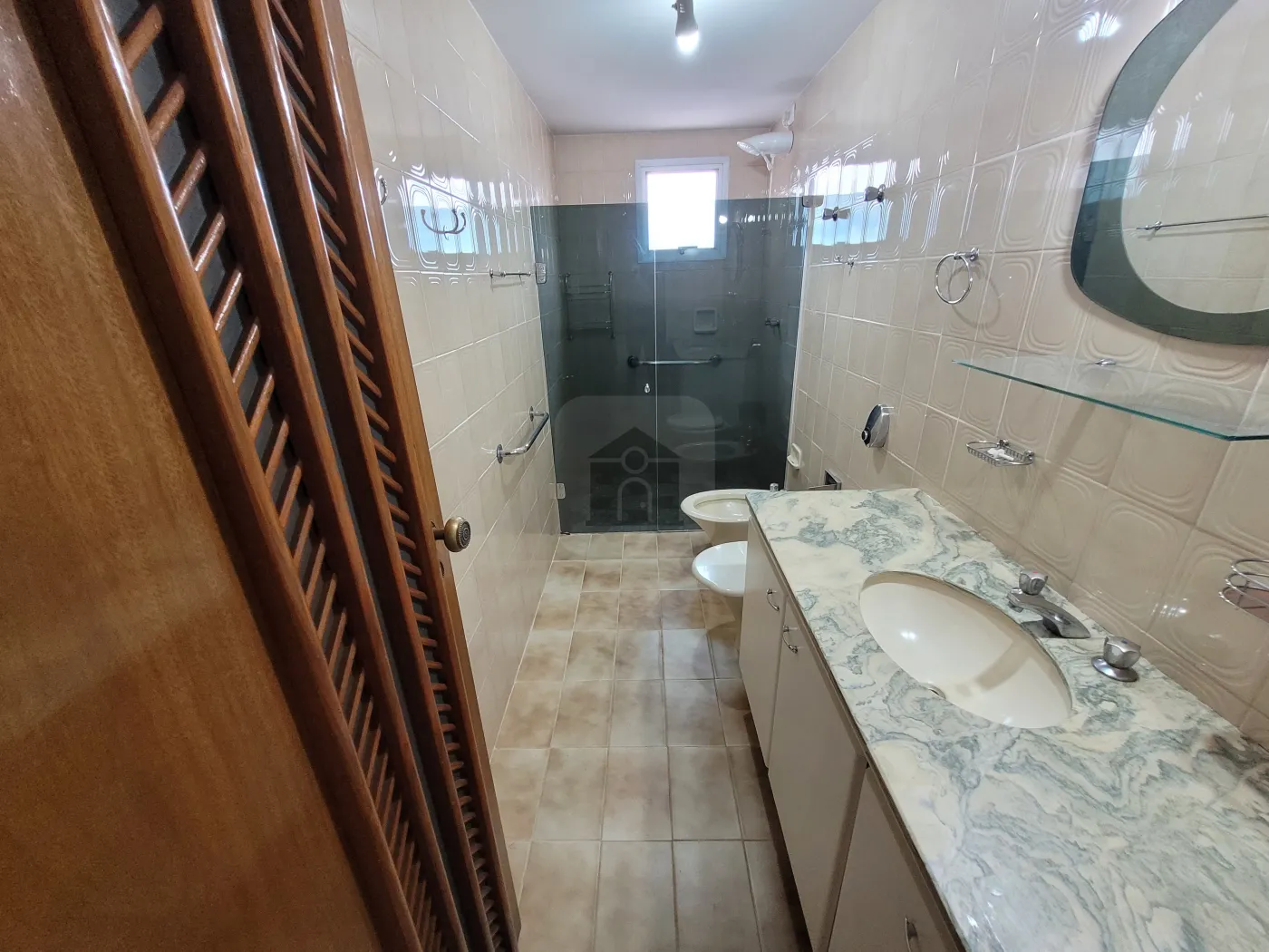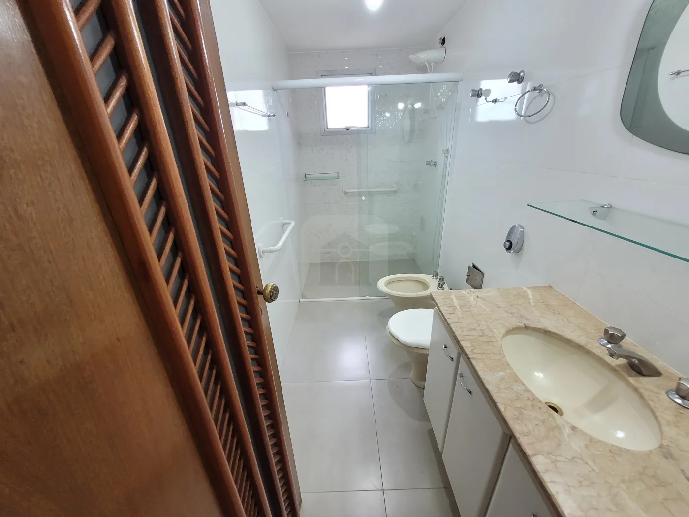 Banho social com box em vidro e armário sob pia, copa, cozinha com armário;
