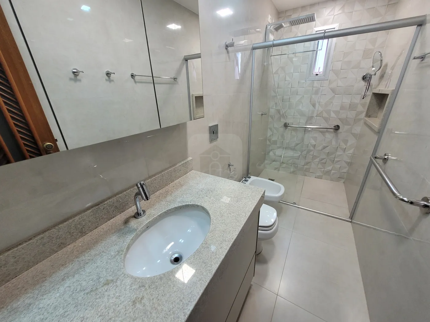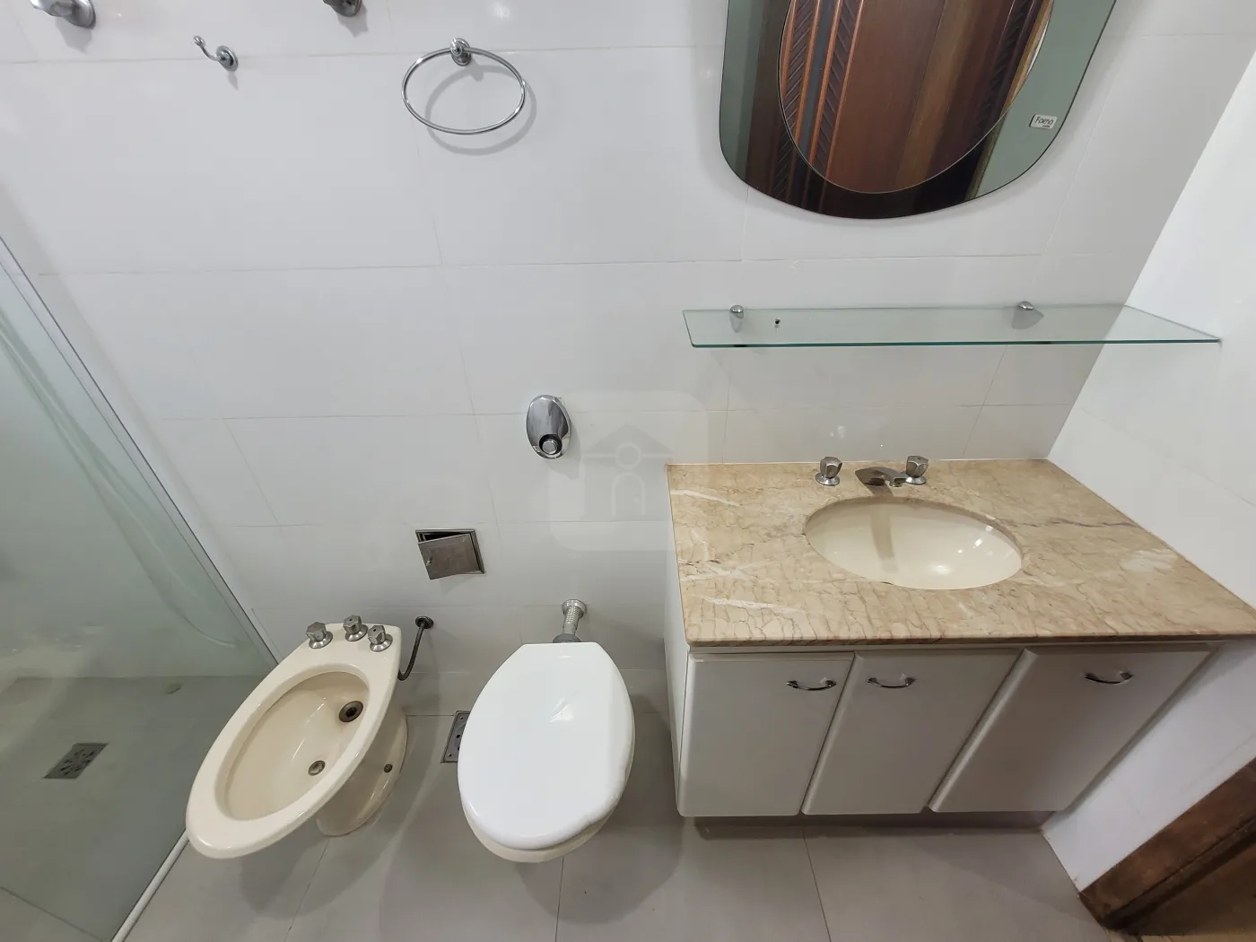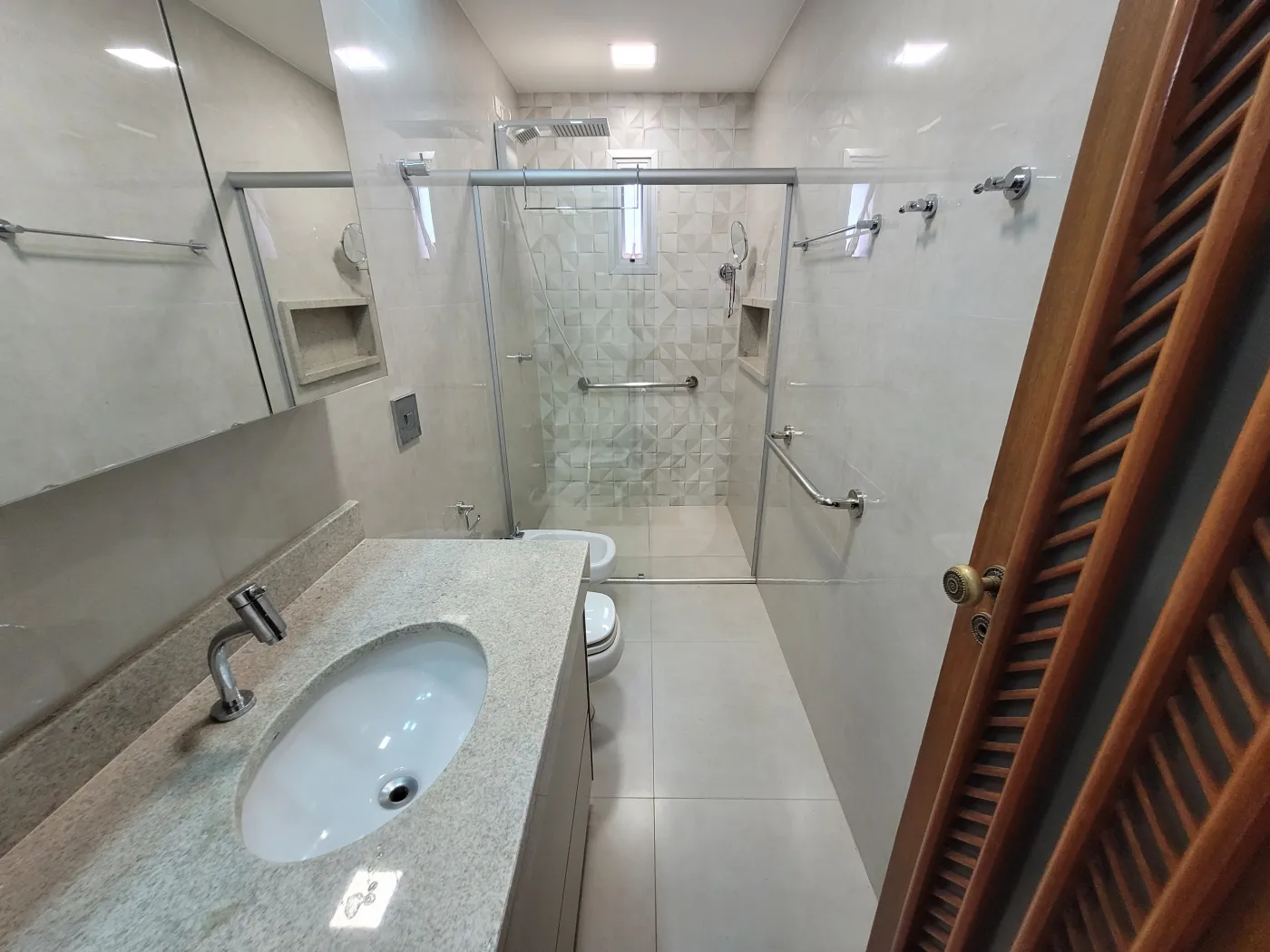 Banho social com box em vidro e armário sob pia, copa, cozinha com armário;