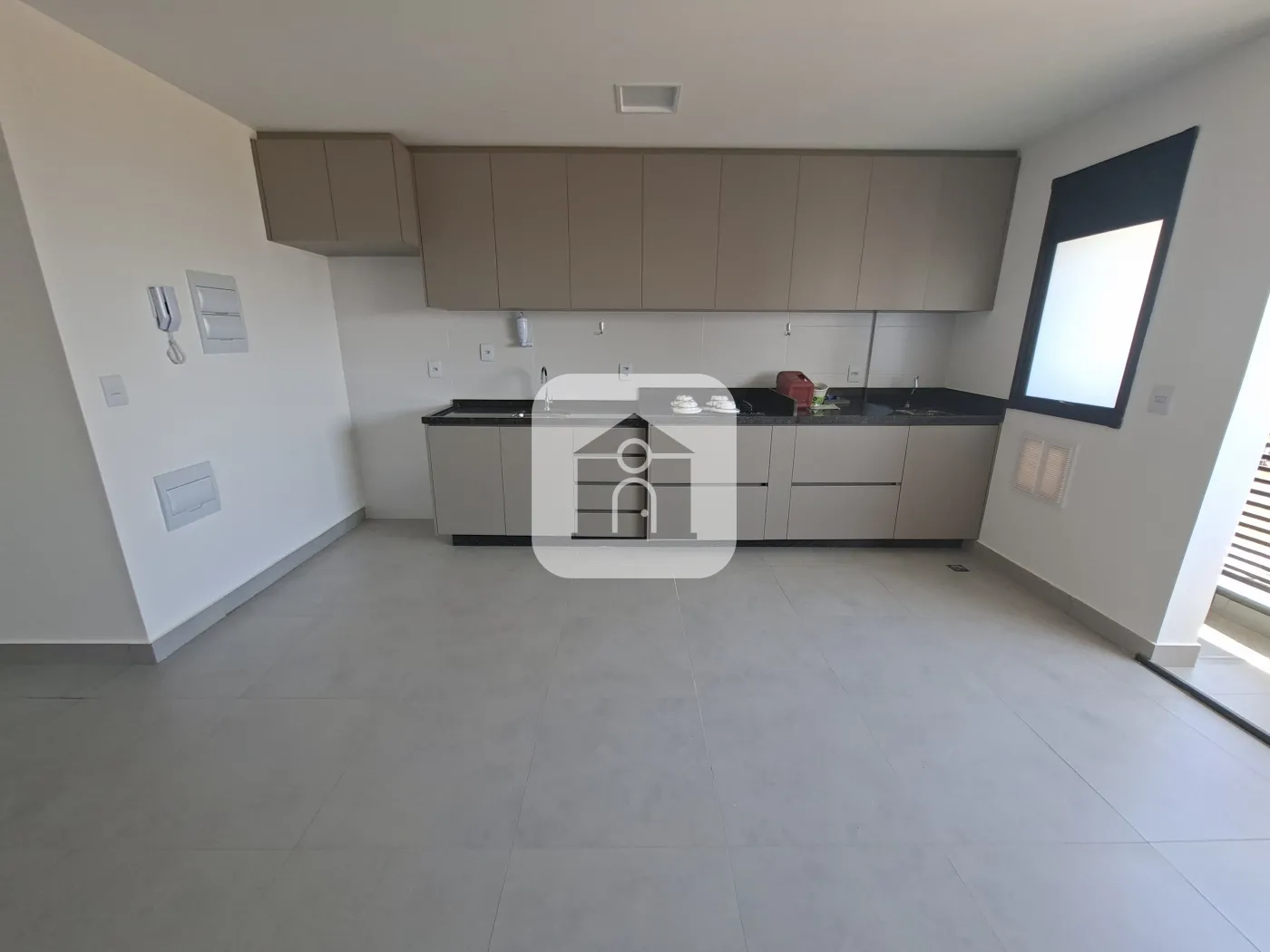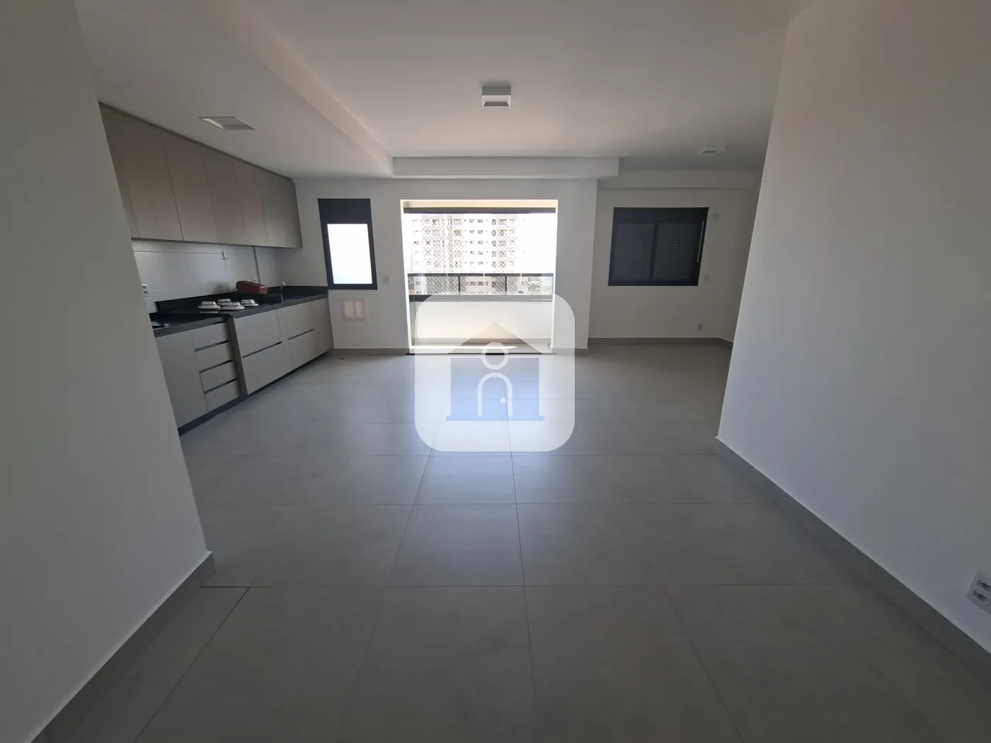 Sala em 03 ambientes com cozinha integrada, com armários embutidos e cooktop,