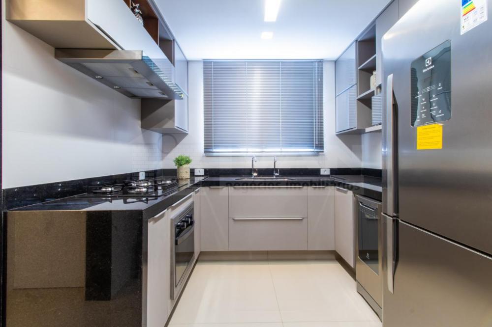 Tetos rebaixados em gesso, bancadas em granito, persianas integradas.