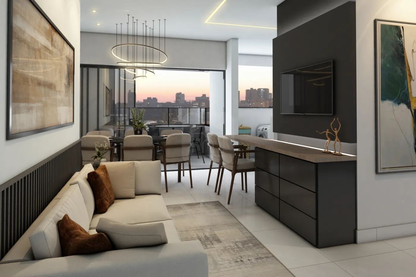 Sala ampla integrada à cozinha americana, ideal para momentos em família.