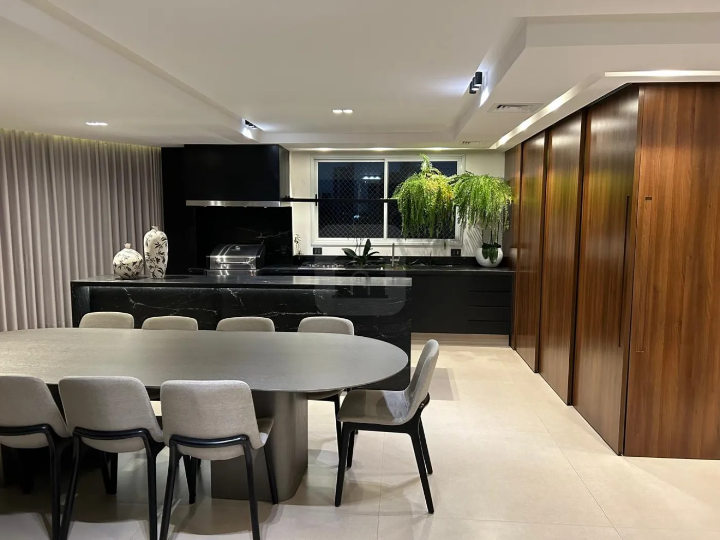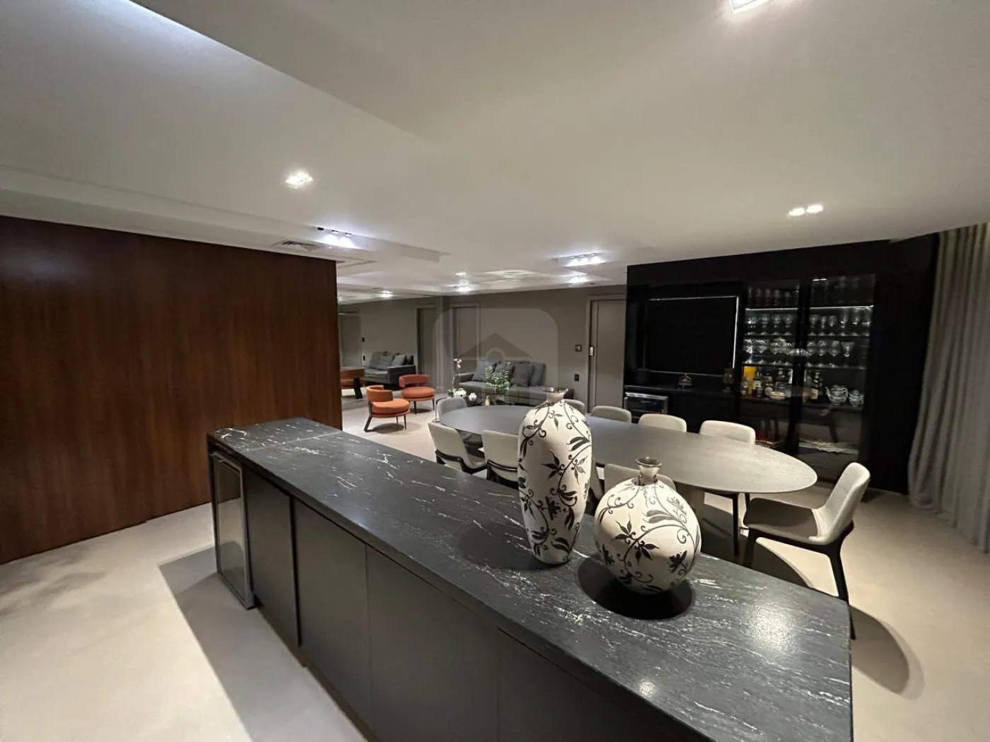 Linda cristaleira na sala de jantar e espaço para mesa de 10 lugares;
