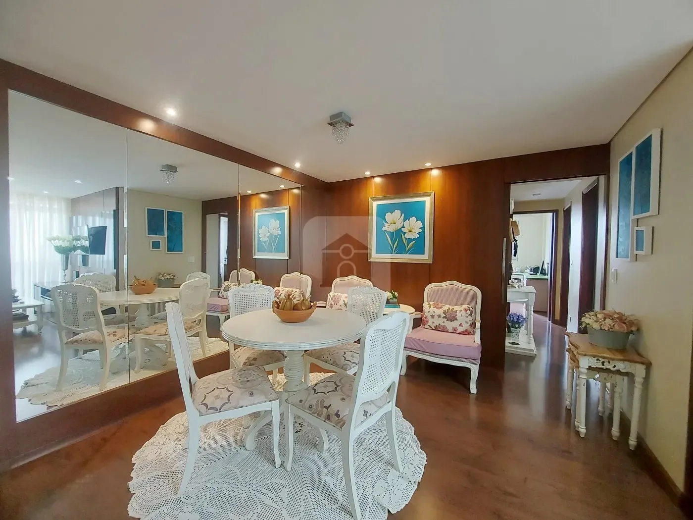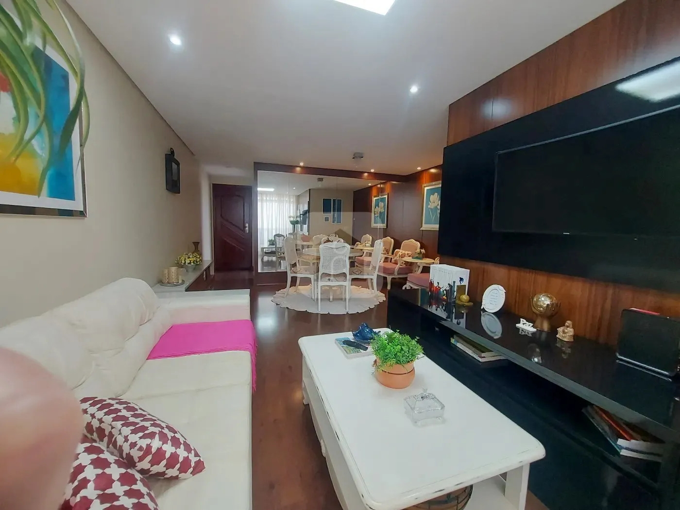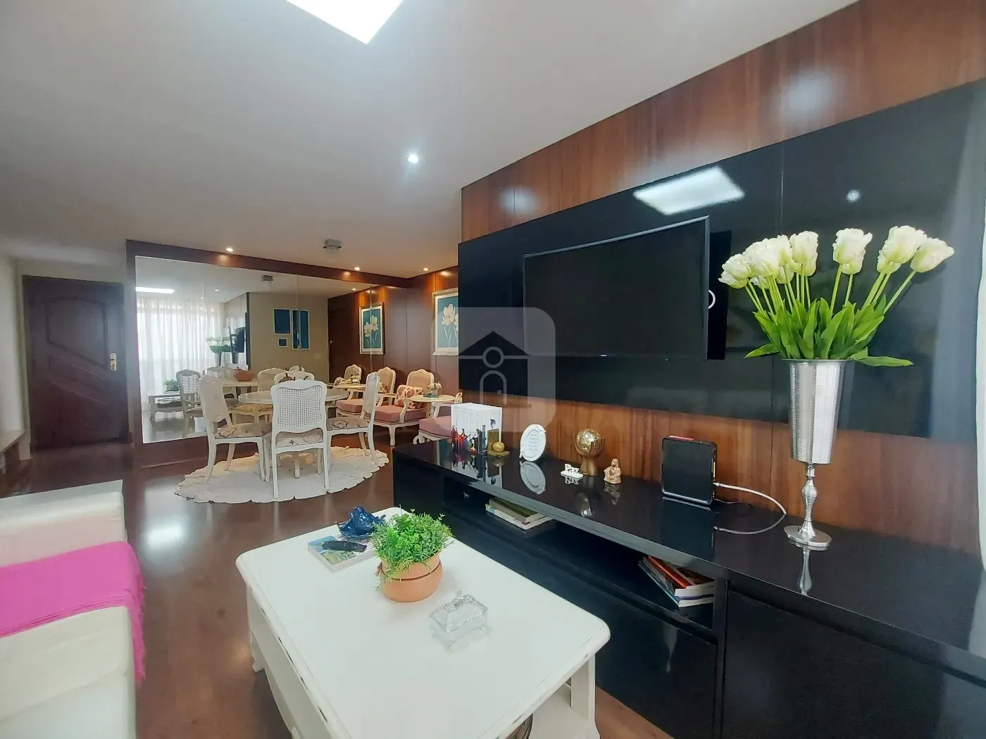Sala ampla em 02 ambientes decorado com painel de TV com aparador e na sala de jantar uma das paredes toda espelhada.