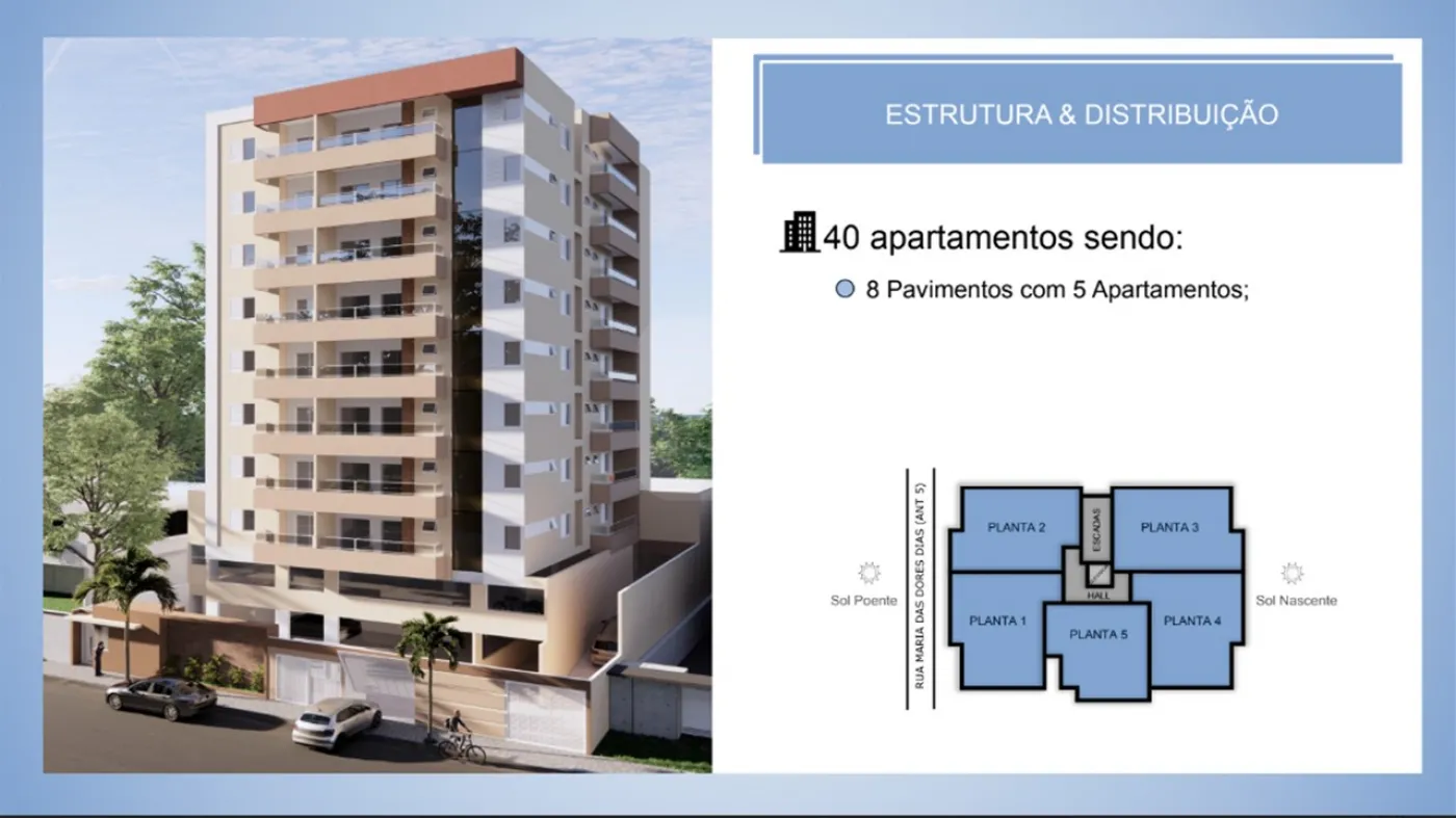 São 8 pavimentos com 5 unidades por andar.