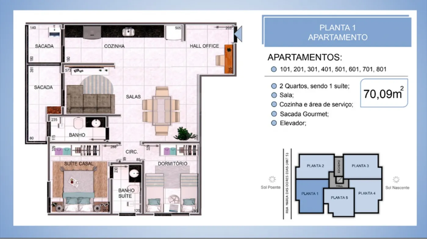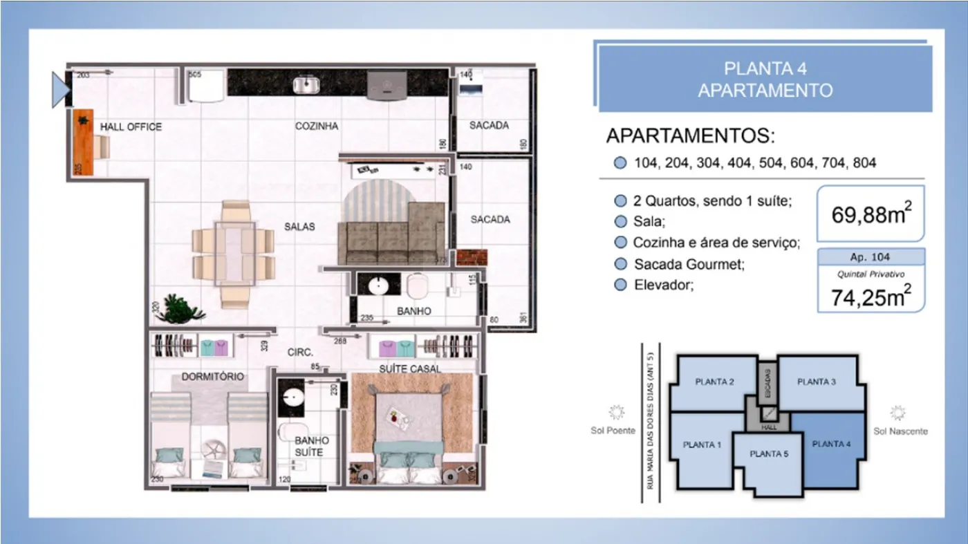 Unidades de 58 à 70m² privativos e 3 unidades térreas com 100m² a 144m².