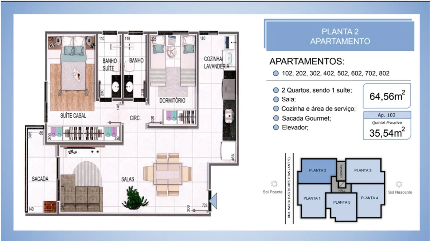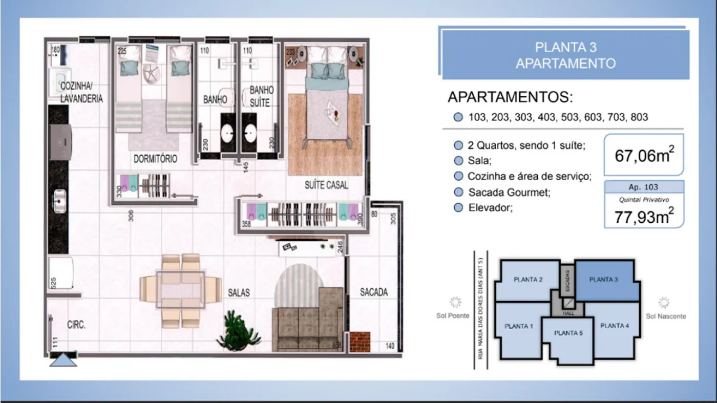 A unidade anunciada é de 58,55m² privativos no terceiro pavimento.