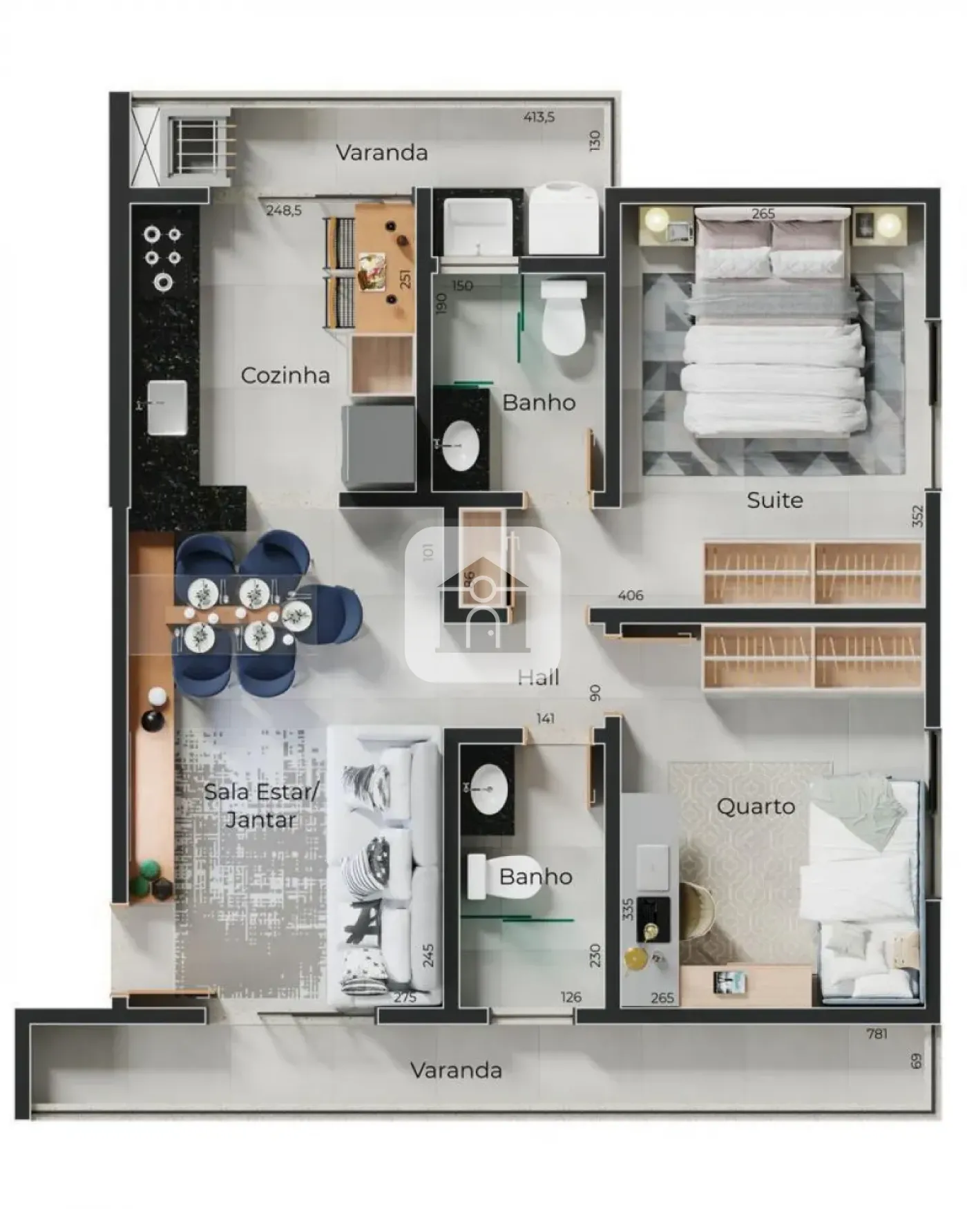 Apartamentos com 02 quartos, sendo 01 suíte, sala em 02 ambientes, banheiro social, cozinha, área de serviço separada, 01 vaga de garagem, churrasqueira à carvão. Porcelanato 80x80cm (piso), roda pé embutido, laje técnica para ar condicionado.