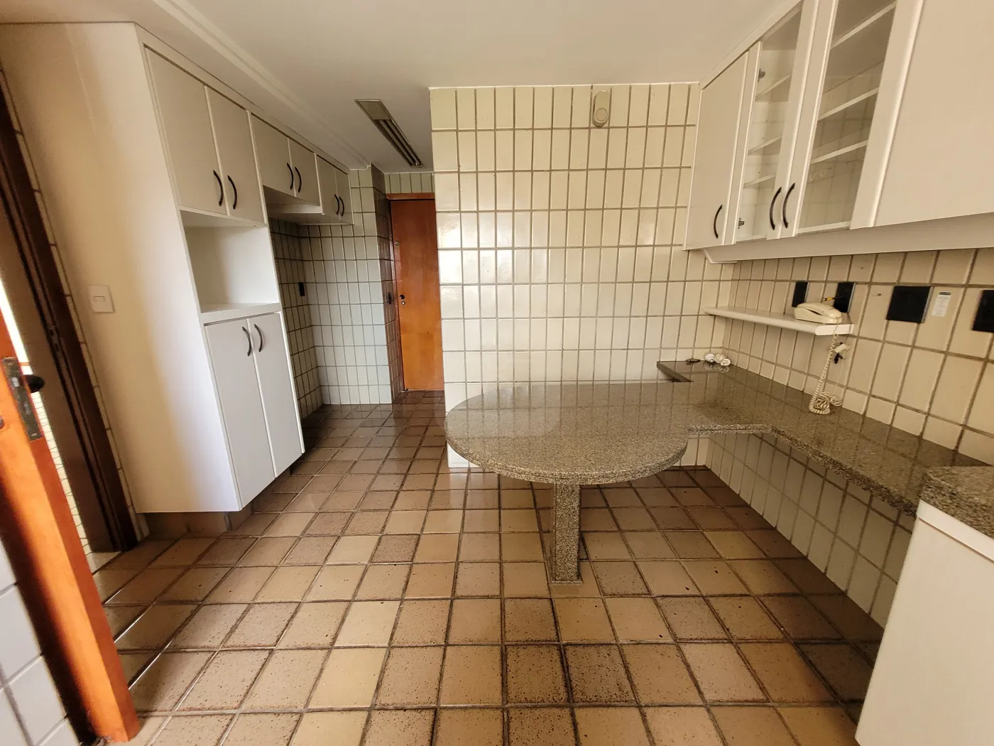 Cozinha com armários e mesa fixa em granito;