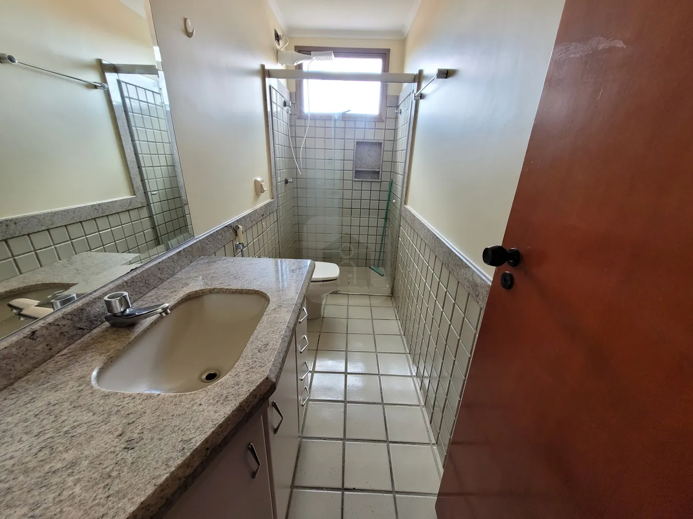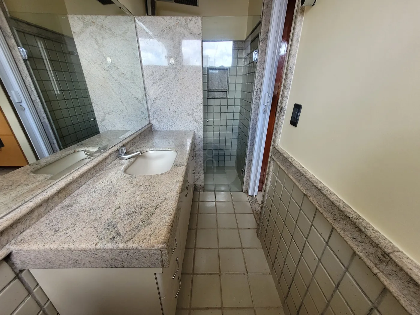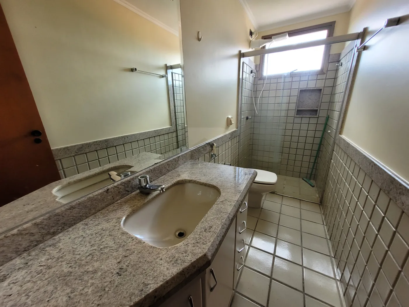 Banheiro da suíte com armário, espelho e box em blindex;