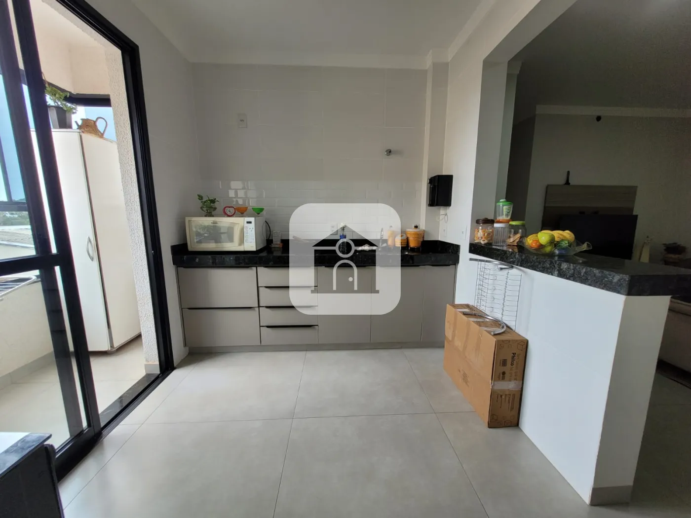 Cozinha estilo americana com armário e bancada;