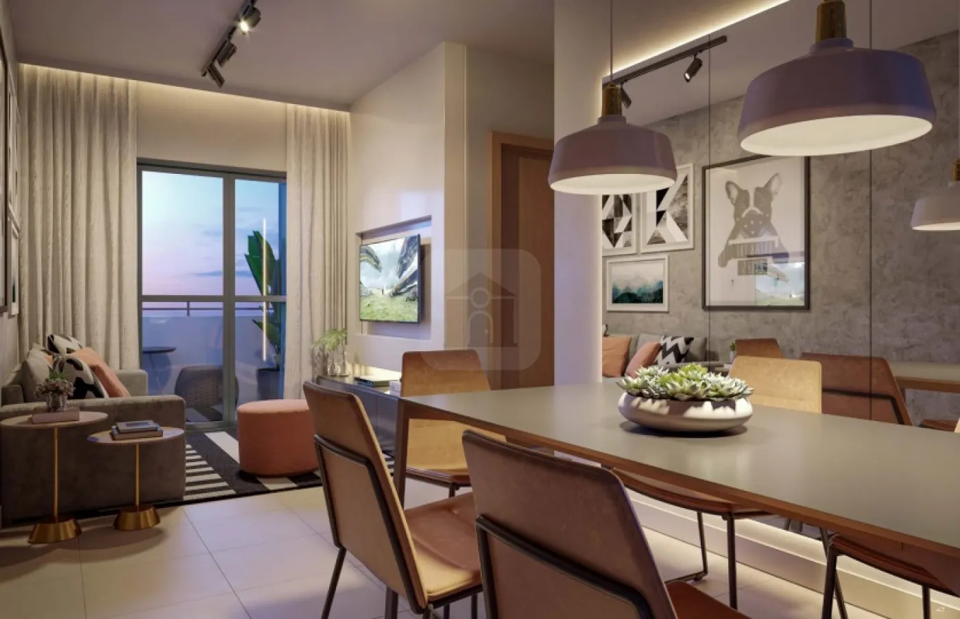 Apartamento possui salas integradas.