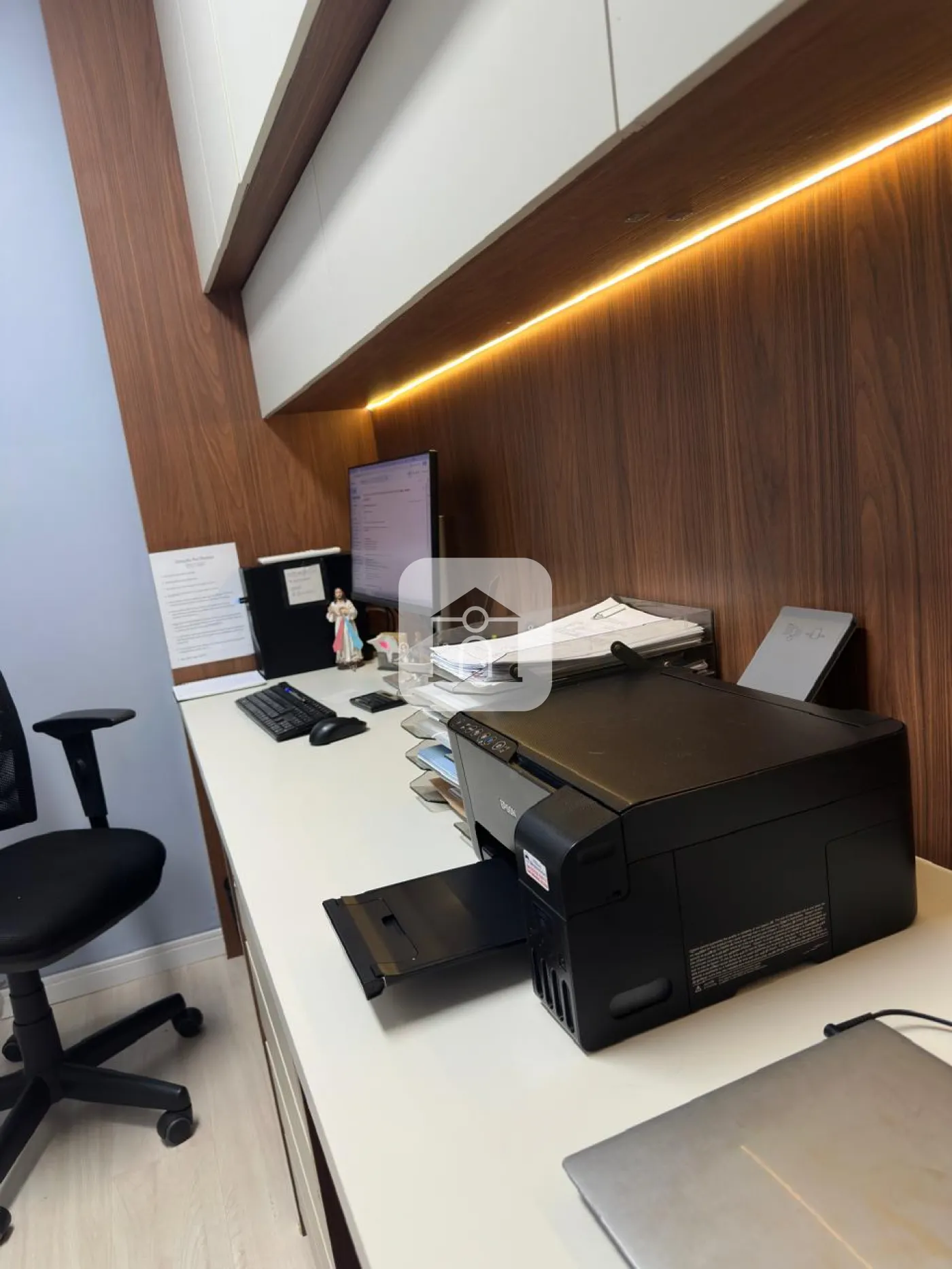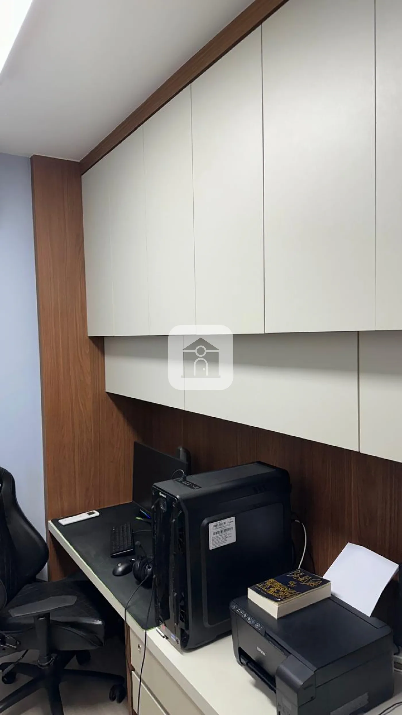 Escritório com longa bancada e armários em toda a sua extensão com 2 `workspace` e gavetas.