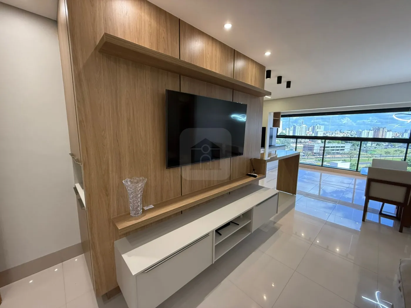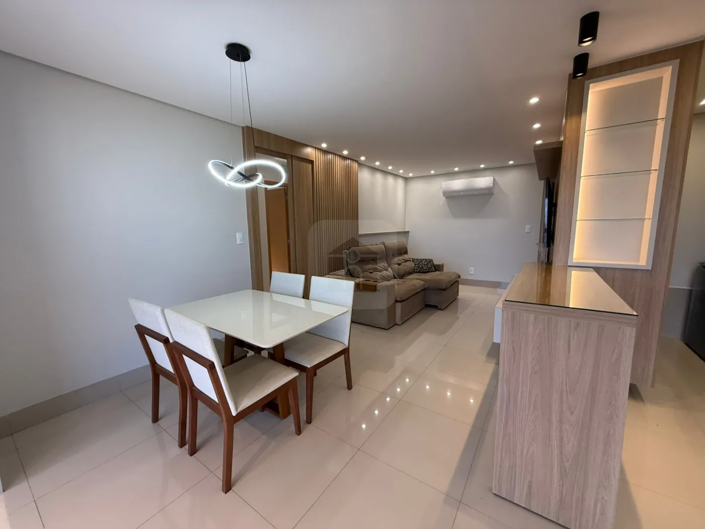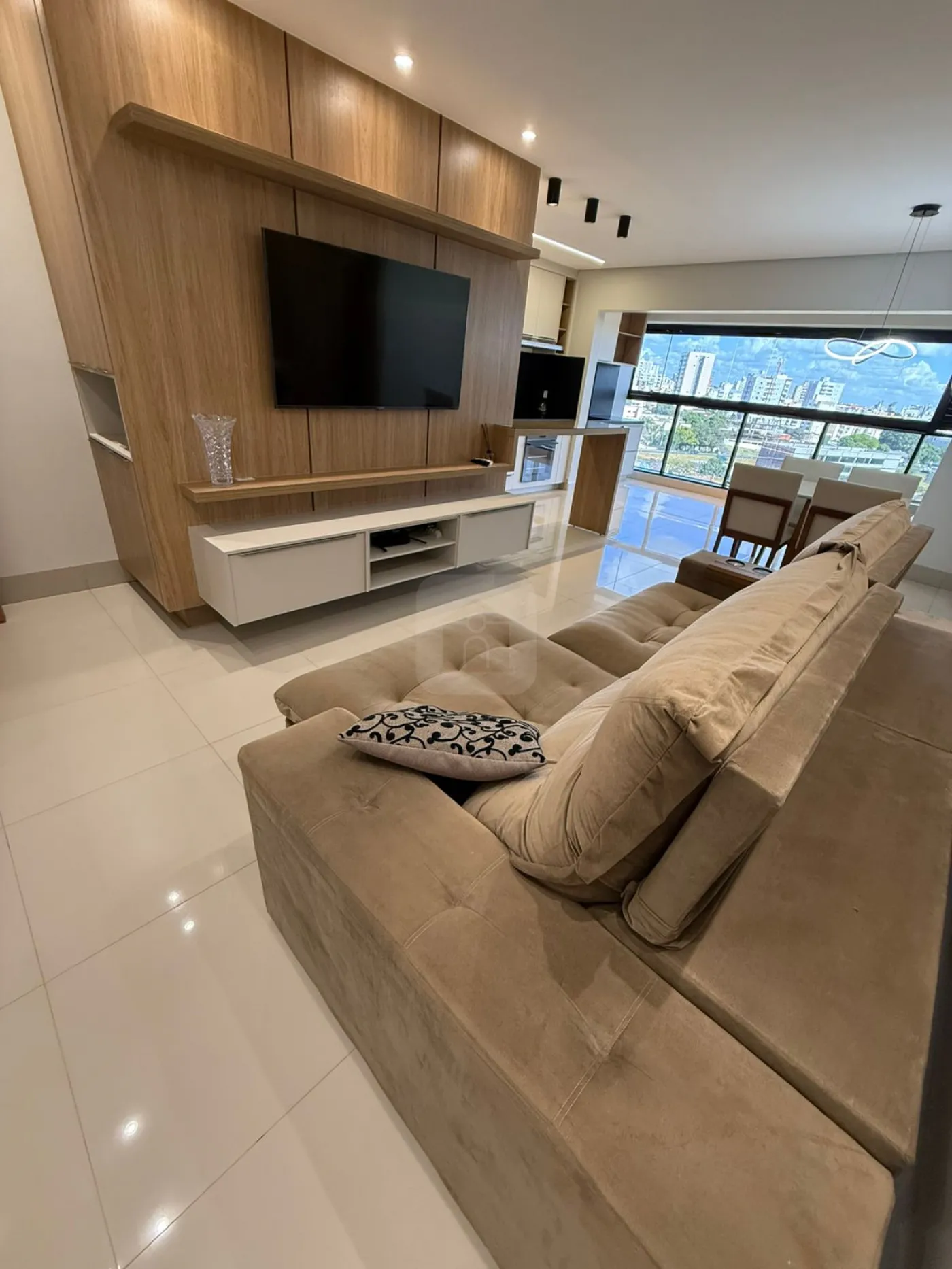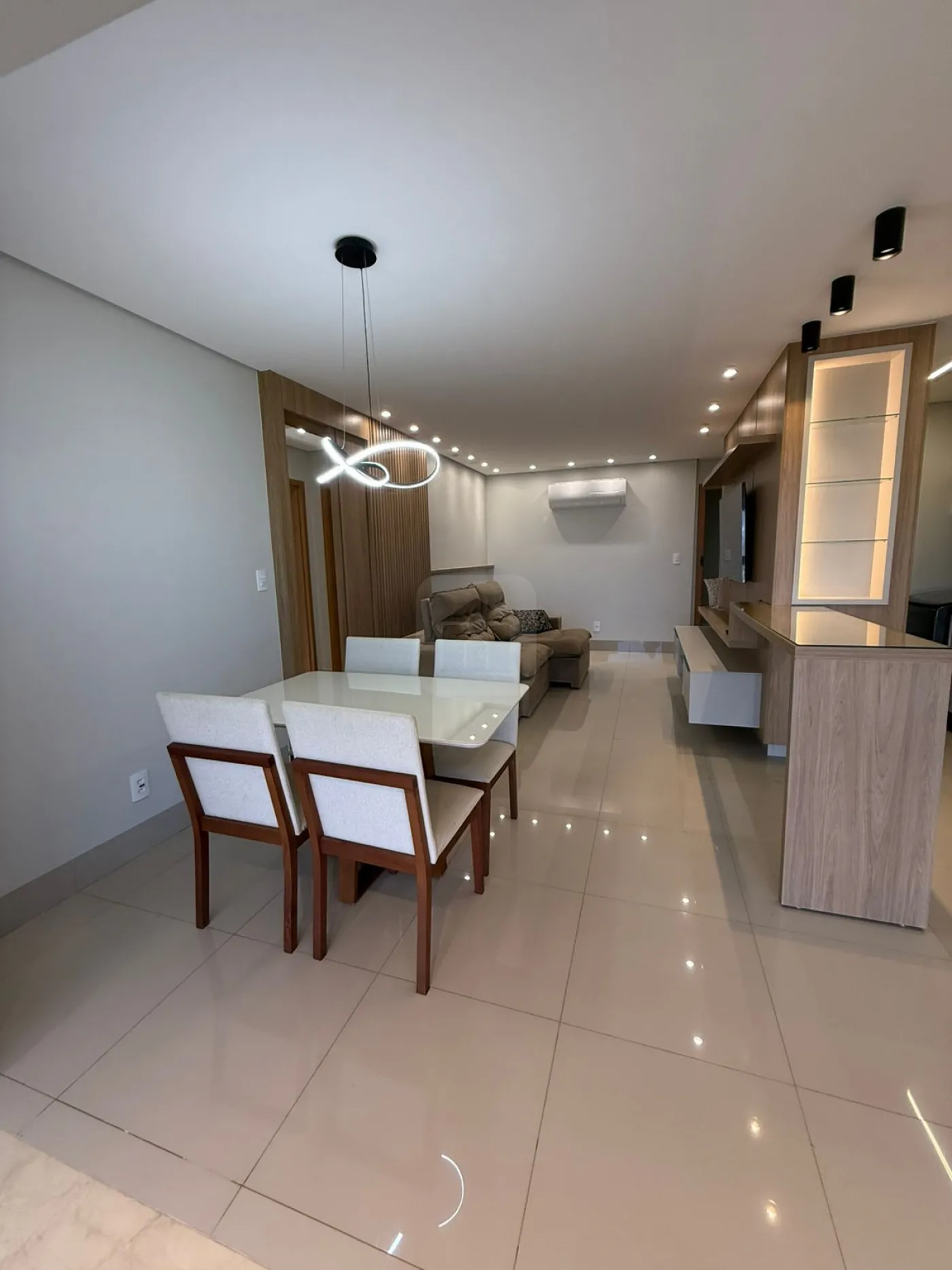Sala com ar-condicionado, painel para TV e iluminação planejada