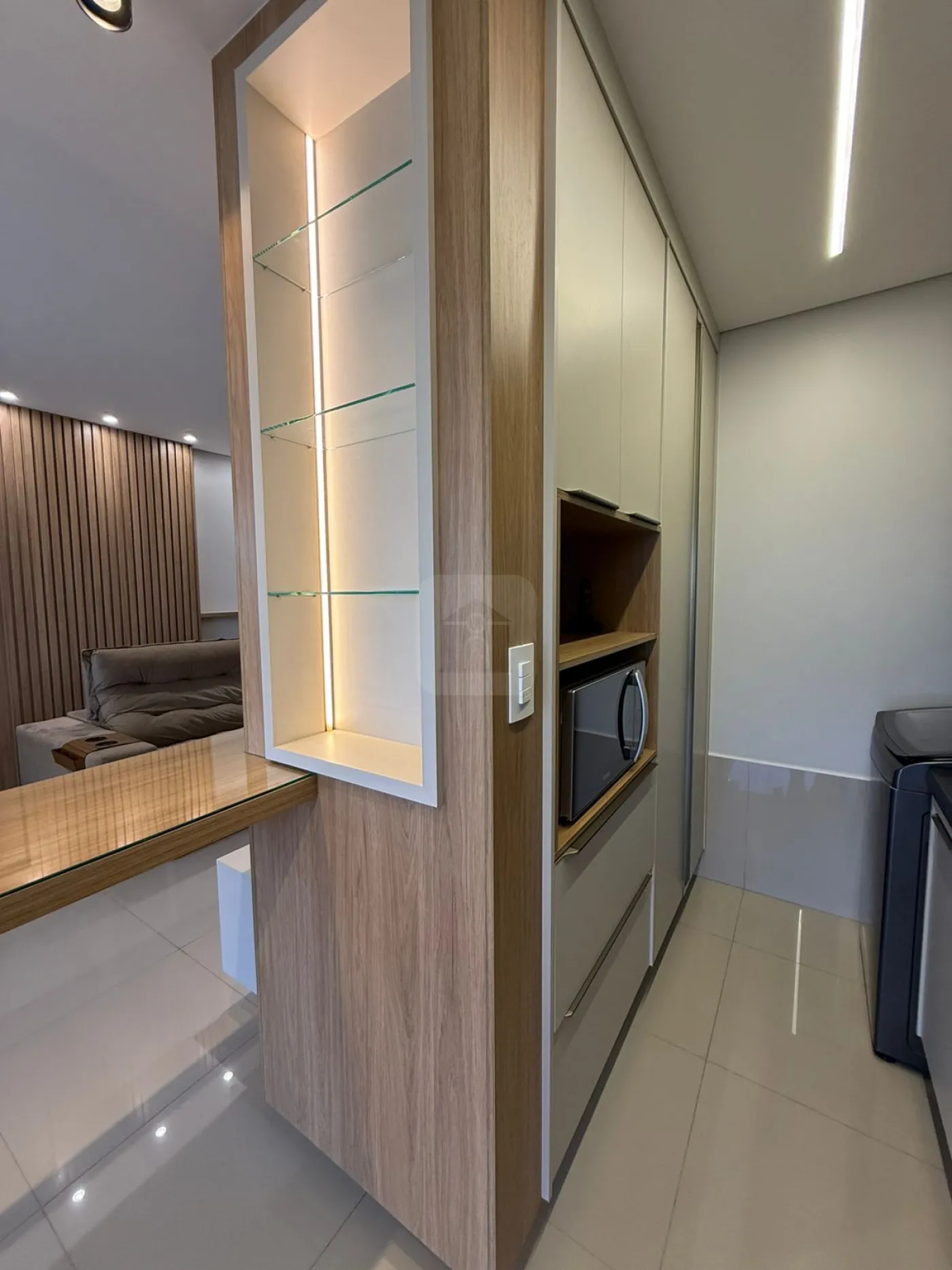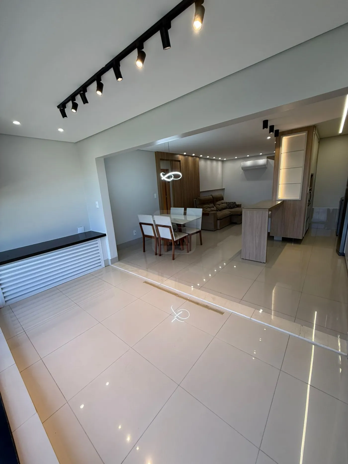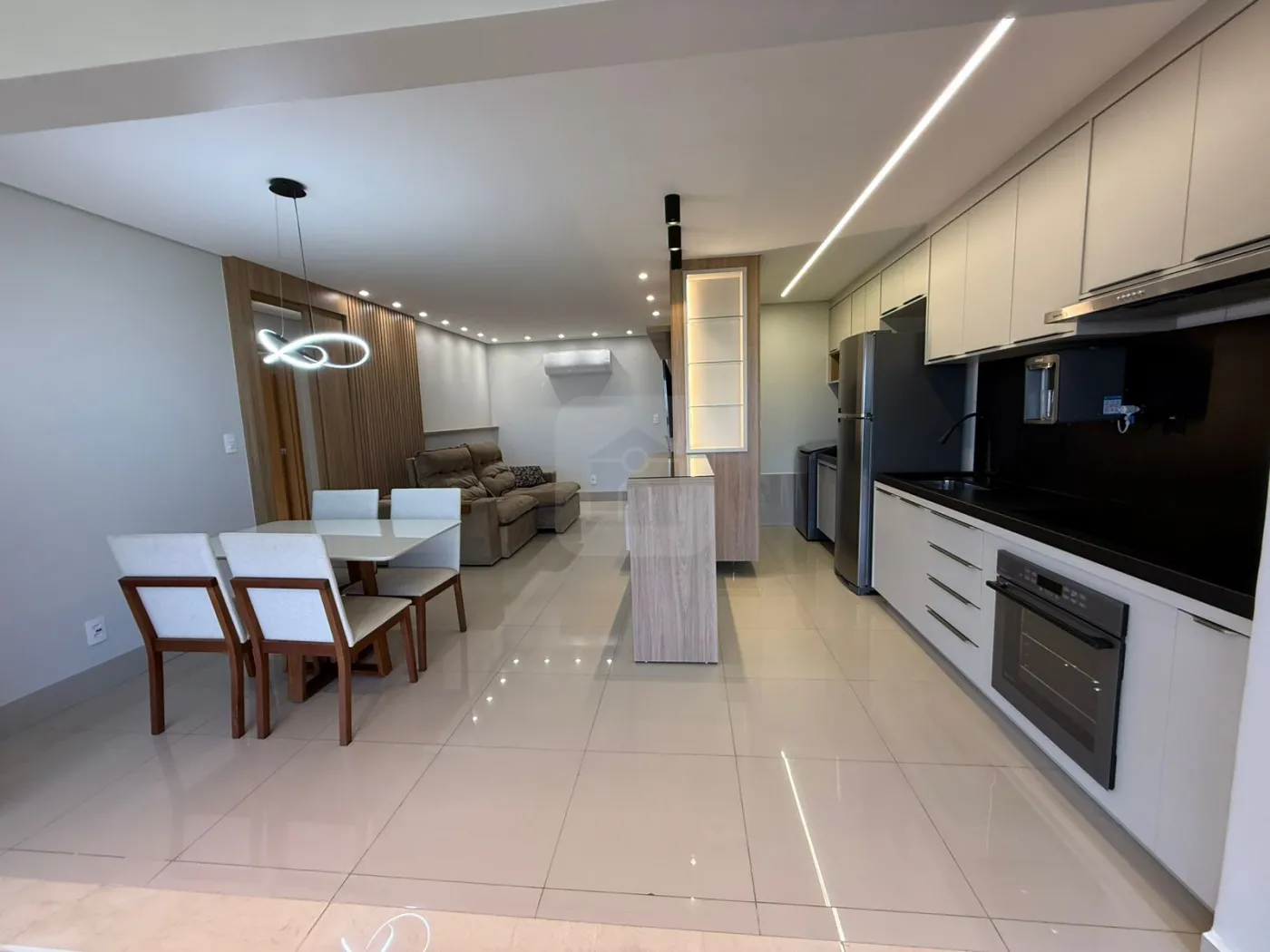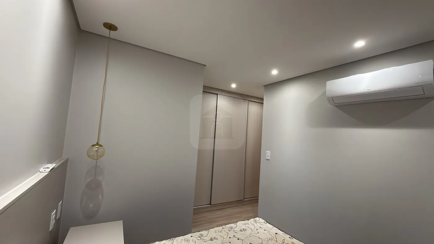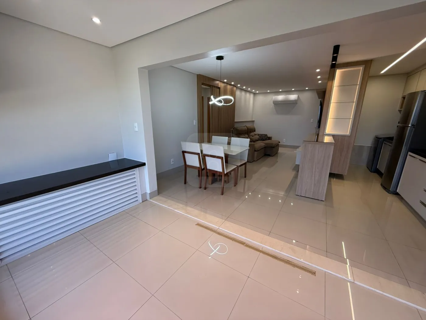Sala com ar-condicionado, painel para TV e iluminação planejada