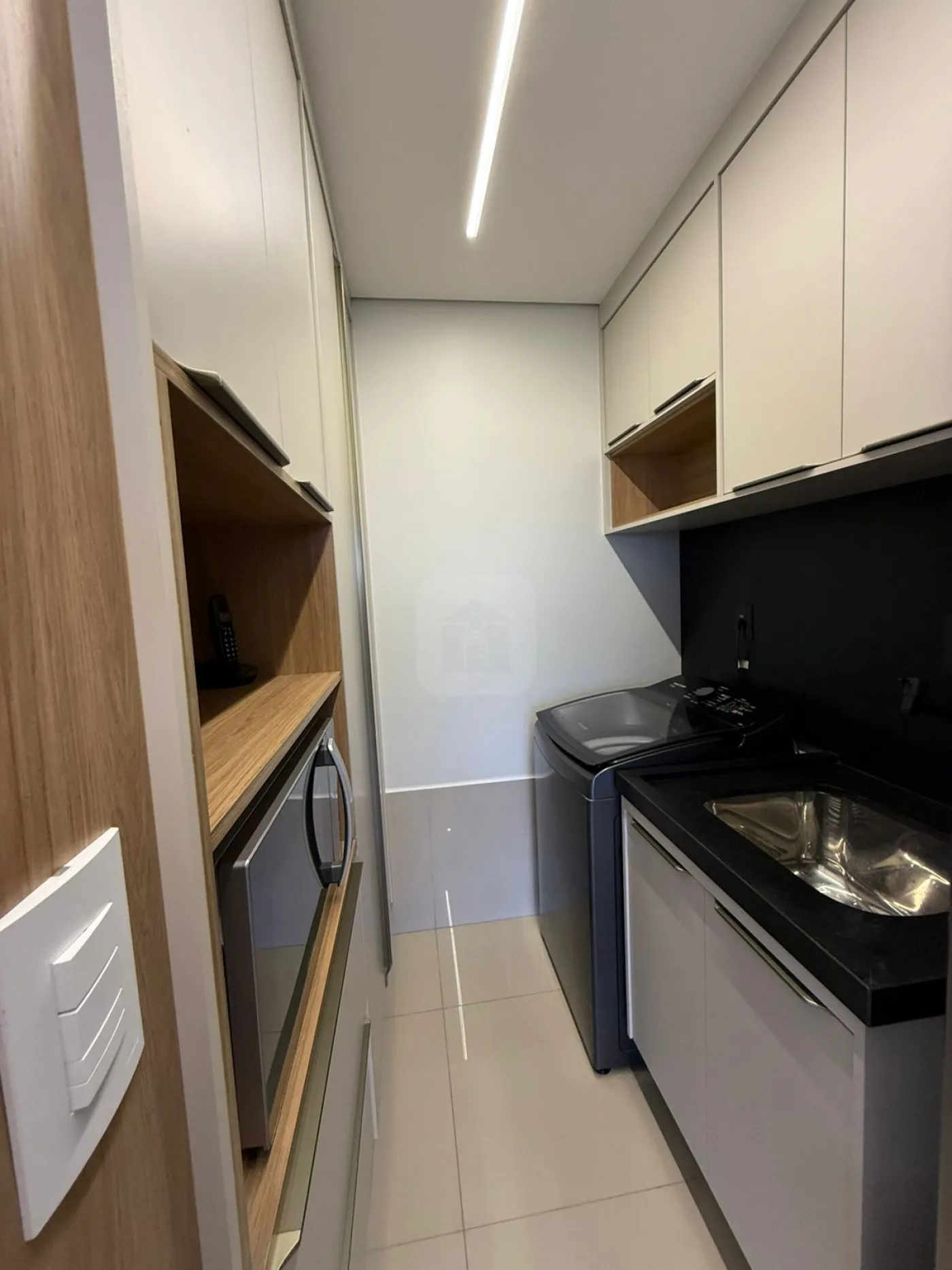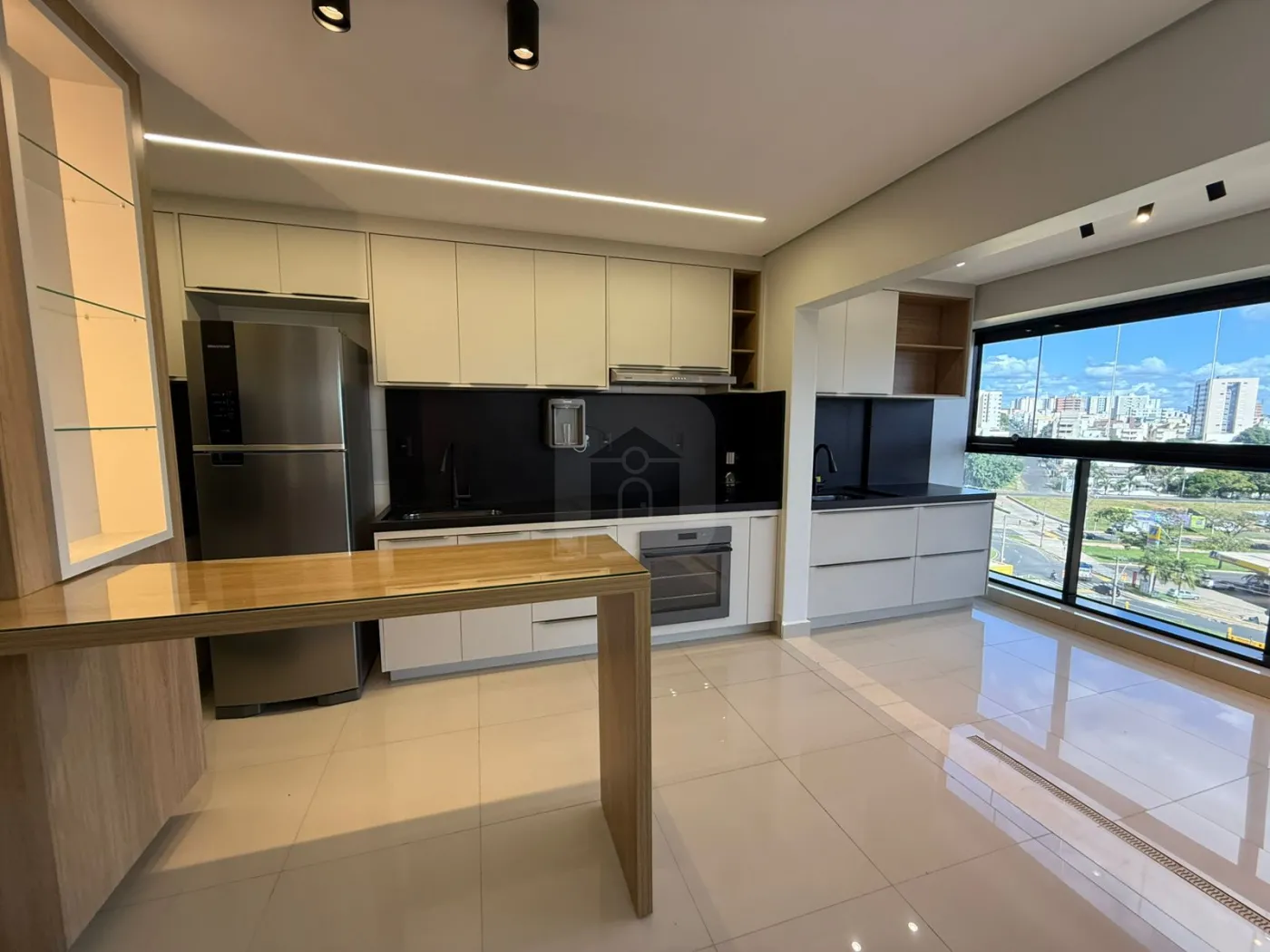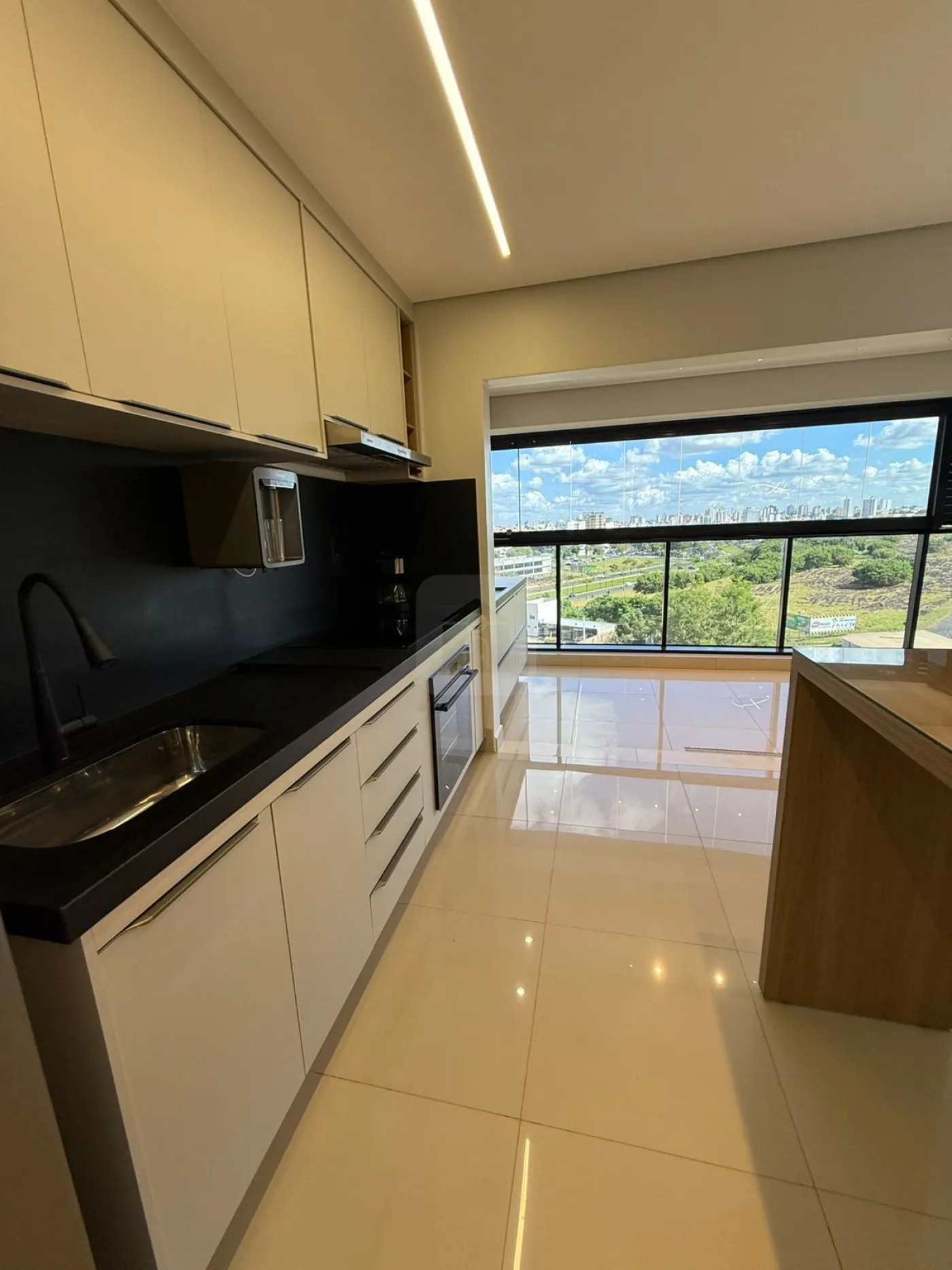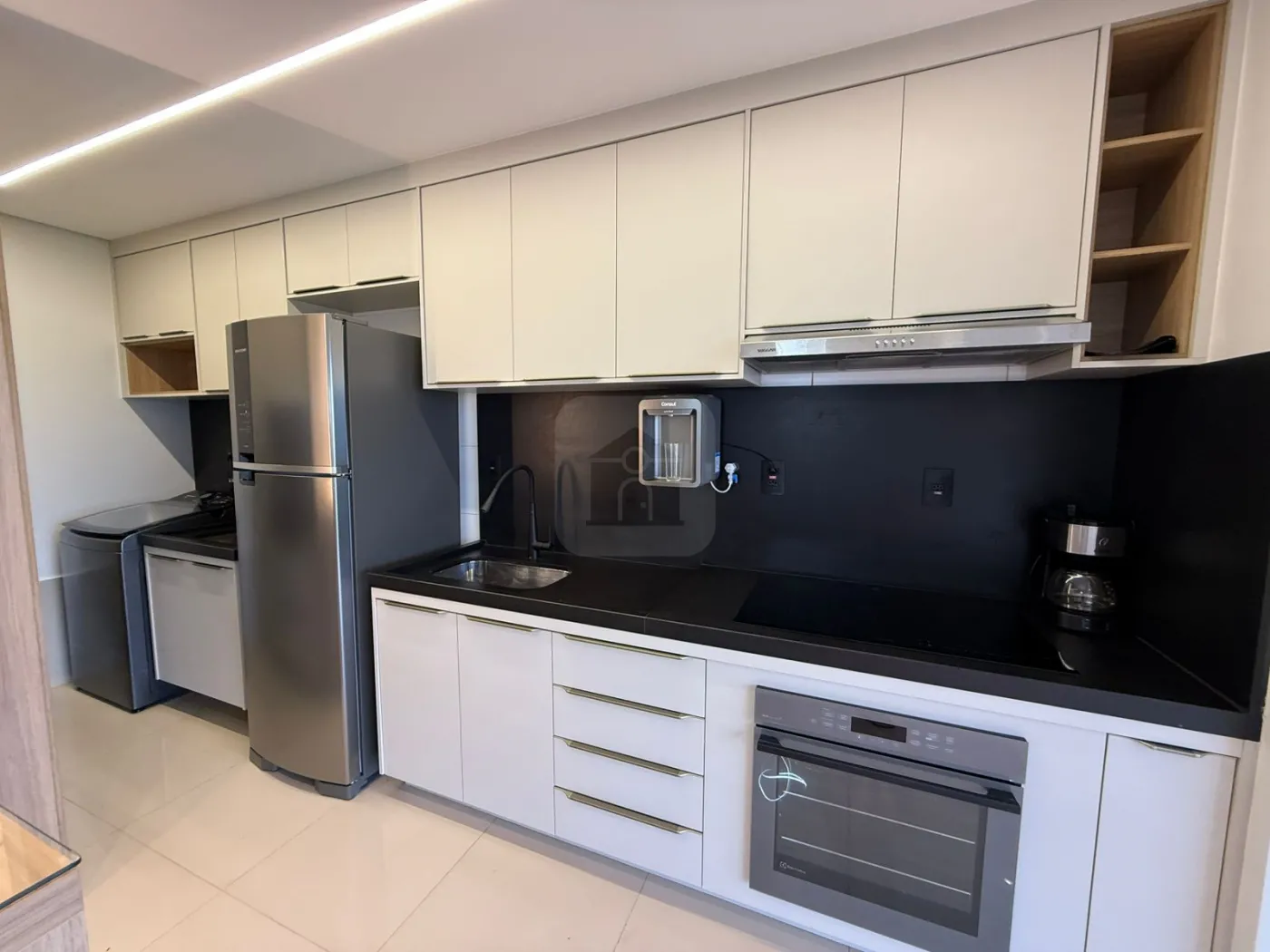 Cozinha equipada com eletros modernos e bancada em granito preto absoluto