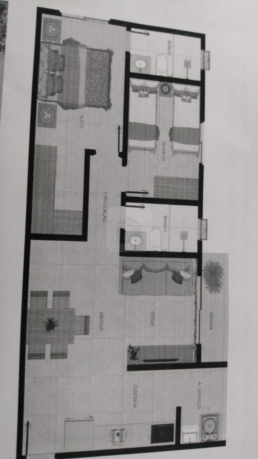 02 Quartos sendo 01 suite com closet, sala de estar, sala de jantar, sacada, banho social, cozinha, circulação e área de serviço.