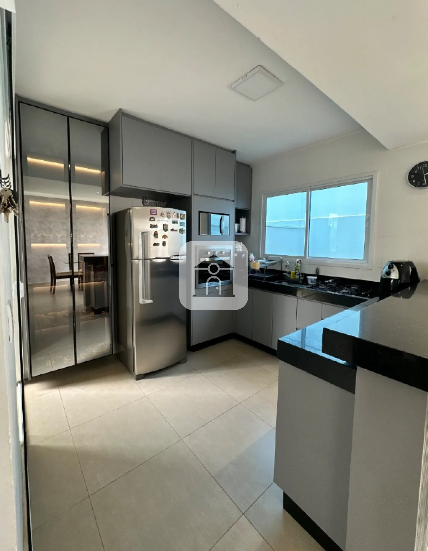 Cozinha integrada com armários e cristaleira;