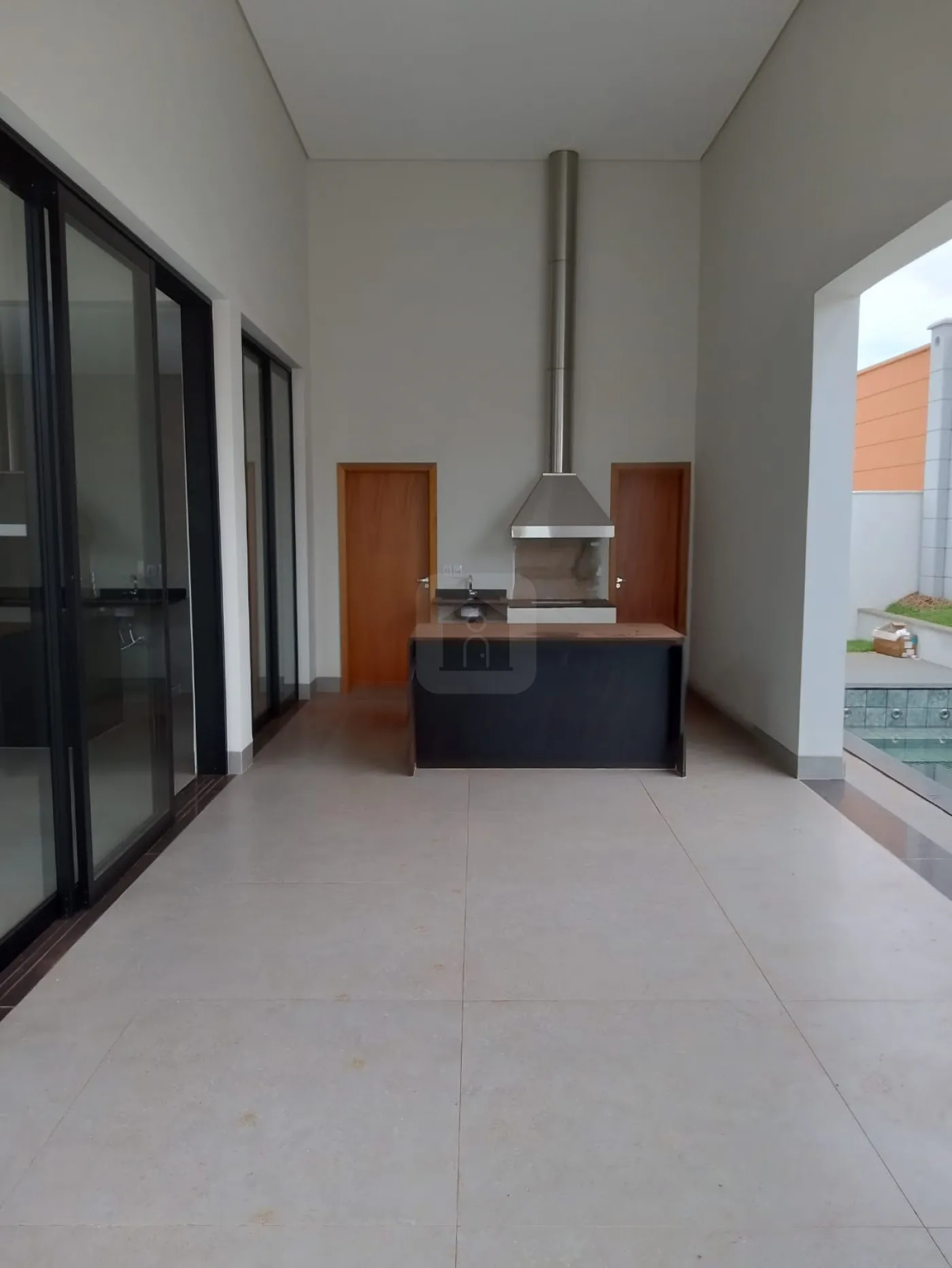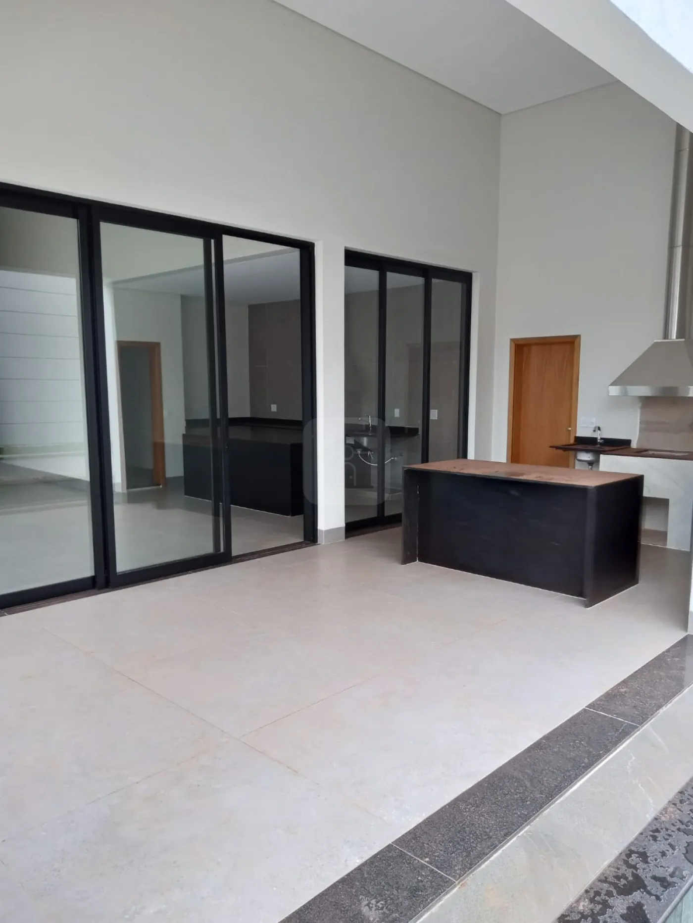 Varanda gourmet com churrasqueira, bancada, e banheiro completo,