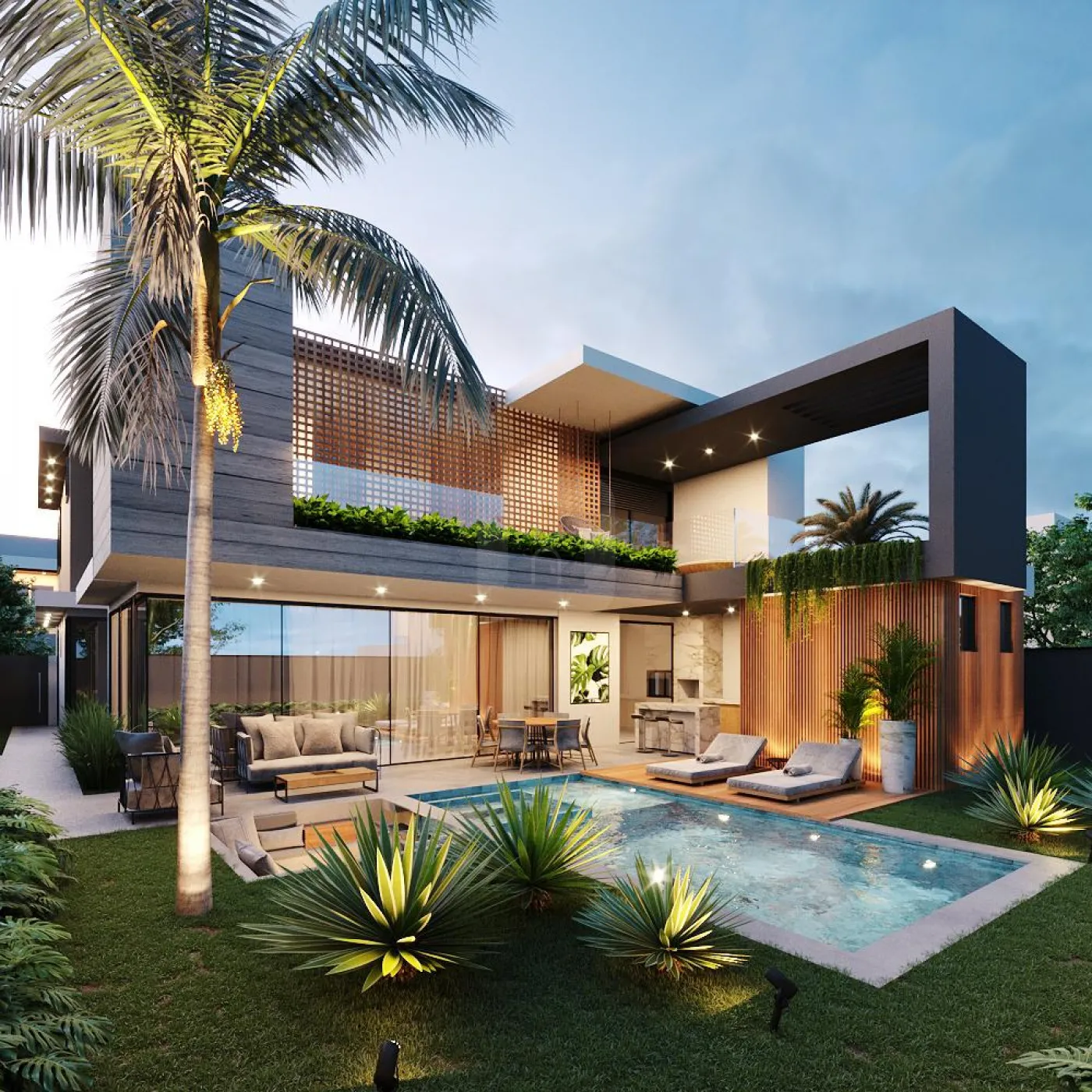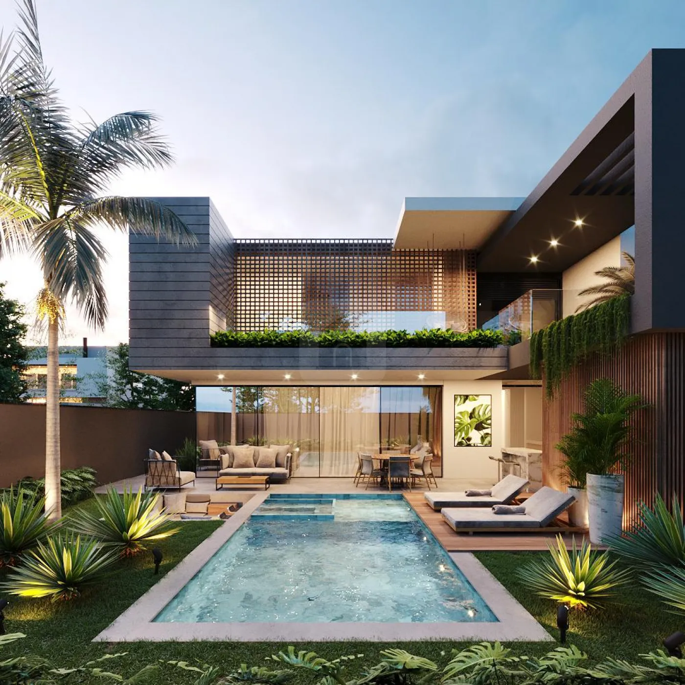 Piscina aquecida com hidromassagem, cascada, deck de madeira;