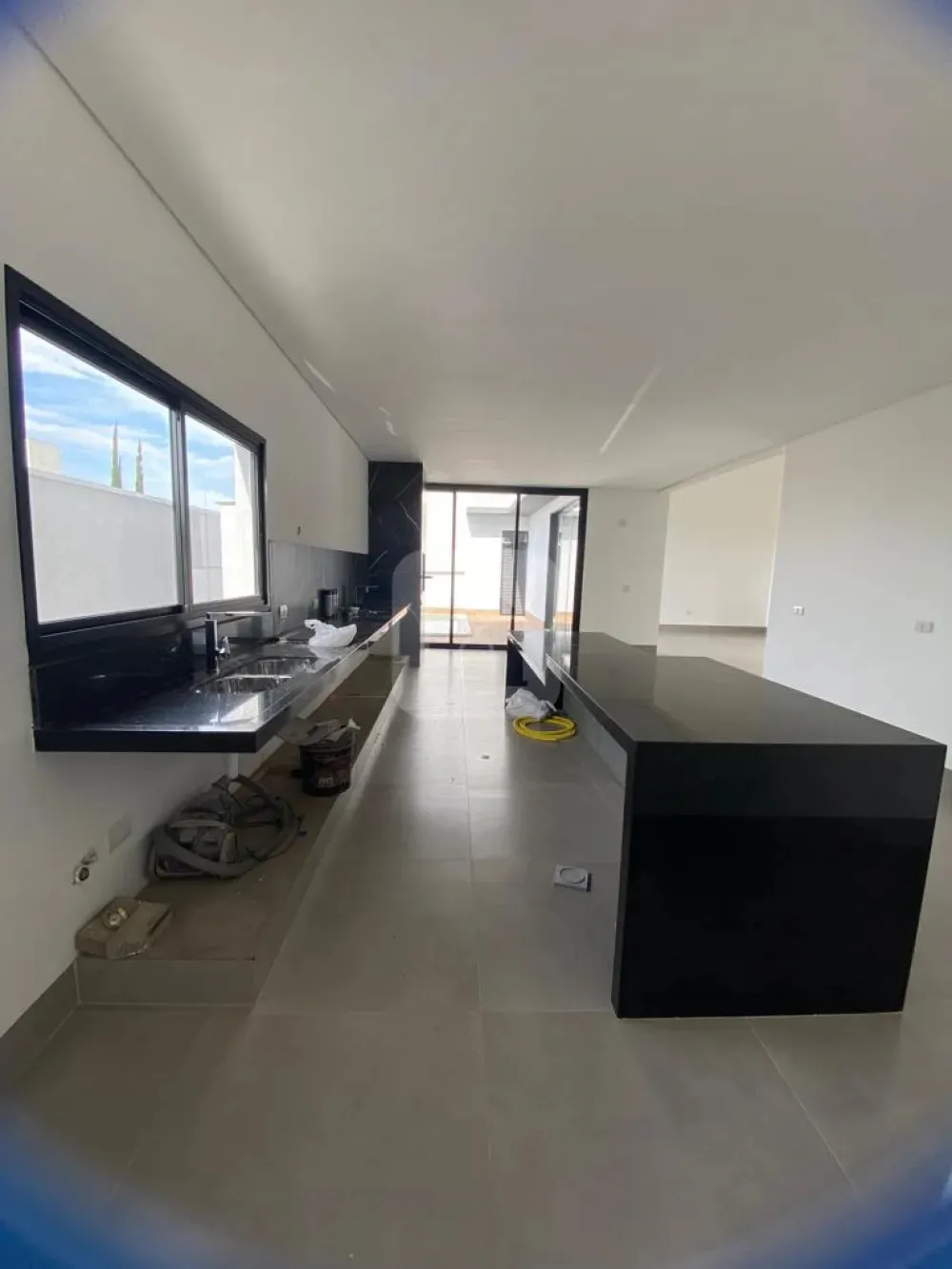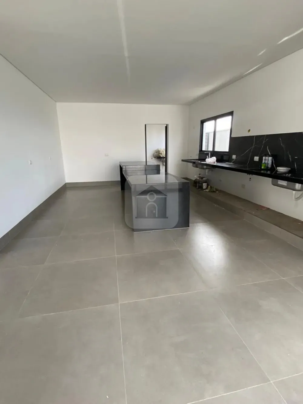 Cozinha gourmet com bancada em granito para cooktop e churrascaria.