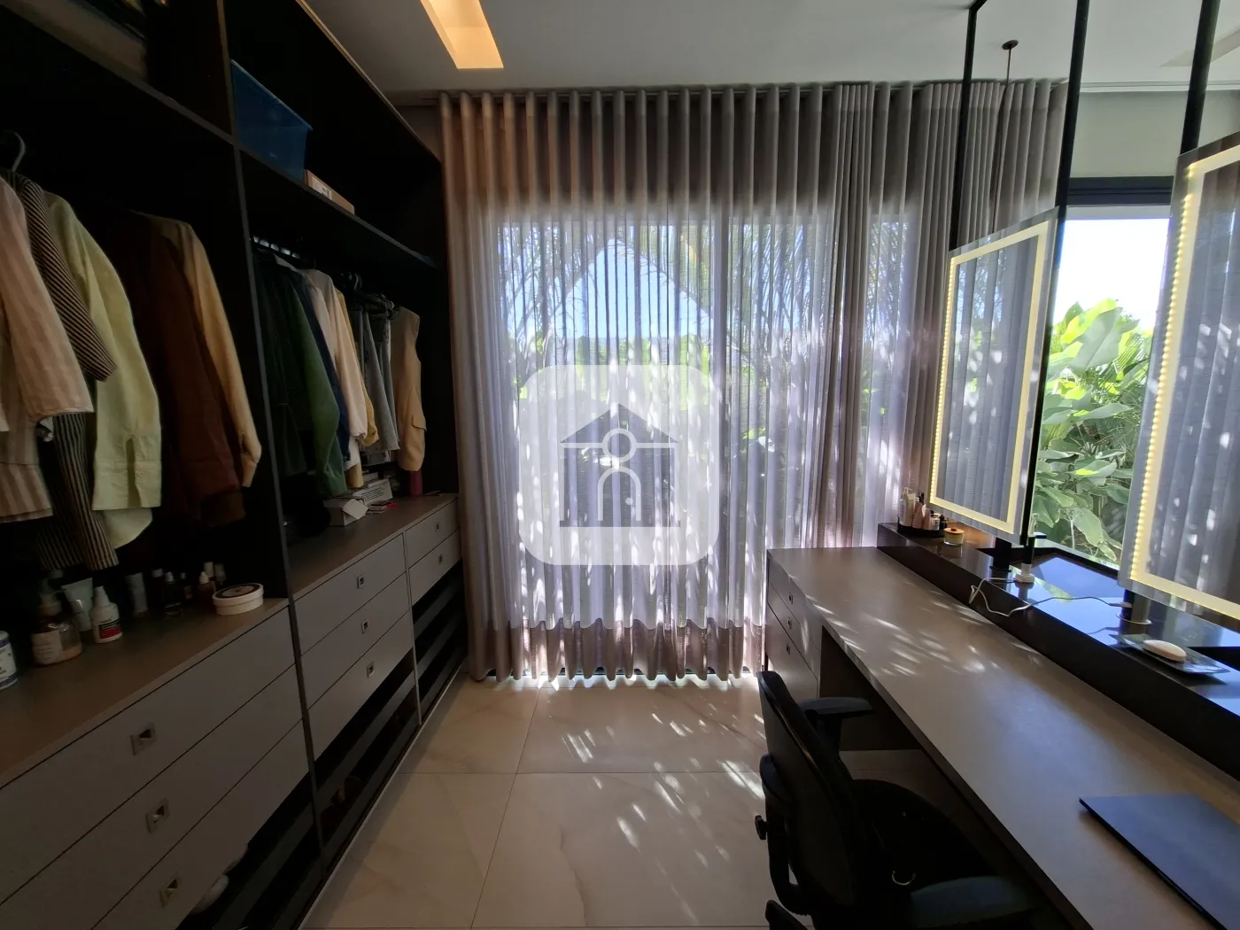 A casa conta ainda com sistema de geração fotovoltaica com produção aproximada de 700 kW, irrigação automatizada e automação residencial integrada à Alexa, cobrindo cerca de 70% da residência. A área externa possui piscina e spa, ambos com aquecimento independente e regulagem de temperatura separada.