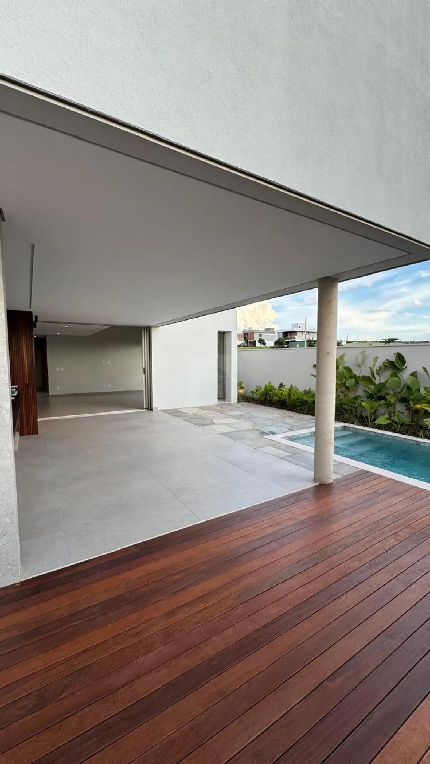 Piscina revestida com pastilha Atlas, deck de madeira e trocador de calor