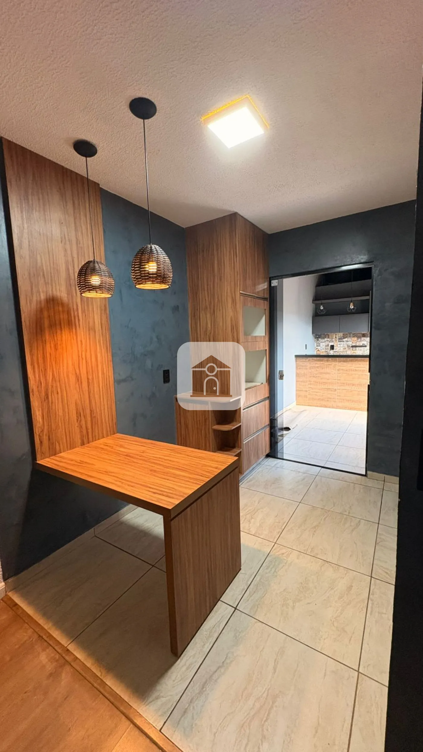 Sala com painel ripado e cozinha `conceito aberto`, com armários planejados e mesa e torre quente;