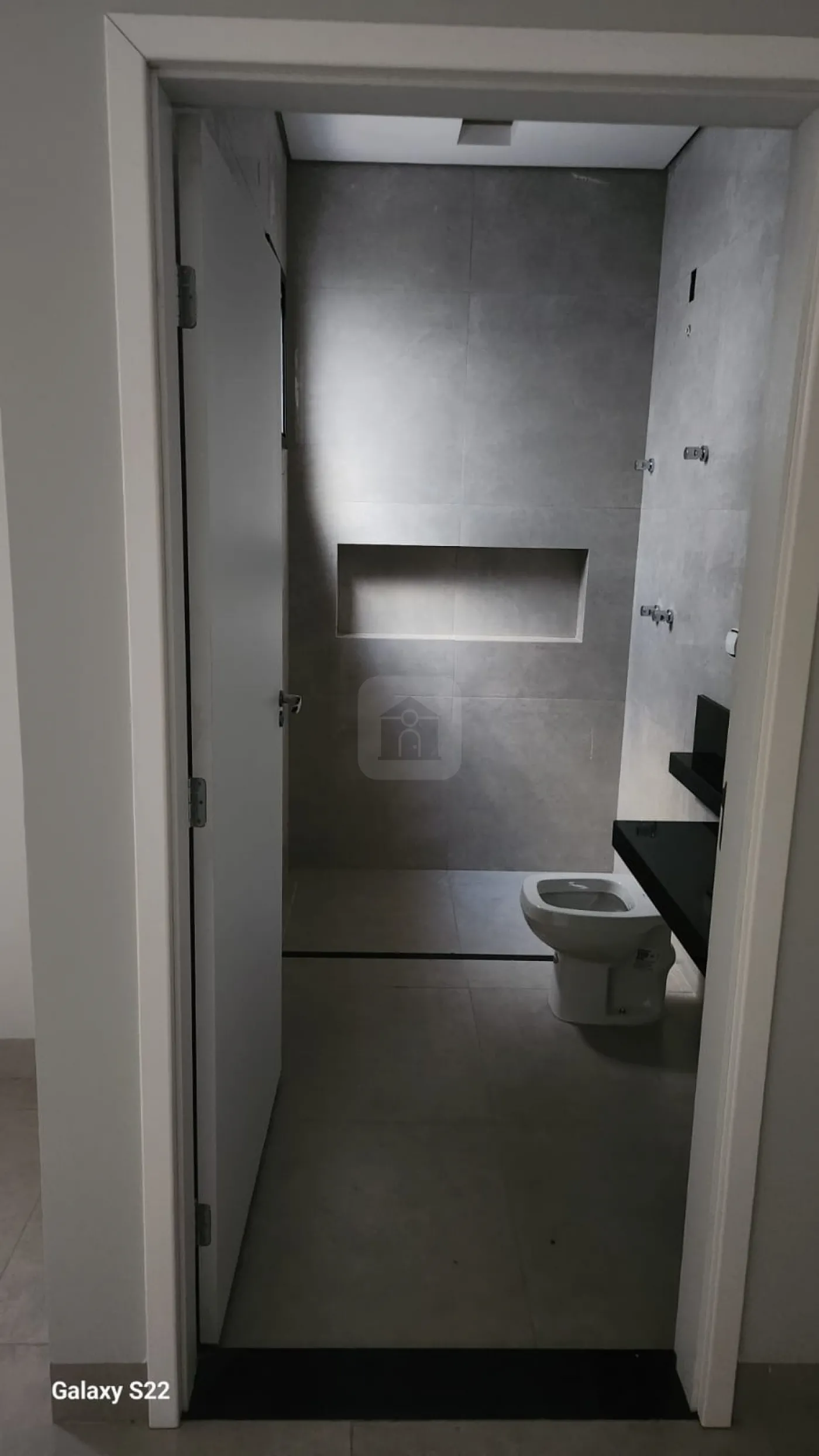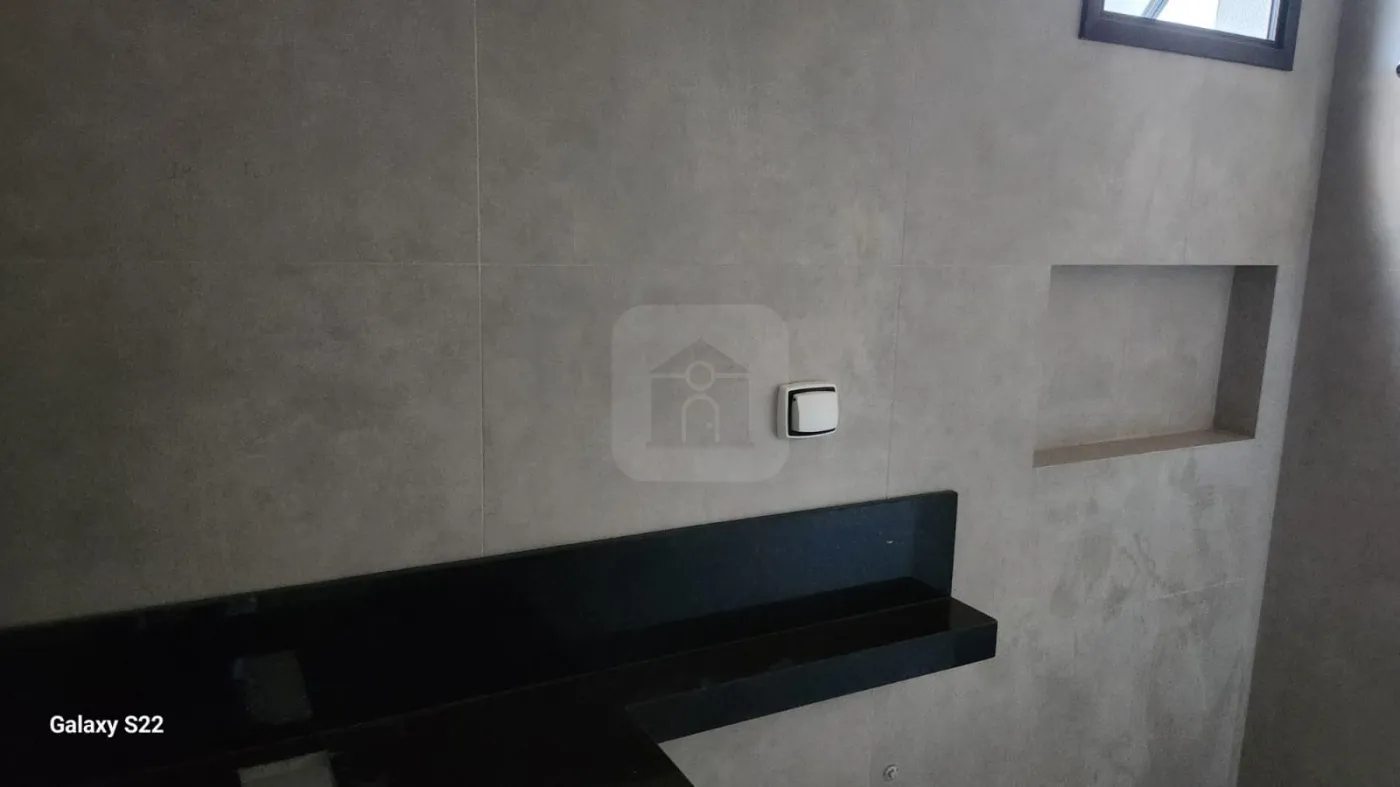Banheiro Social e Suíte com revestimento em porcelanato até o teto + Nicho em porcelanato + bancada ampla.