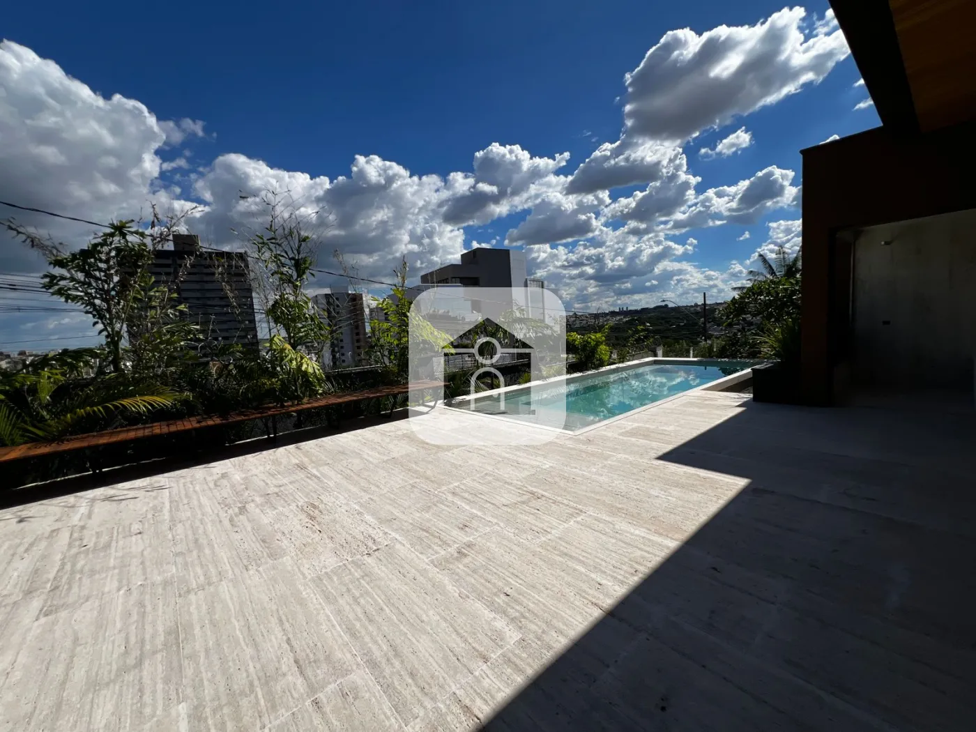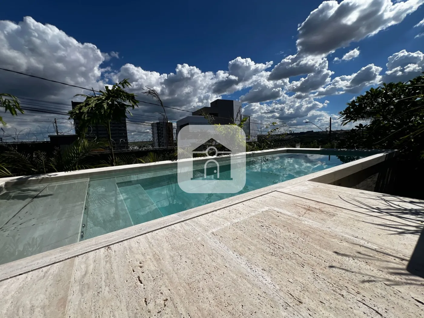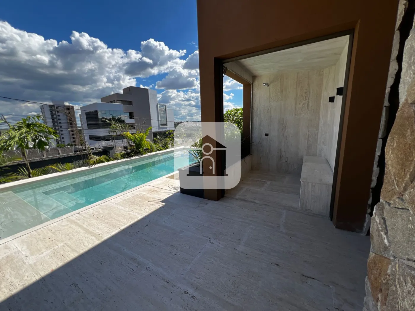 Hall de entrada com lago sobre pisadas de travertino, uma recepção digna de revista.