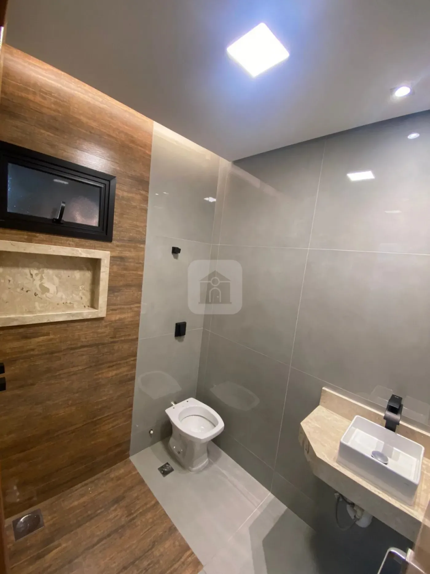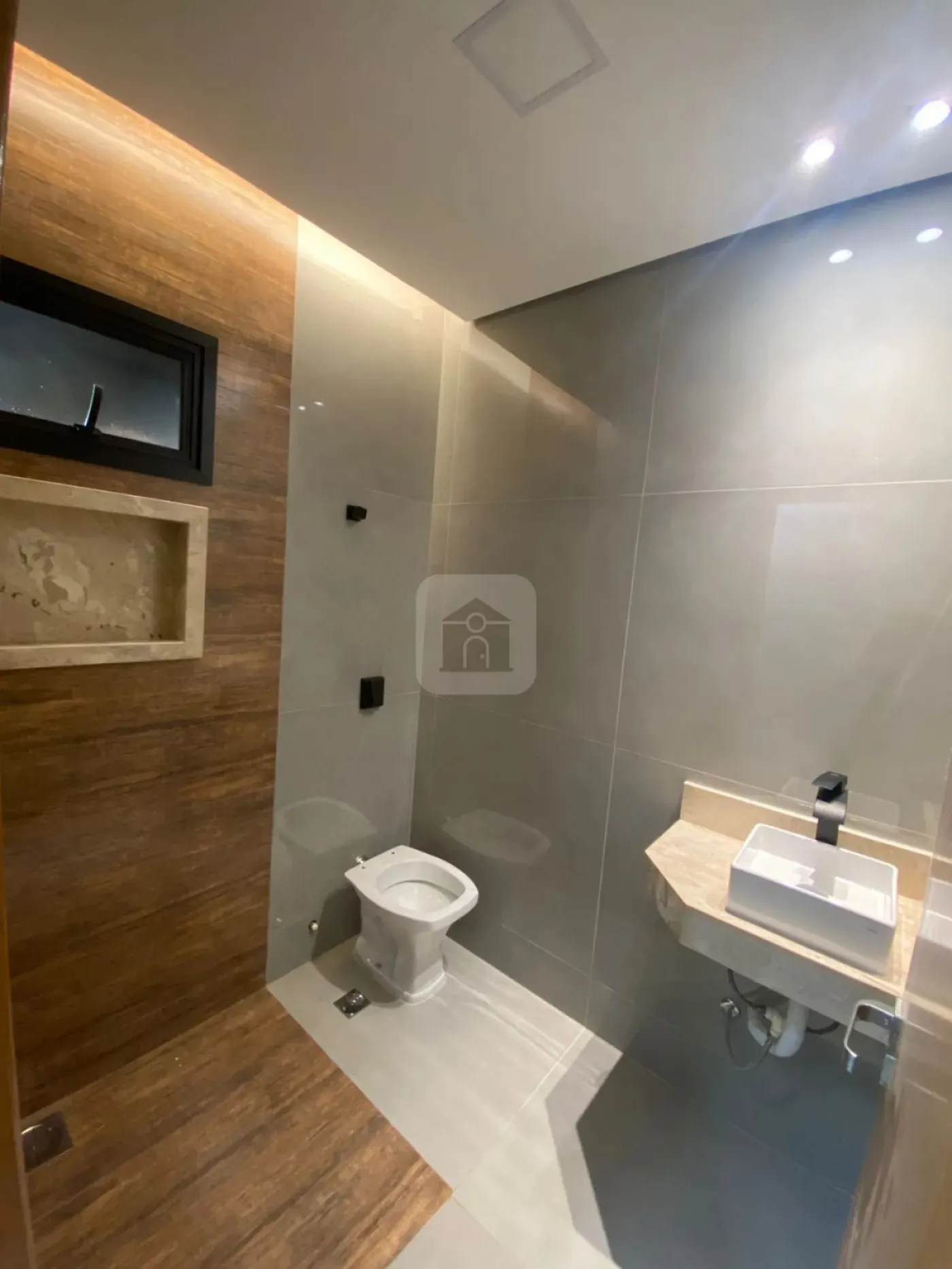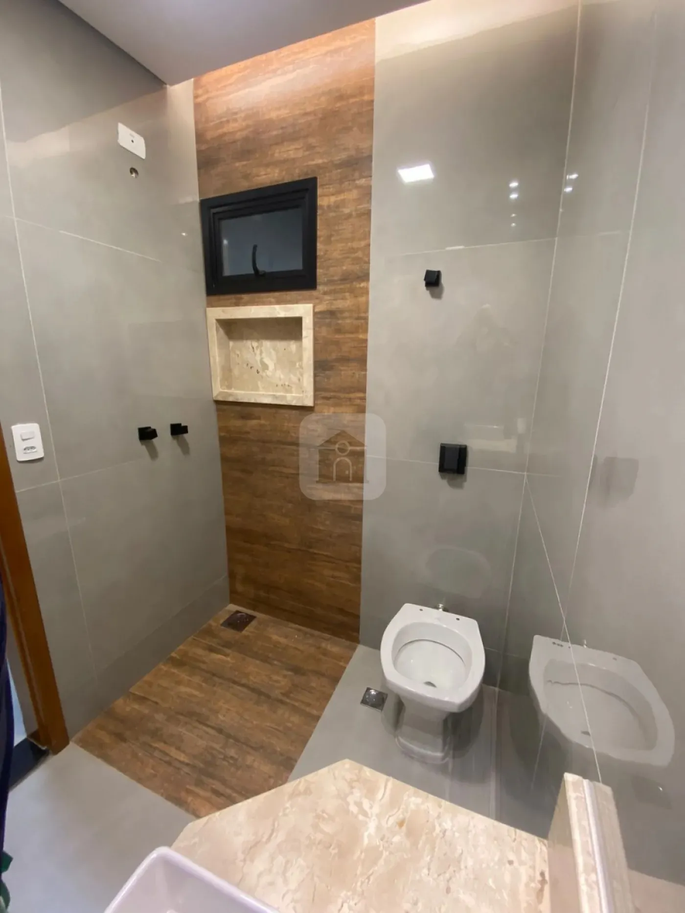 Nicho e pia em mármore Travertino em todos os banheiros, com cuba de sobrepor Deca.
