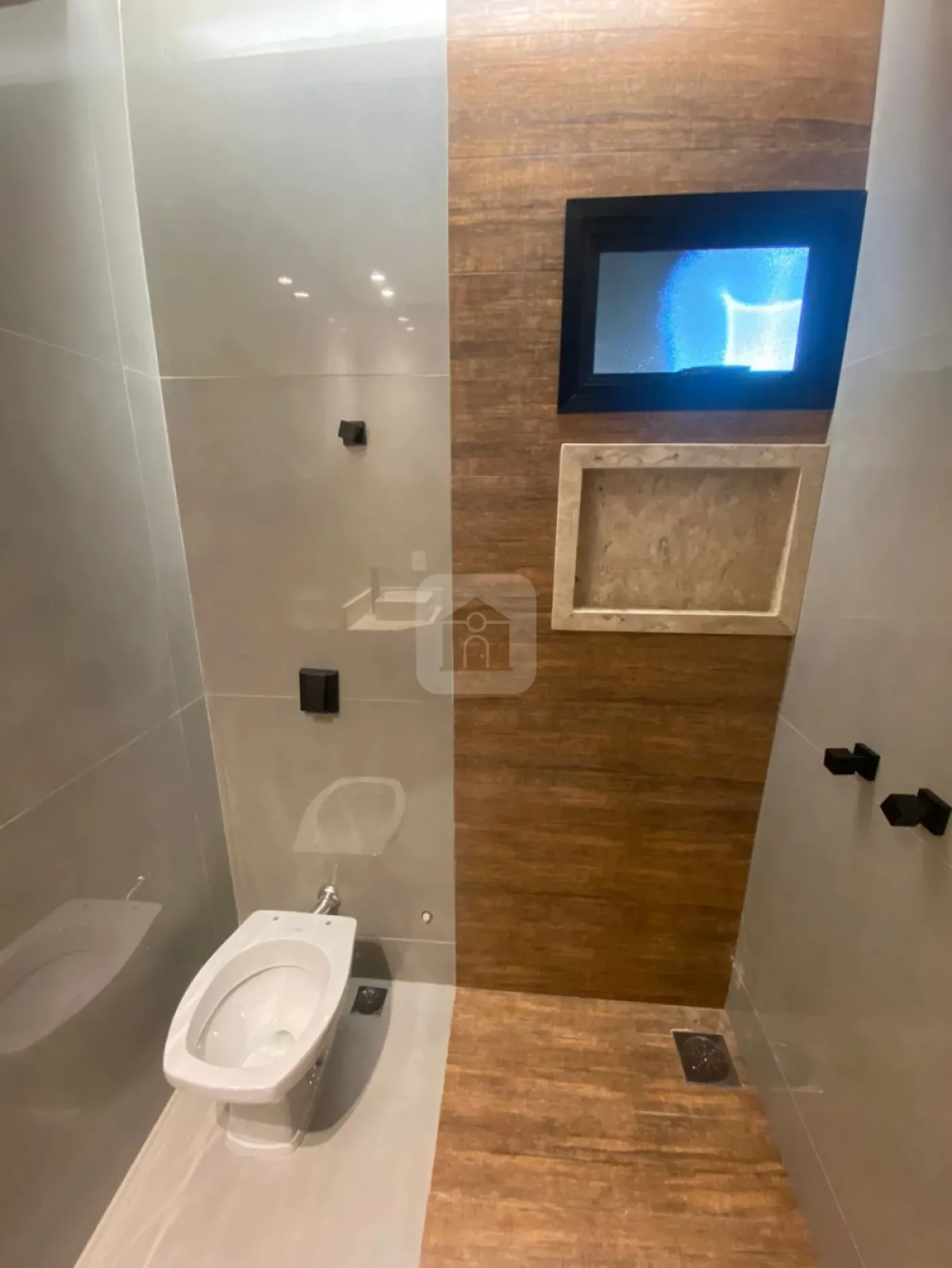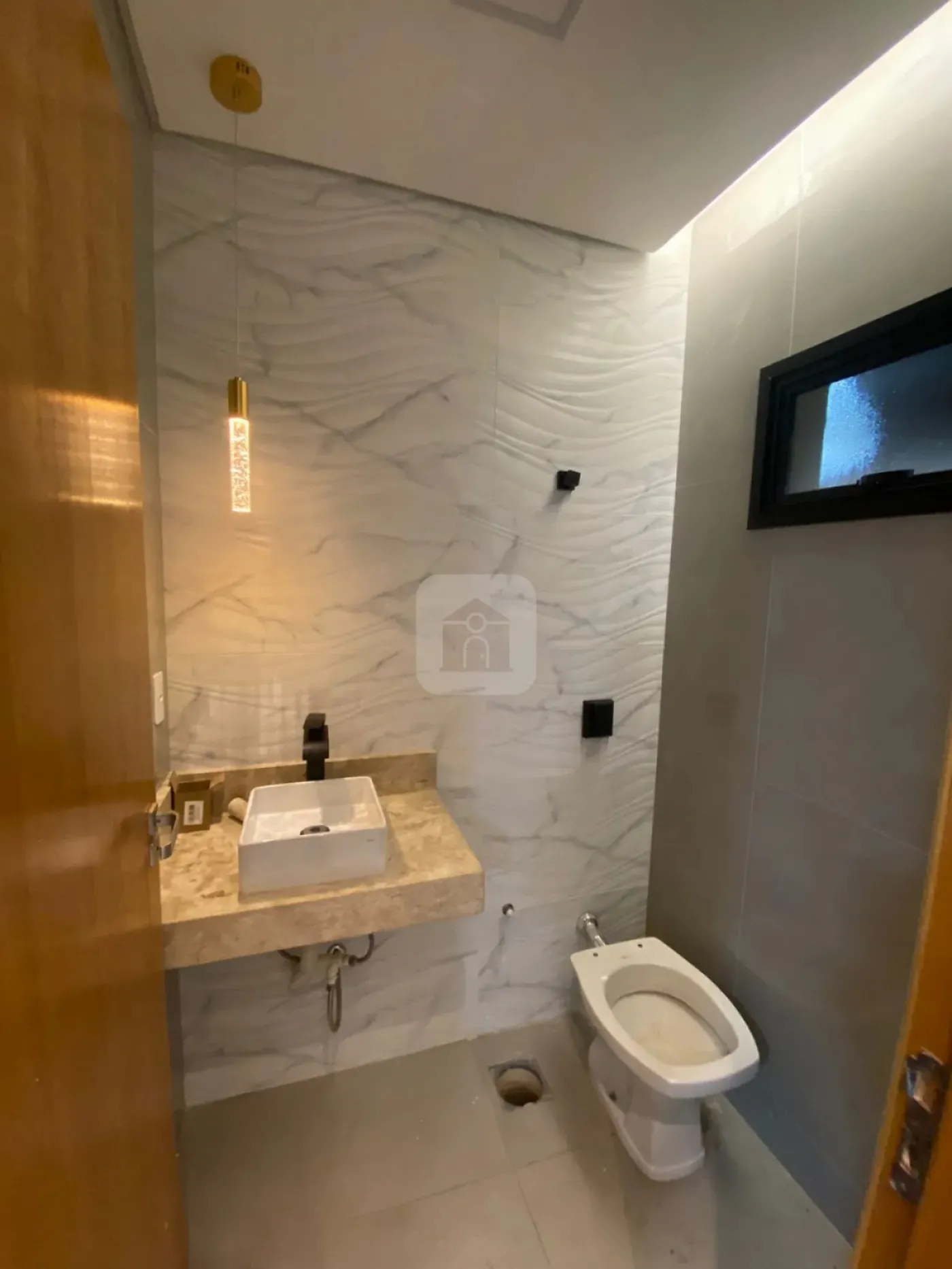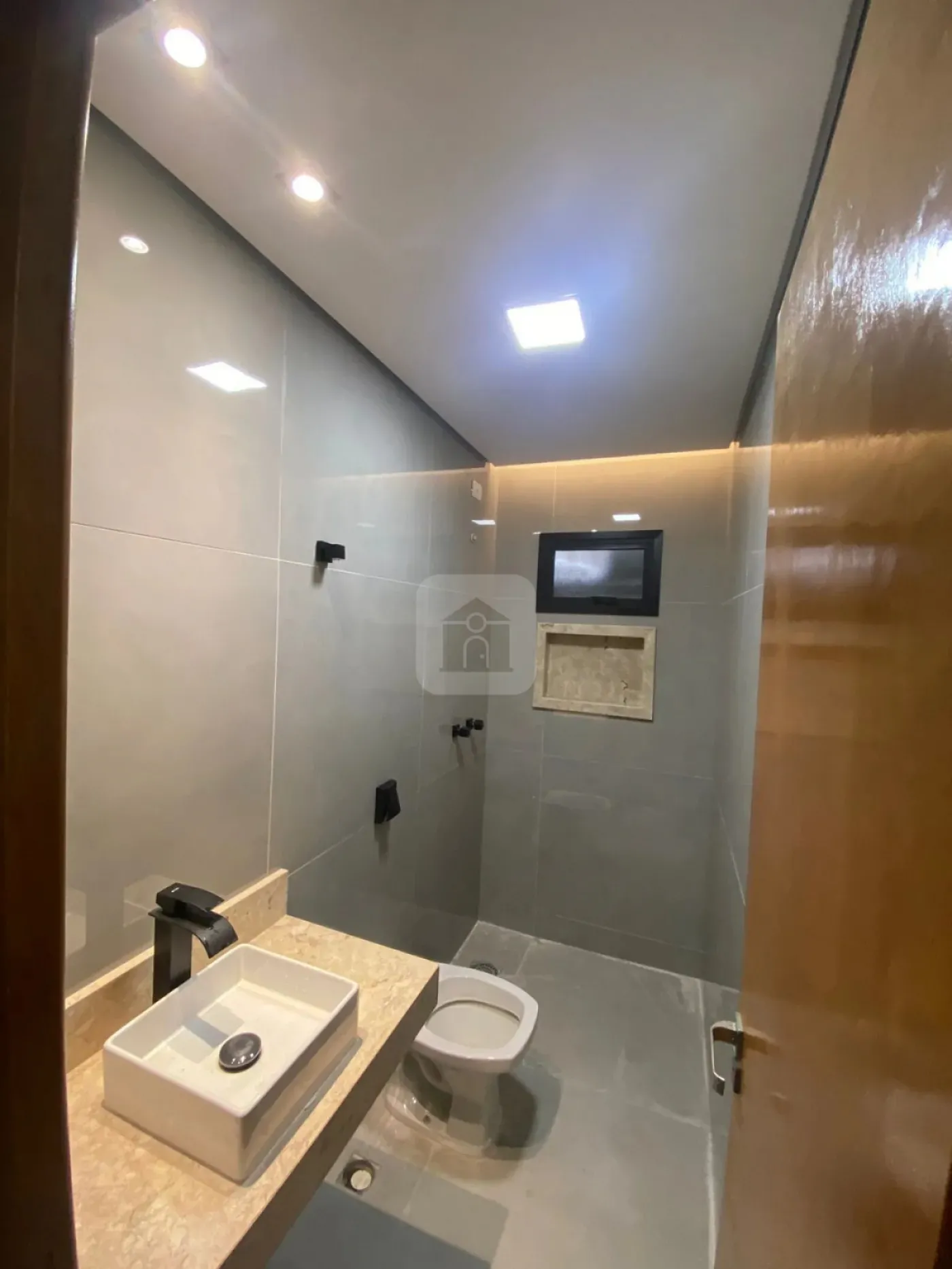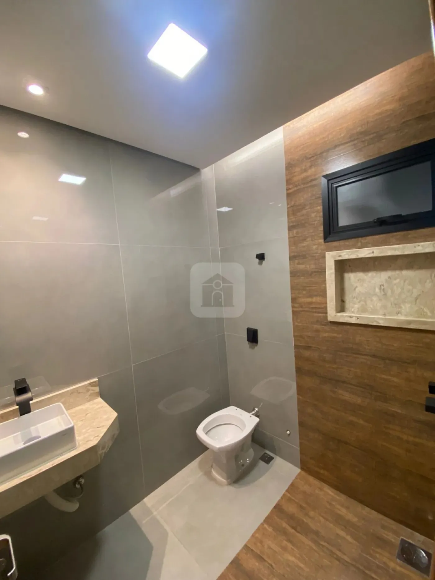 Nicho e pia em mármore Travertino em todos os banheiros, com cuba de sobrepor Deca.