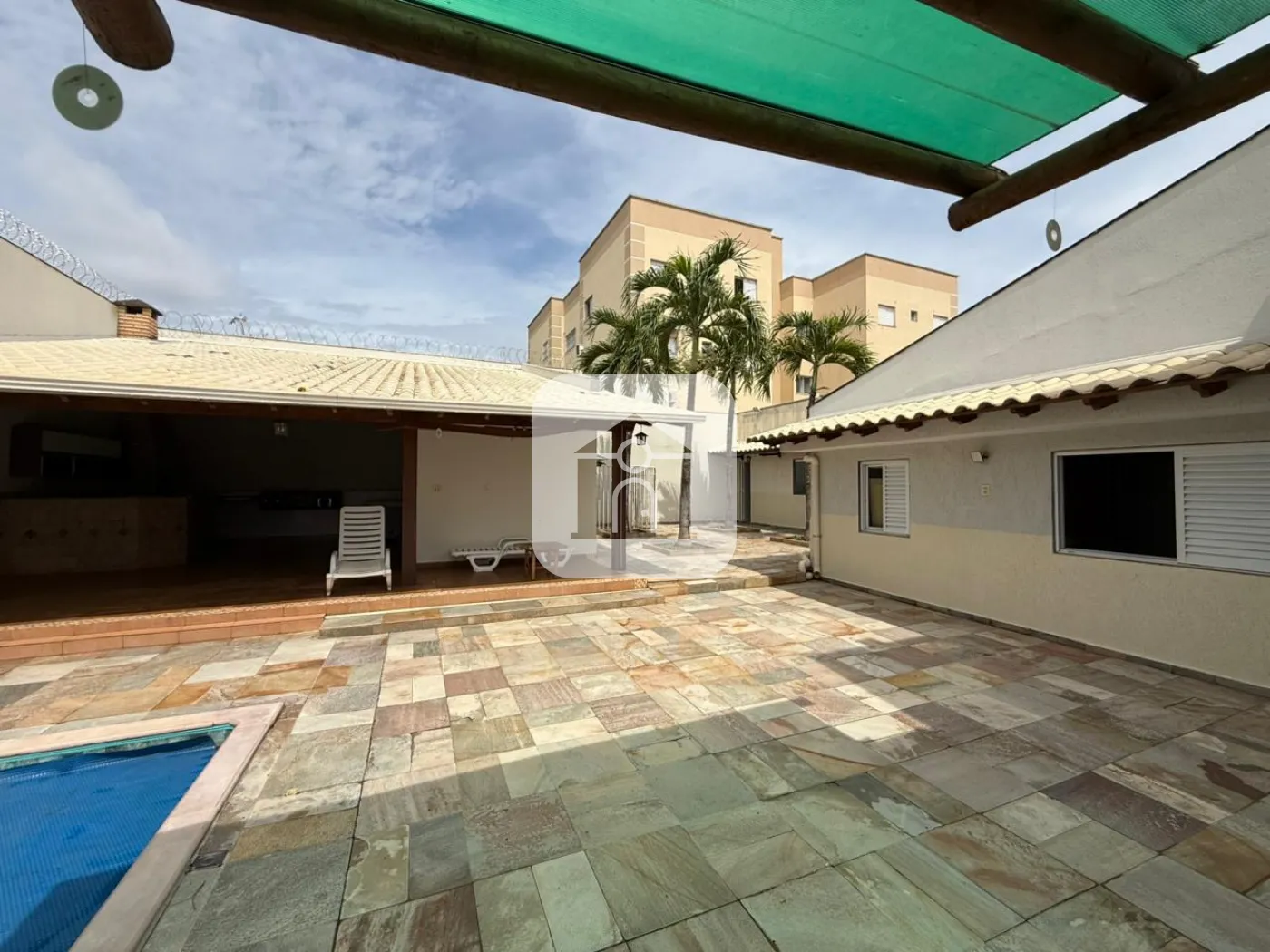 Janela ampla, tipo veneziana de alumínio, voltada para a piscina.