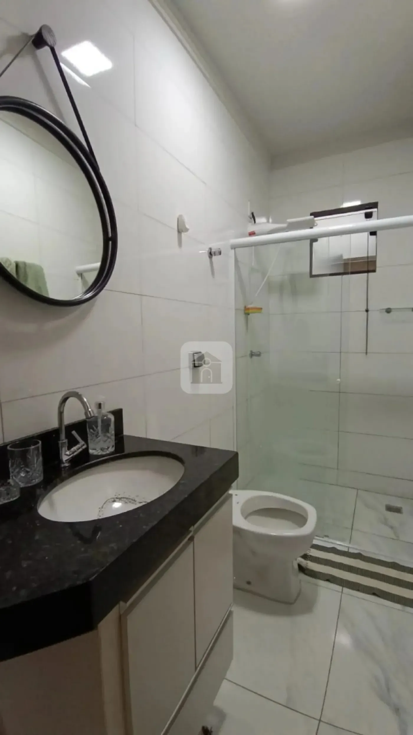 banheiro social com armário e box em blindex,