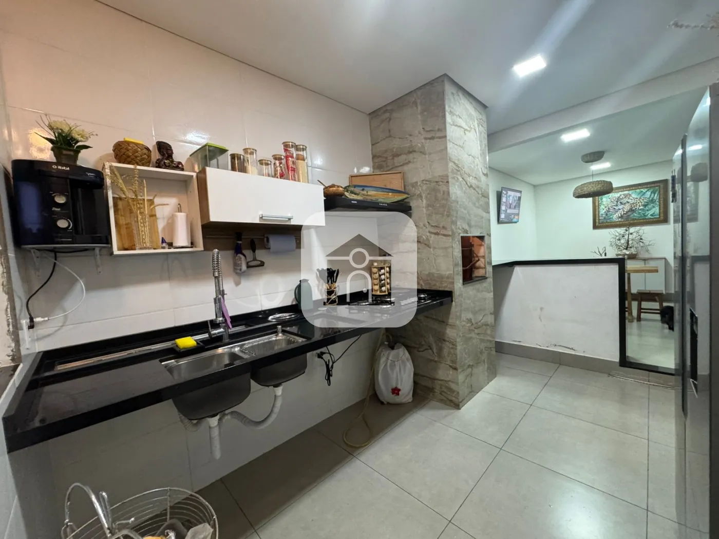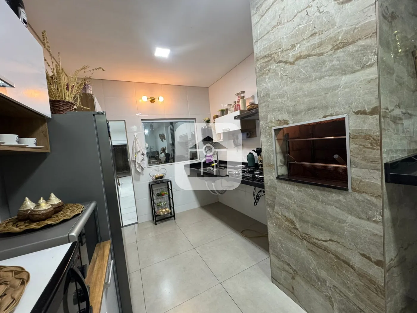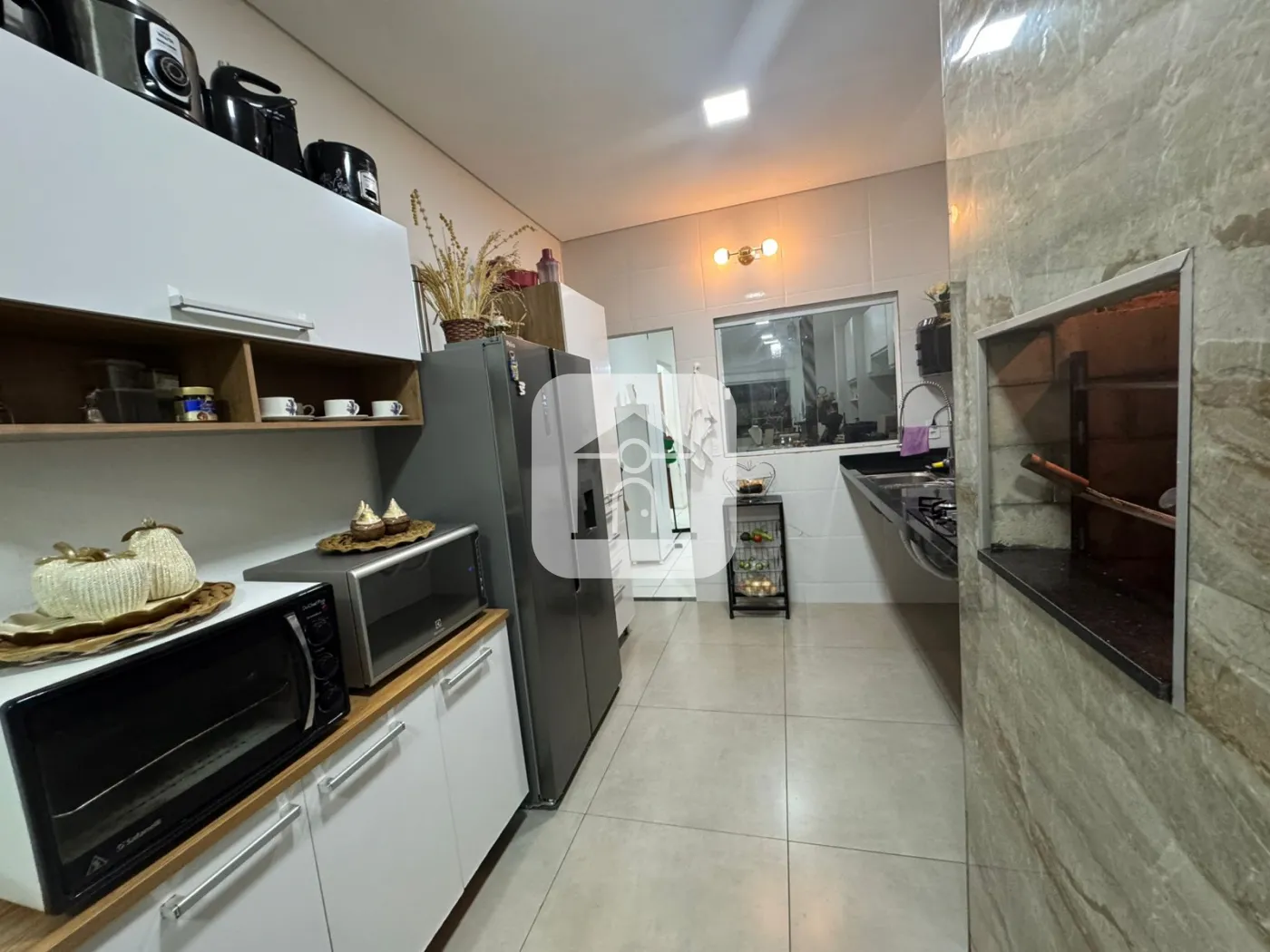 cozinha com área gourmet (churrasqueira) e sala de jantar integrada