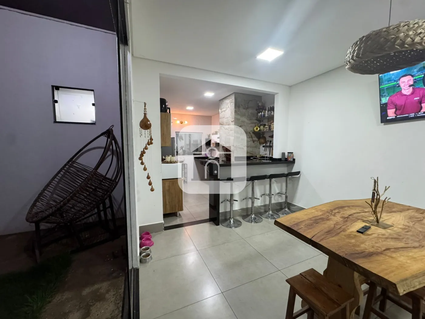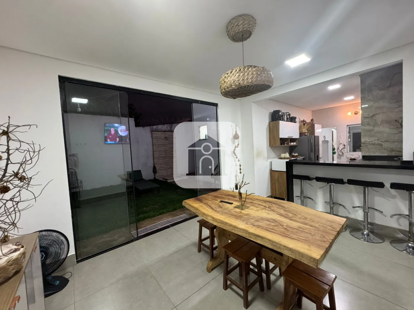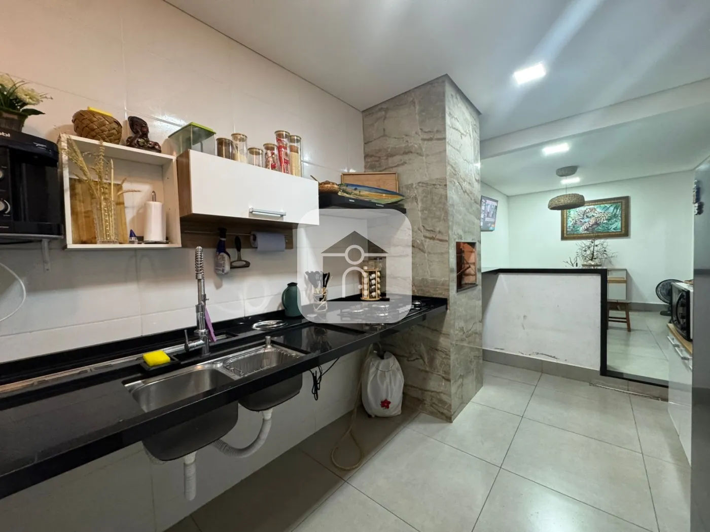 cozinha com área gourmet (churrasqueira) e sala de jantar integrada
