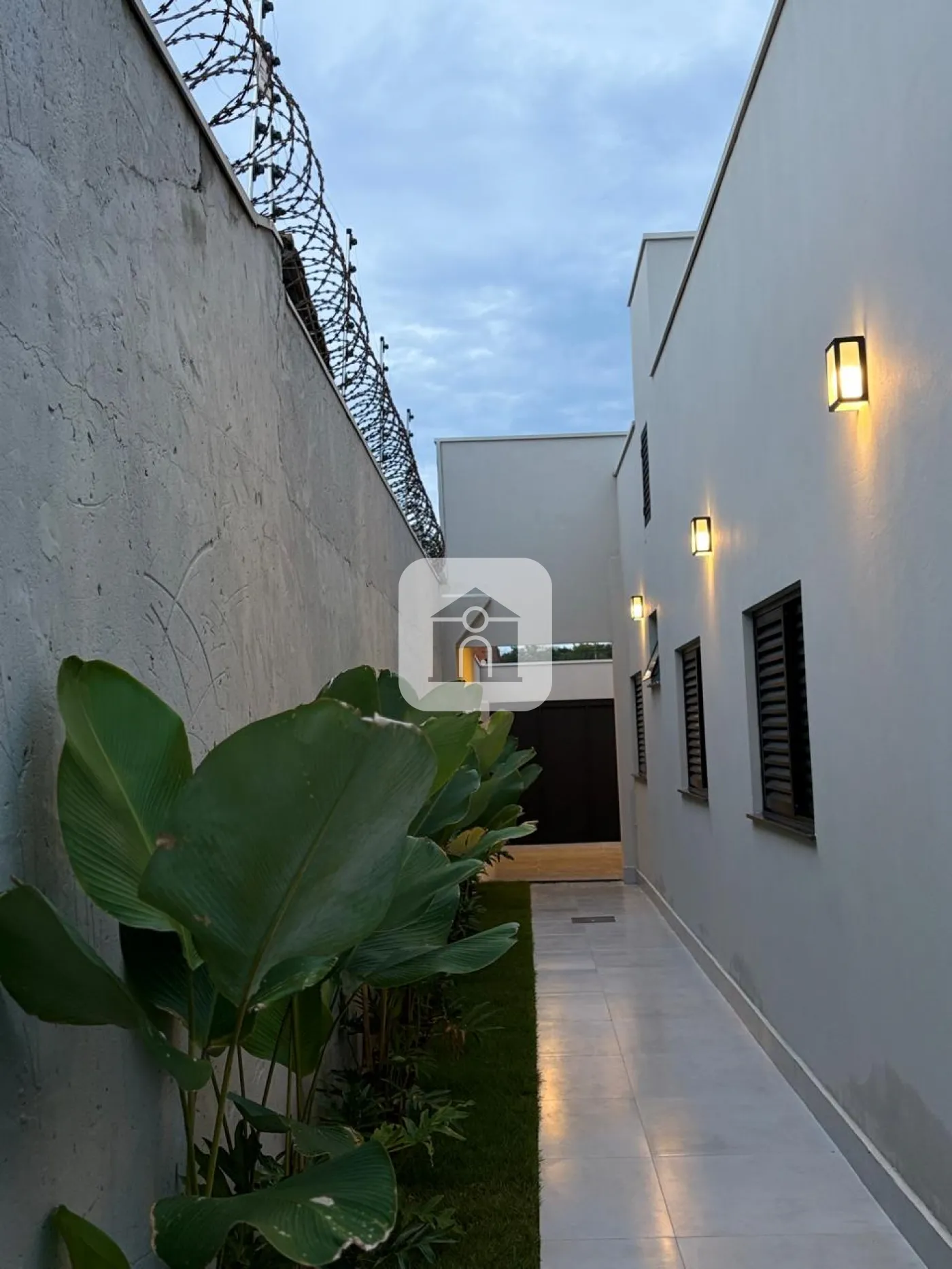 Portão da garagem em chapa 16, com 4 m de comprimento e motor JetFlex já instalado (abre e fecha em 3 segundos). Portão social 1,10x2,30m, com puxador em aço escovado.