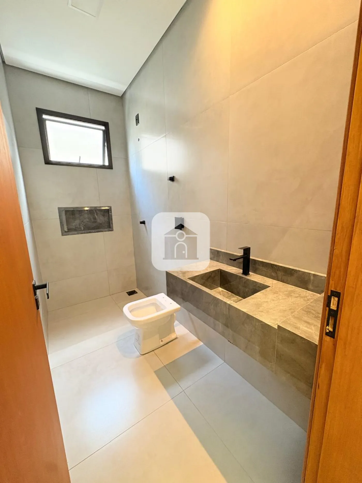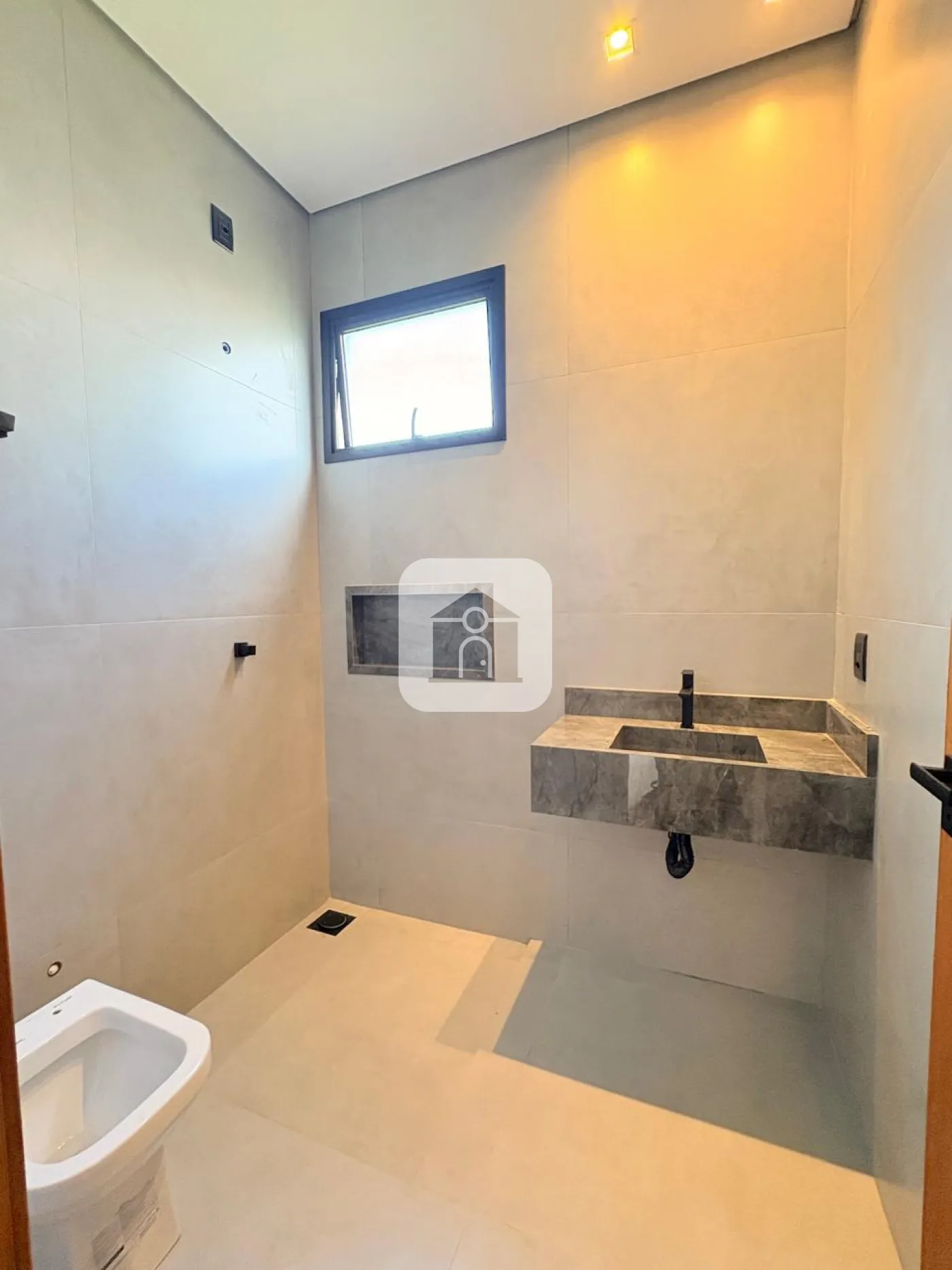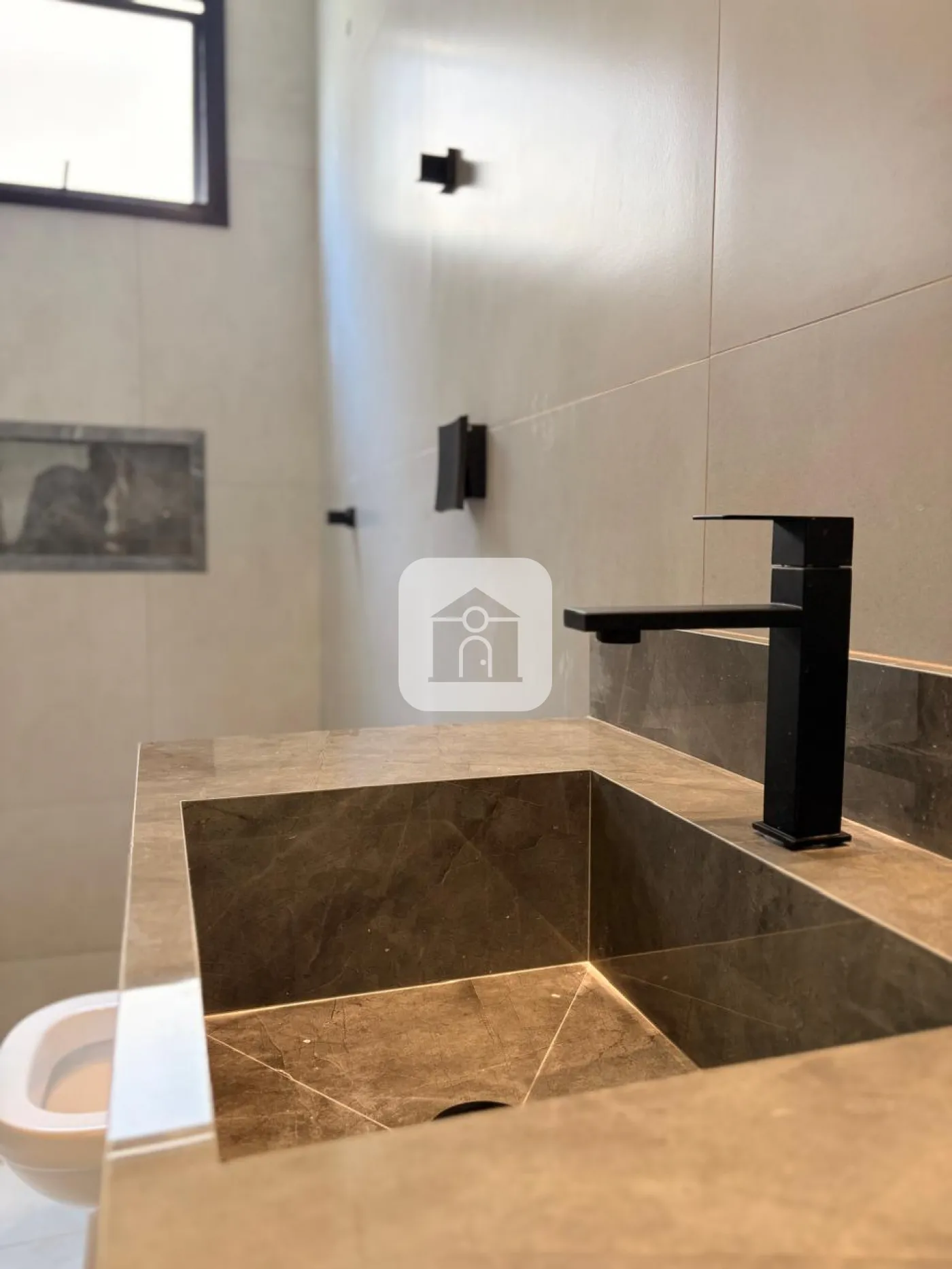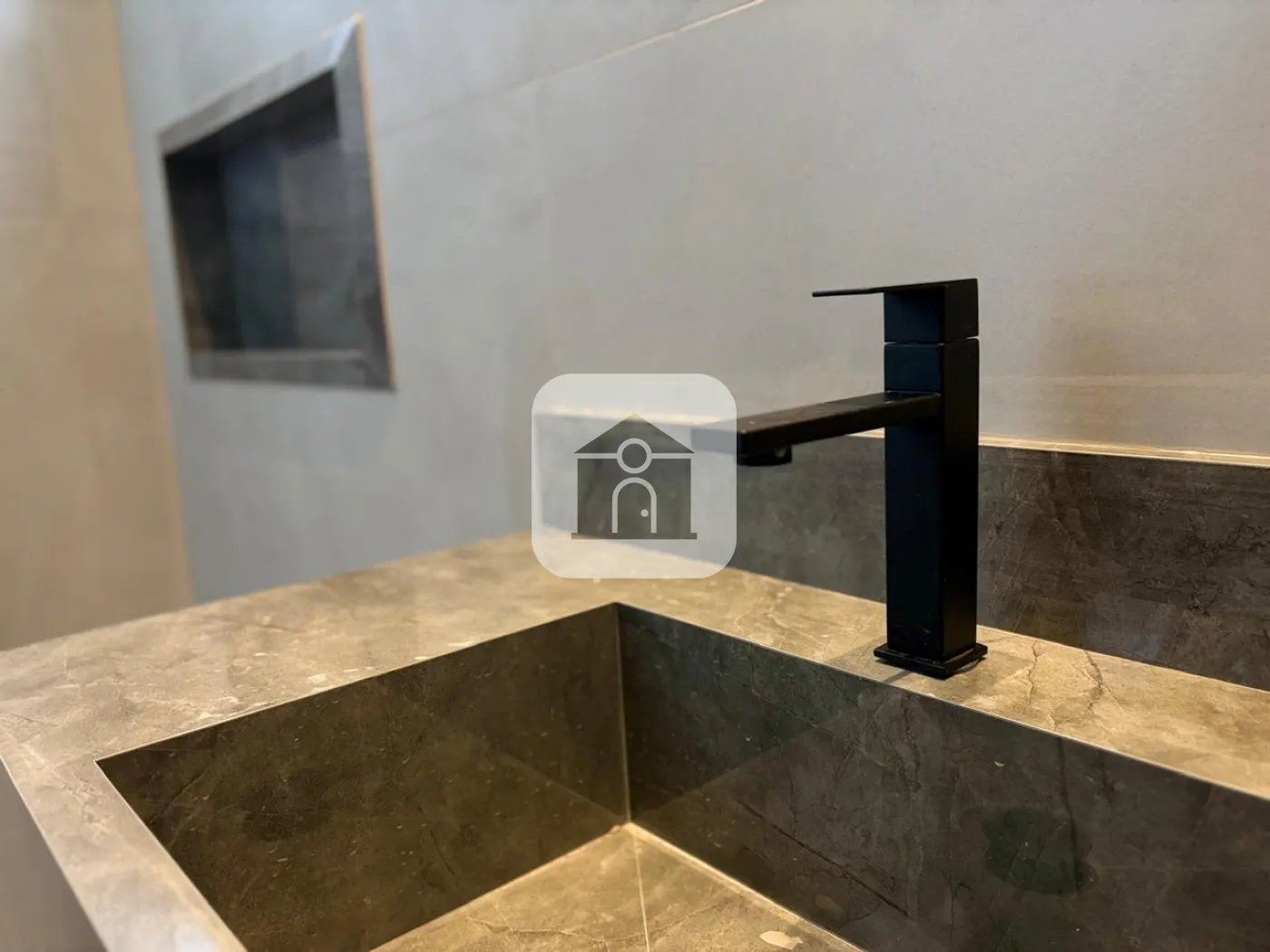 Nicho e pia em mármore Travertino em todos os banheiros, com cuba de sobrepor Deca.
