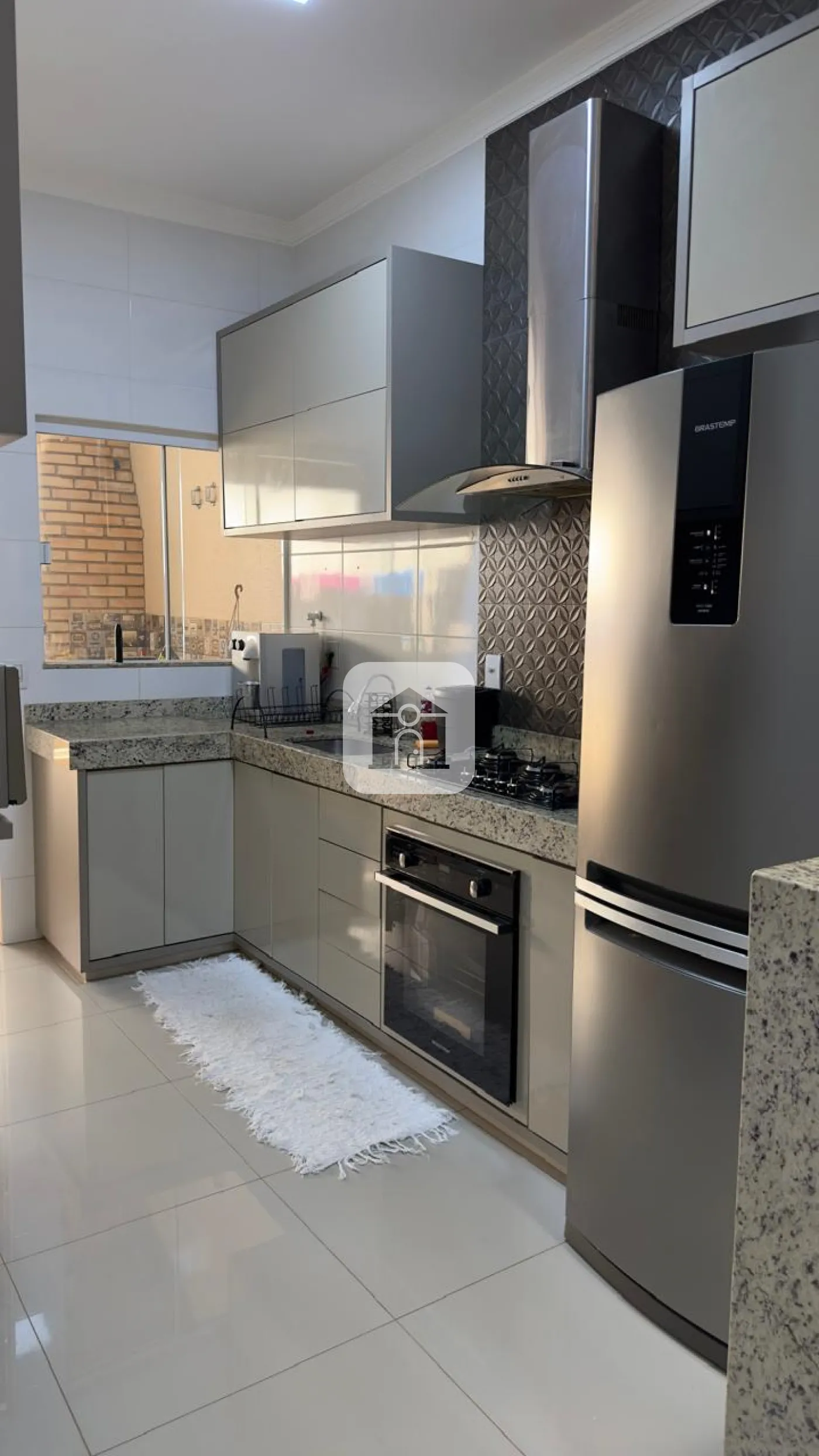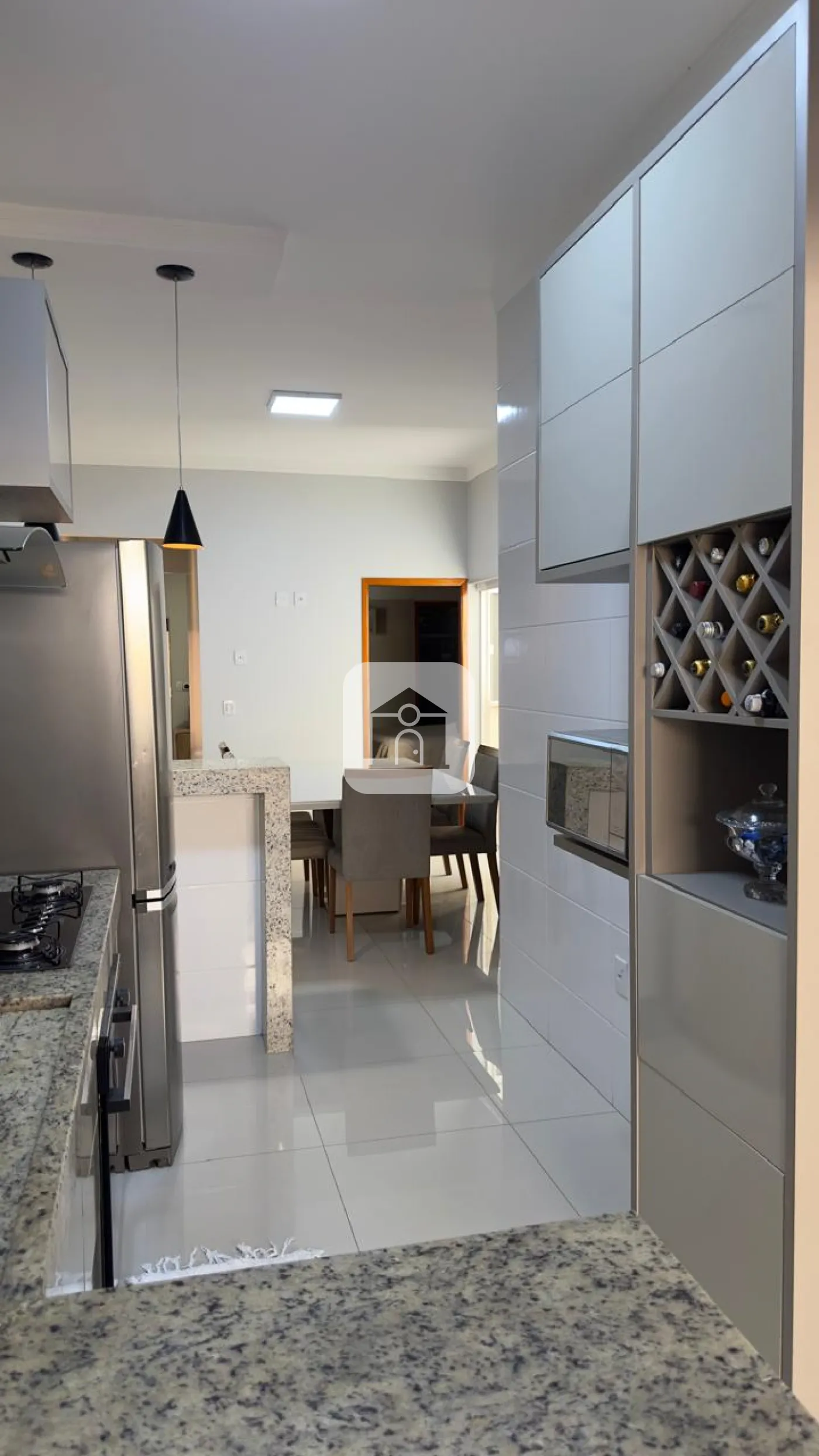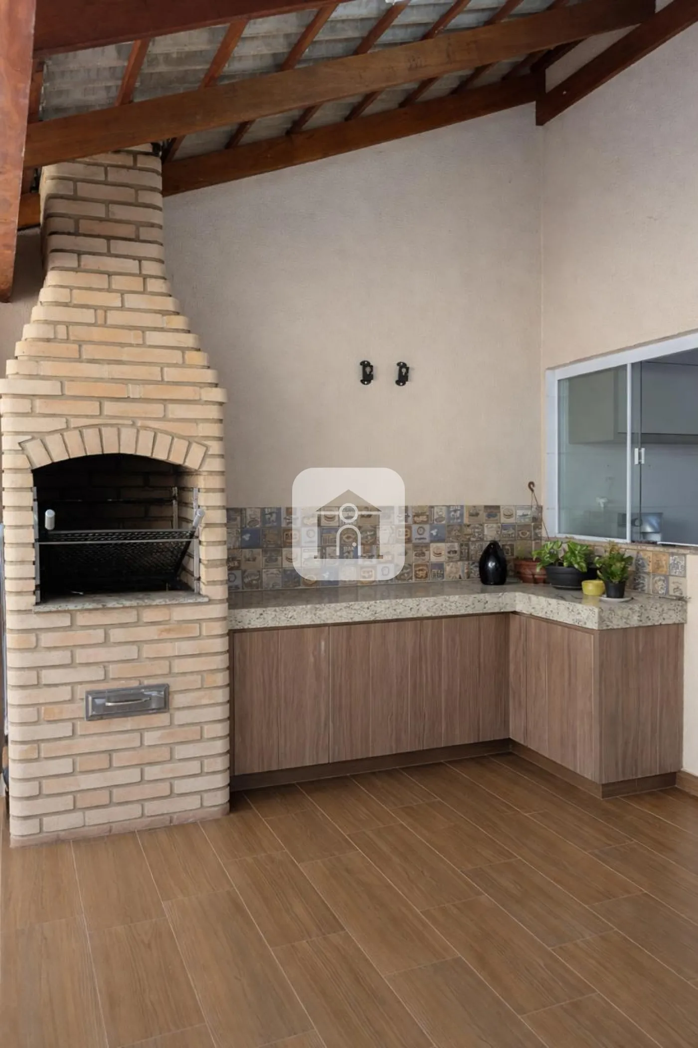 Porcelanato polido no interior e porcelanato amadeirado na frente e no fundo;