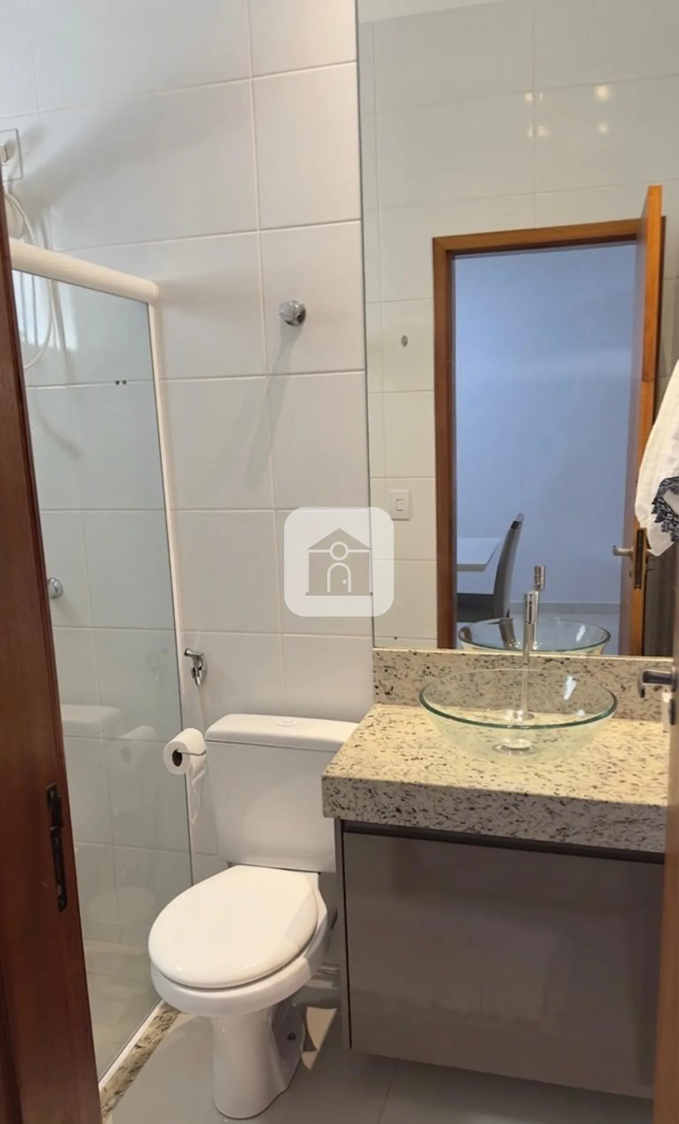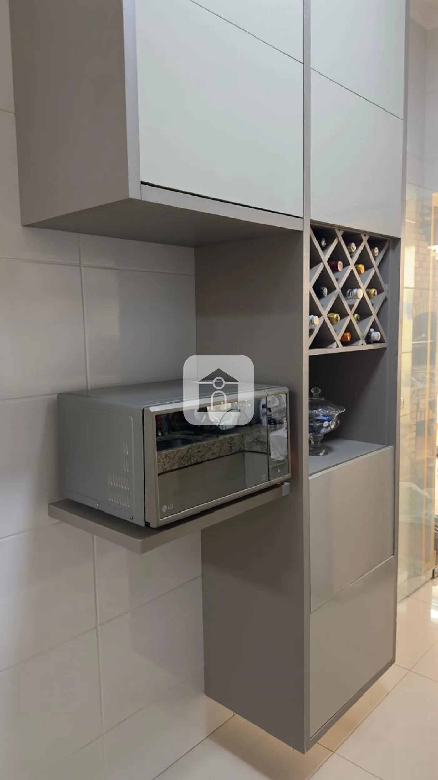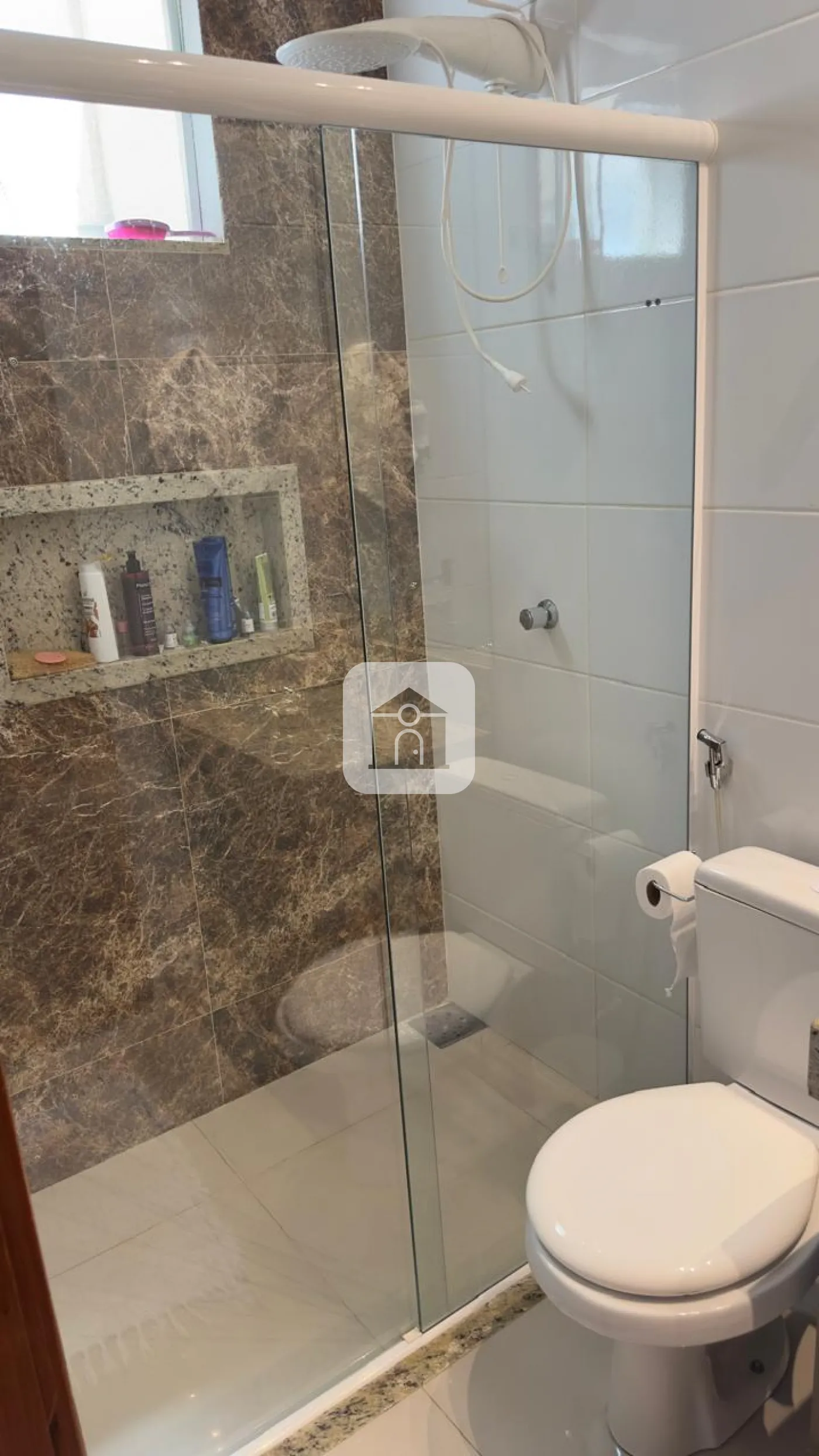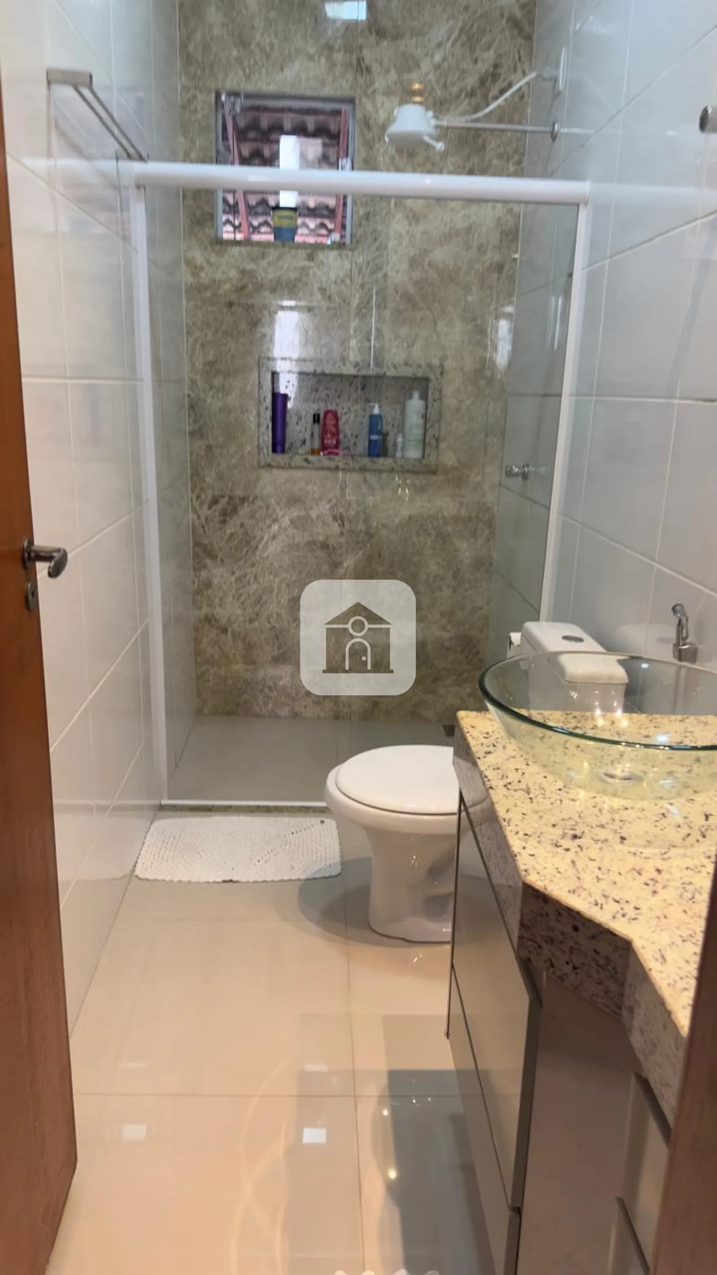 Porcelanato polido no interior e porcelanato amadeirado na frente e no fundo;