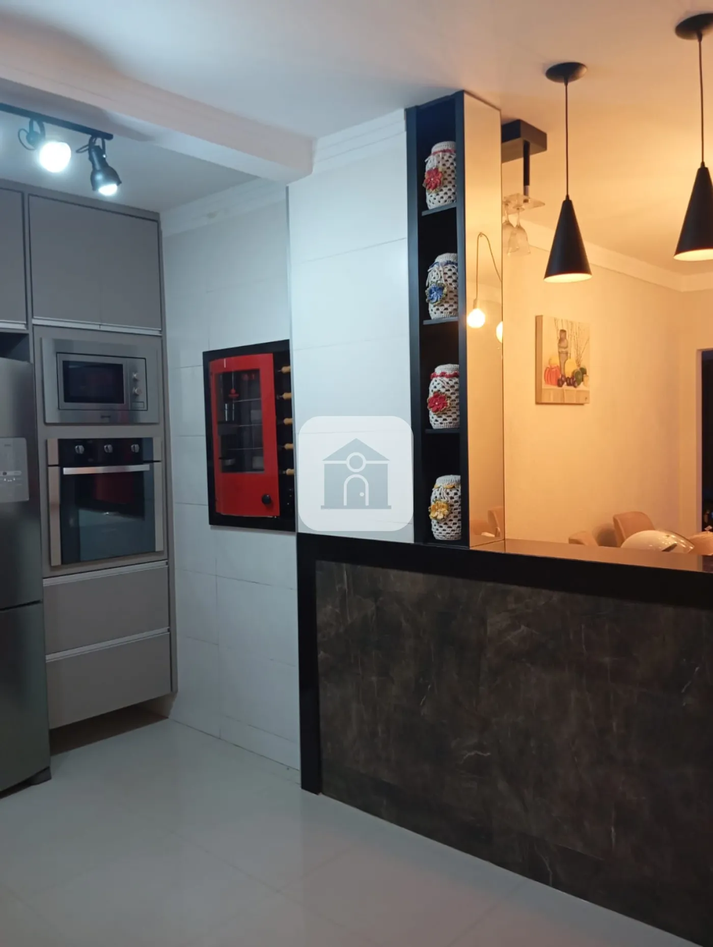 Área gourmet com bancada e ilha em granito.